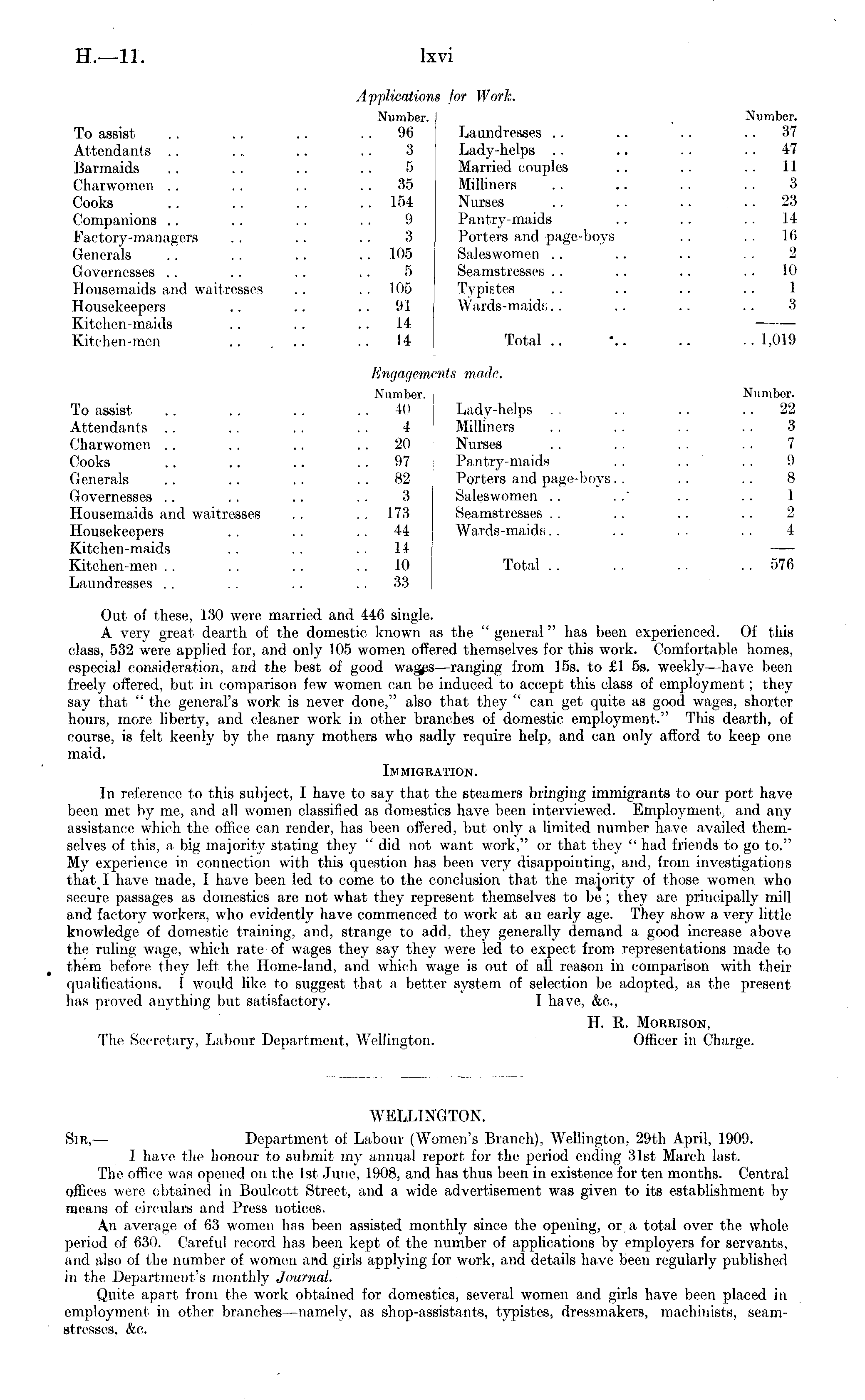 WELLINGTON. Sir, — Department of Labour (Women's Branch), Wellington; 29th April, 1909. I have the honour to submit my annual report for the period ending 31st March last. The office was opened on the Ist June, 1908, and has thus been in existence for ten months. Central oflices were obtained in Boulcott Street, and a wide advertisement was given to its establishment by means of circulars and Press notices. An average of 63 women has been assisted monthly since the opening, or a total over the whole period <>f 630. Careful record has been kept of the number of applications by employers for servants, and also of the number of women and girls applying for work, and details have been regularly published in the Department's monthly Journal. Quite apart from the work obtained for domestics, several women and girls have been placed in employment in other branches—namely, as shop-assistants, typistes, dressmakers, machinists, seamstresses, &c.
