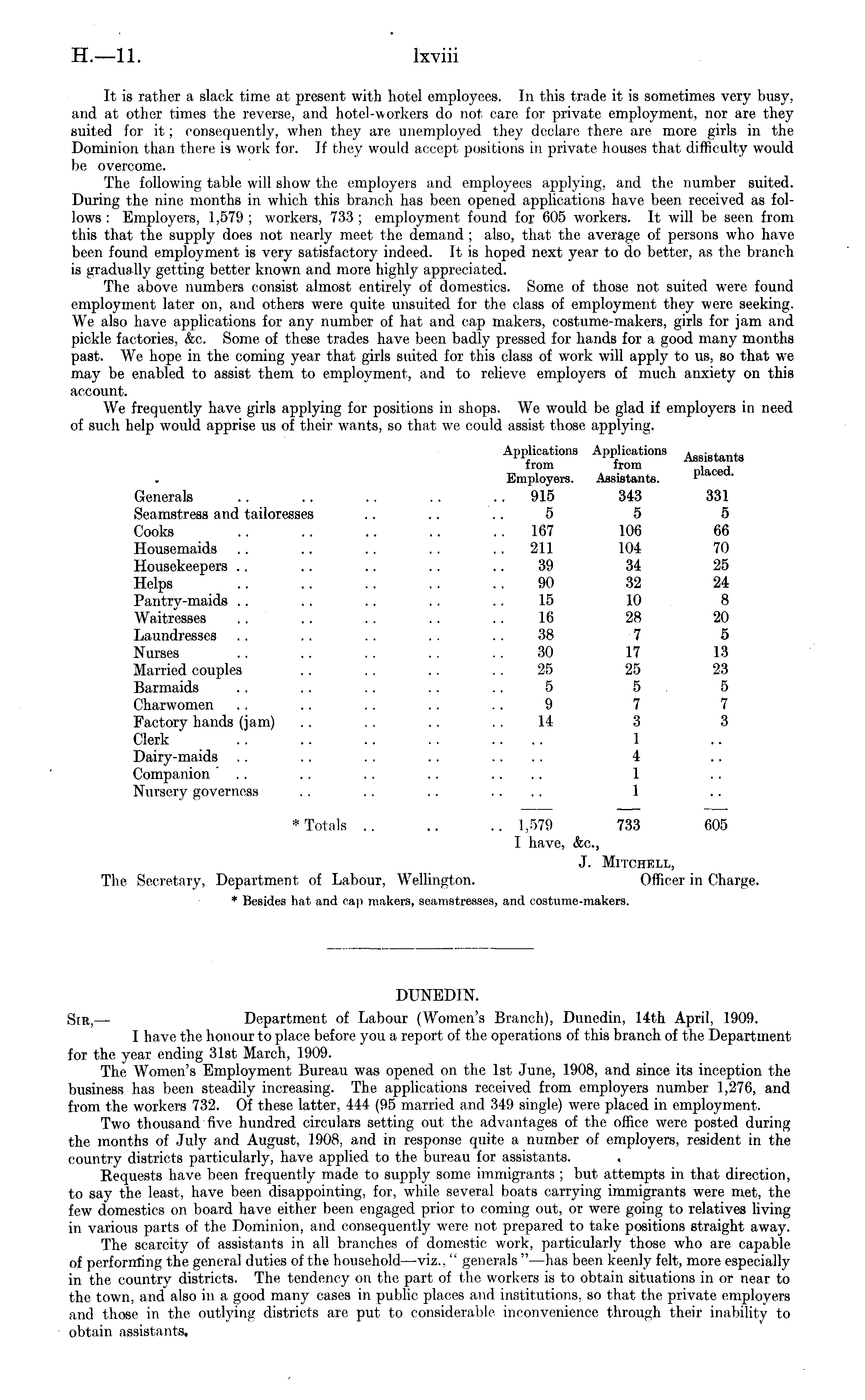 DUNEDIN. Sir, — Department of Labour (Women's Branch), Dunedin, 14th April, 1909. I have the honour to place before you a report of the operations of this branch of the Department for the year ending 31st March, 1909. The Women's Employment Bureau was opened on the Ist June, 1908, and since its inception the business has been steadily increasing. The applications received from employers number 1,276, and from the workers 732. Of these latter, 444 (95 married and 349 single) were placed in employment. Two thousand five hundred circulars setting out the advantages of the office were posted during the months of July and August, 1908, and in response quite a number of employers, resident in the country districts particularly, have applied to the, bureau for assistants. Requests have been frequently made to supply some immigrants ; but attempts in that direction, to say the least, have been disappointing, for, while several boats carrying immigrants were met, the few domestics on board have either been engaged prior to coming out, or were going to relatives living in various parts of the Dominion, and consequently were not prepared to take positions straight away. The scarcity of assistants in all branches of domestic work, particularly those who are capable of performing the general duties of the household—viz.. " generals "—has been keenly felt, more especially in the country districts. The tendency on the part of the workers is to obtain situations in or near to the town, and also in a good many cases in public places and institutions, so that the private employers and those in the outlying districts are put to considerable inconvenience through their inability to obtain assistants.