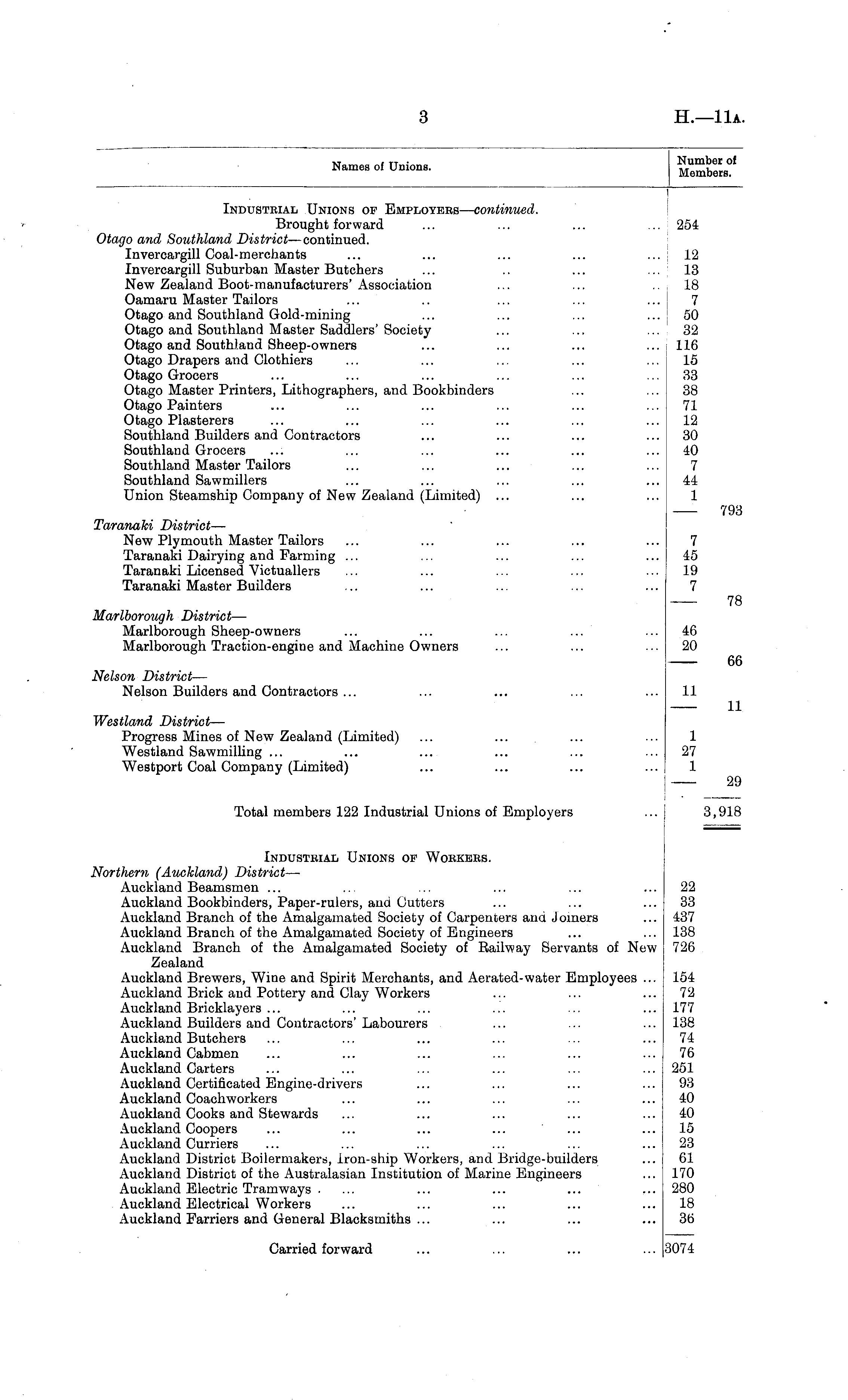 Names of Unions. Number of Members. Industrial Unions op Employers— continued. Brought forward ... ... ... ... 254 Otago and Southland District —continued. Invercargill Coal-merchants ... ... ... ... ... 12 Invercargill Suburban Master Butchers ... .. ... ... 13 New Zealand Boot-manufacturers'Association ... ... 18 Oamaru Master Tailors ... .. ... ... ... : 7 Otago and Southland Gold-mining ... ... ... ... 50 Otago and Southland Master Saddlers' Society ... ... ... 32 Otago and Southland Sheep-owners ... ... ... ... 116 Otago Drapers and Clothiers ... ... ... ... ... 15 Otago Grocers ... ... ... ... ... ... 33 Otago Master Printers, Lithographers, and Bookbinders ... ... 38 Otago Painters ... ... ... ... ... ... 71 Otago Plasterers ... ... ... ... ... ... 12 Southland Builders and Contractors ... ... ... ... 30 Southland Grocers ... ... ... ... ... ... 40 Southland Master Tailors ... ... ... ... ... 7 Southland Sawmillers ... ... ... ... ... 44 Union Steamship Company of New Zealand (Limited) ... ... ... 1 793 Taranaki District — New Plymouth Master Tailors ... ... ... ... ... 7 Taranaki Dairying and Farming ... ... ... ... ... 45 Taranaki Licensed Victuallers ... ... ... ... ... 19 Taranaki Master Builders ... ... ... ... ... 7 78 Marlborough District — Marlborough Sheep-owners ... ... ... ... ... 46 Marlborough Traction-engine and Machine Owners ... ... ... 20 66 Nelson District — Nelson Builders and Contractors ... ... ... ... ... 11 11 Westland District — Progress Mines of New Zealand (Limited) ... ... ... ... 1 Westland Sawmilling ... ... ... ... ... ... 27 Westport Coal Company (Limited) ... ... ... ... 1 29 Total members 122 Industrial Unions of Employers 3,918 Industrial Unions of Workers. Northern (Auckland) District — Auckland Beamsmen ... ... ... ... ... ... 22 Auckland Bookbinders, Paper-rulers, and Cutters ... ... ... 33 Auckland Branch of the Amalgamated Society of Carpenters and Joiners ... 437 Auckland Branch of the Amalgamated Society of Engineers ... ... 138 Auckland Branch of the Amalgamated Society of Railway Servants of New 726 Zealand Auckland Brewers, Wine and Spirit Merchants, and Aerated-water Employees ... 154 Auckland Brick and Pottery and Clay Workers ... ... ... 72 Auckland Bricklayers ... ... ... ... ... ... 177 Auckland Builders and Contractors' Labourers ... ... ... 138 Auckland Butchers ... ... ... ... ... ... 74 Auckland Cabmen ... ... ... ... ... ... 76 Auckland Carters ... ... ... ... ... ... 251 Auckland Certificated Engine-drivers ... ... ... ... 93 Auckland Coachworkers ... ... ... ... ... 40 Auckland Cooks and Stewards ... ... ... ... ... 40 Auckland Coopers ... ... ... ... ... ... 15 Auckland Curriers ... ... ... ... ... ... 23 Auckland District Boilermakers, Iron-ship Workers, and Bridge-builders ... 61 Auckland District of the Australasian Institution of Marine Engineers ... 170 Auckland Electric Tramways .... ... ... ... ... 280 Auckland Electrical Workers ... ... ... ... ... 18 Auckland Farriers and General Blacksmiths ... ... ... ... 36 Carried forward ... ... ... ... 3074