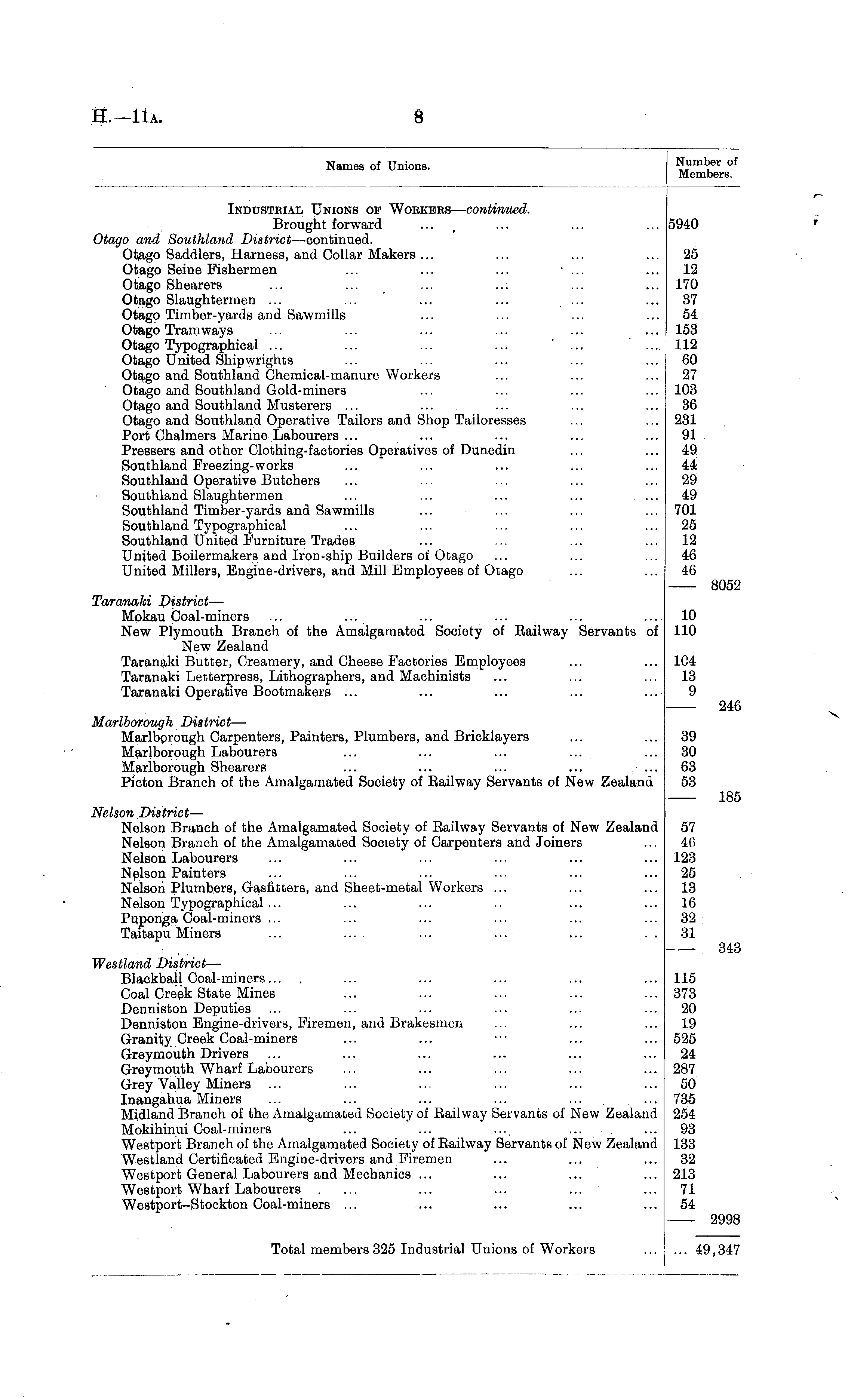 Names of Unions. Number o: Members. Industrial Unions op Workers— continued. Brought forward ••• . Otago and Southland District —continued. Otago Saddlers, Harness, and Collar Makers ... Otago Seine Fishermen ... ... ... ■ ... Otago Shearers Otago Slaughtermen ... ... ... ... ... Otago Timber-yards and Sawmills Otago Tramways Otago Typographical ... Otago United Shipwrights Otago and Southland Chemical-manure Workers Otago and Southland Gold-miners Otago and Southland Musterers ... Otago and Southland Operative Tailors and Shop Tailoresses Port Chalmers Marine Labourers ... Pressers and other Clothing-factories Operatives of Dunedin Southland Freezing-works Southland Operative Butchers Southland Slaughtermen Southland Timber-yards and Sawmills Southland Typographical Southland United Furniture Trades United Boilermakers and Iron-ship Builders of Otago United Millers, Engine-drivers, and Mill Employees of Otago 5940 25 12 170 37 54 153 112 60 27 103 36 231 91 49 44 29 49 701 25 12 46 46 Taranaki District — Mokau Coal-miners New Plymouth Branch of the Amalgamated Society of Railway Servants of New Zealand Taranaki Butter, Creamery, and Cheese Factories Employees Taranaki Letterpress, Lithographers, and Machinists Taranaki Operative Bootmakers ... 8052 10 110 104 13 9 Marlborough District — Marlborough Carpenters, Painters, Plumbers, and Bricklayers Marlborough Labourers Marlborough Shearers Picton Branch of the Amalgamated Society of Railway Servants of New Zealand 246 39 30 63 53 Nelson District — Nelson Branch of the Amalgamated Society of Railway Servants of New Zealand Nelson Branch of the Amalgamated Society of Carpenters and Joiners Nelson Labourers Nelson Painters Nelson Plumbers, Gasfitters, and Sheet-metal Workers ... Nelson Typographical ... Puponga Coal-miners ... Taitapu Miners ... ... 185 57 46 123 25 13 16 32 31 343 Westland District — Blackball Coal-miners.... Coal Creek State Mines Denniston Deputies Denniston Engine-drivers, Firemen, and Brakesmen Granity Creek Coal-miners Greymouth Drivers Greymouth Wharf Labourers Grey Valley Miners Inangahua Miners Midland Branch of the Amalgamated Society of Railway Servants of New Zealand Mokihinui Coal-miners Westport Branch of the Amalgamated Society of Railway Servants of New Zealand Westland Certificated Engine-drivers and Firemen Westport General Labourers and Mechanics ... Westport Wharf Labourers .... Westport-Stockton Coal-miners ... 115 373 20 19 525 24 287 50 735 254 93 133 32 213 71 54 2998 Total members 325 Industrial Unions of Workers ... 49,347