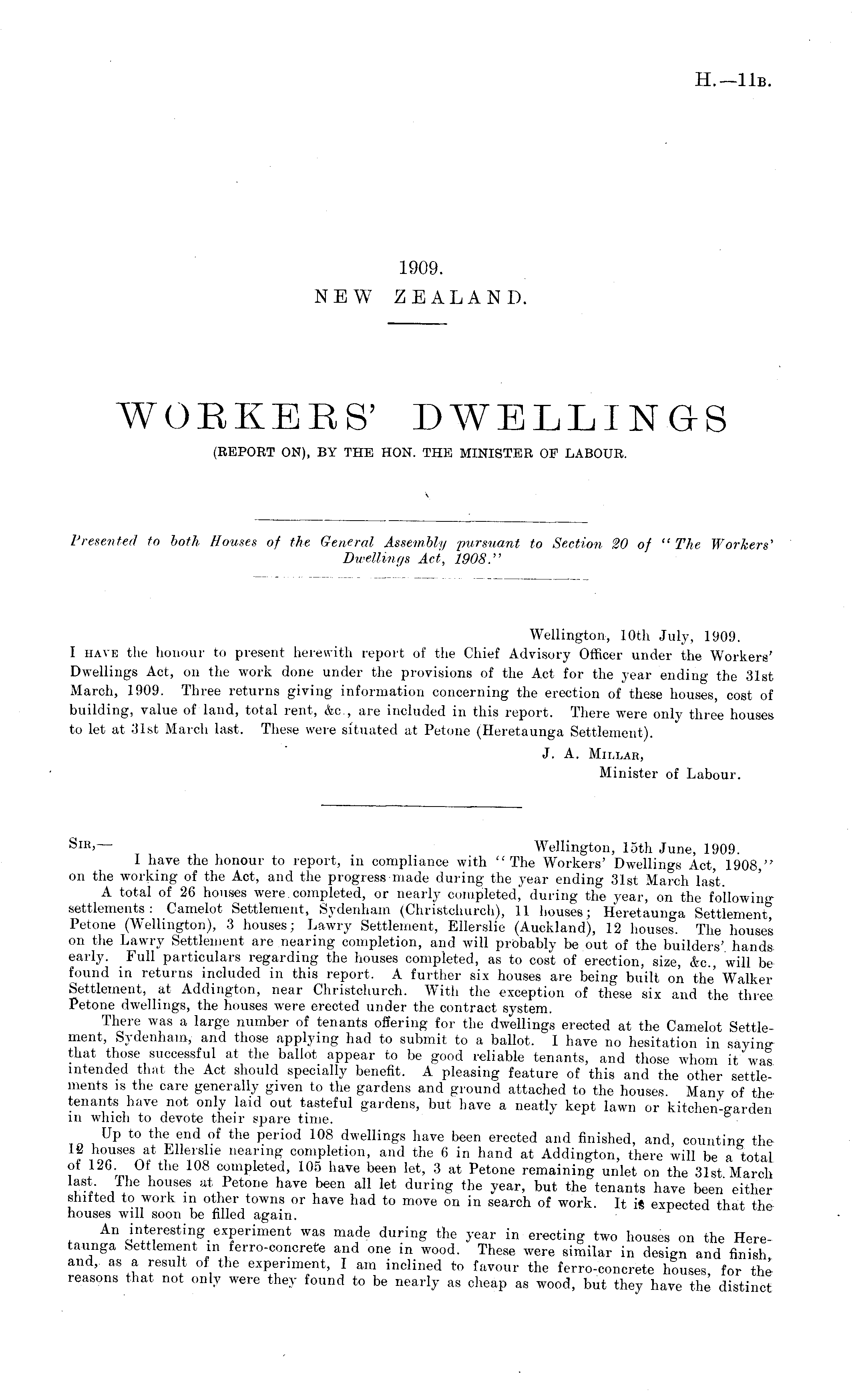 Siß,— Wellington, 15th June, 1909. I have the honour to report, in compliance with "The Workers' Dwellings Act, 1908," on the working of the Act, and the progress made during the year ending 31st March last. A total of 26 houses were.completed, or nearly completed, during the year, on the followingsettlements: Camelot Settlement, Sydenham (Christchurch), 11 houses; Heretaunga Settlement, Petone (Wellington), 3 houses; Lawry Settlement, Ellerslie (Auckland), 12 houses. The houses on the Lawry Settlement are nearing completion, and will probably be out of the builders' hands early. Full particulars regarding the houses completed, as to cost of erection, size, &c, will be found in returns included in this report. A further six houses are being built on the Walker Settlement, at Addington, near Christchurch. With the exception of these six and the three Petone dwellings, the houses were erected under the contract system. There was a large number of tenants offering for the dwellings erected at the Camelot Settlement, Sydenham, and those applying had to submit to a ballot. I have no hesitation in sayingthat those successful at the ballot appear to be good reliable tenants, and those whom it was intended that the Act should specially benefit. A pleasing feature of this and the other settlements is the care generally given to the gardens and ground attached to the houses Many of thetenants have not only laid out tasteful gardens, but have a neatly kept lawn or kitchen-garden in which to devote their spare time. Up to the end of the period 108 dwellings have been erected and finished, and counting the 12 houses at Ellerslie nearing completion, and the 6 in hand at Addington, there will be a total of 126. Of the 108 completed, 105 have been let, 3at Petone remaining unlet on the 31st March last The houses at Petone have been all let during the year, but the tenants have been either shitted to work in other towns or have had to move on in search of work. It is expected that the houses will soon be filled again. An interesting experiment was made during the year in erecting two houses on the Heretaunga Settlement m ferro-concrete and one in wood. These were similar in design and finish and, as a result of the experiment, I am inclined to favour the ferro-concrete houses, for the reasons that not only were they found to be nearly as cheap as wood, but they have the distinct