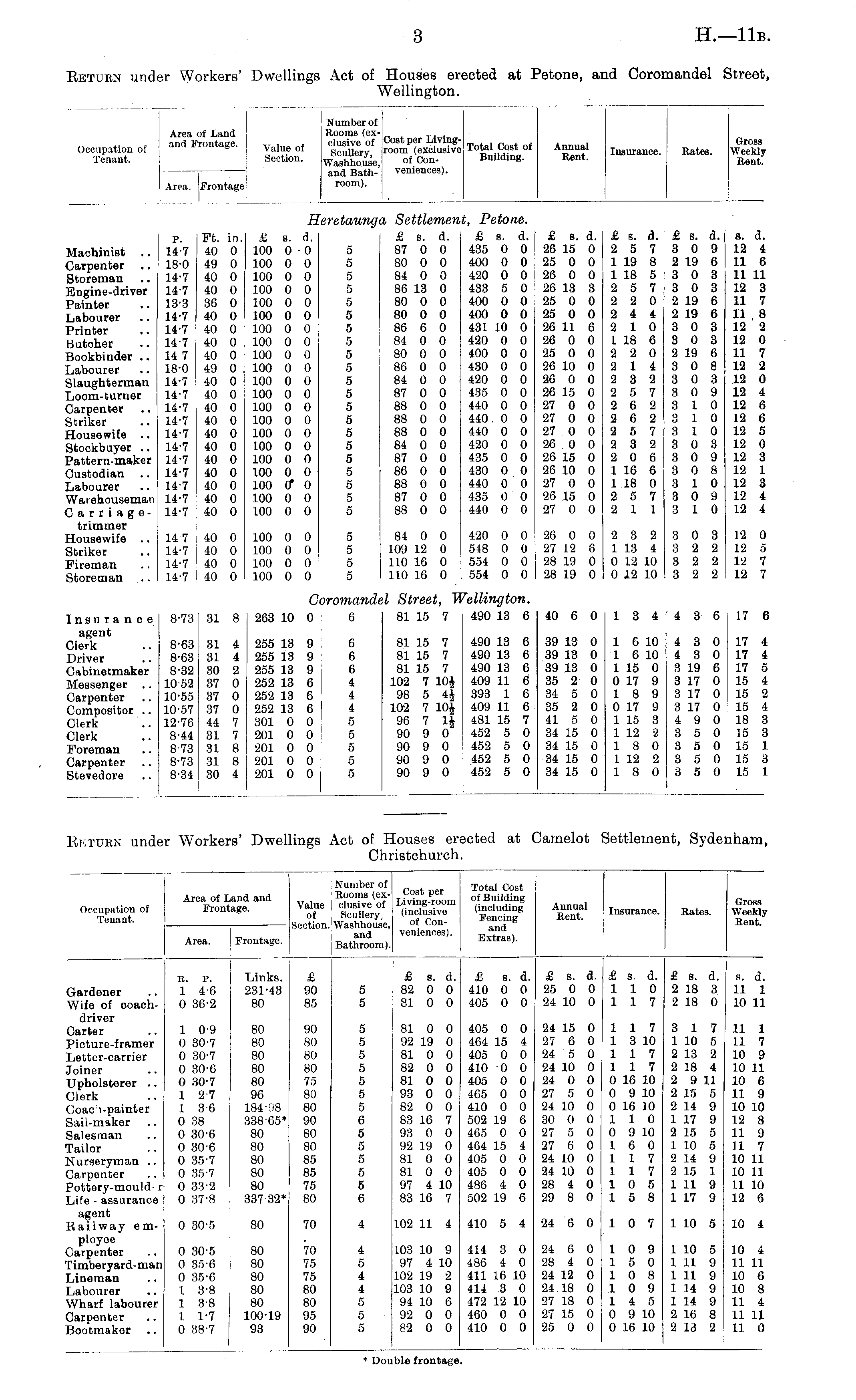 1 Area of Land ,. .. , and Frontage. Occupation of Tenant. Value of Section. Number of Rooms (exclusive of Scullery, Washhouse, Cost per Livingroom (exclusive rotal cost 01 of Con- Building, veniences). Annual Rent. ', Insurance. Rates. Gross Weekly Rent. and Bati room). Area. jFrontage Machinist Carpenter Storeman Engine-driver Painter Labourer Printer Butcher Bookbinder .. Labourer Slaughterman Loom-turner Carpenter Striker Housewife .. Stockbuyer .. Pattern-maker Custodian Labourer Warehouseman Carriagetrimmer Housewife Striker Fireman Storeman p. 14-7 18-0 14-7 14-7 133 14-7 14-7 14'7 14 7 18-0 14-7 14-7 14-7 14-7 14-7 14-7 14-7 14-7 147 14-7 14-7 Ft. in. 40 0 49 0 40 0 40 0 36 0 40 0 40 0 40 0 40 0 49 0 40 0 40 0 40 0 40 0 40 0 40 0 40 0 40 0 40 0 40 0 40 0 £ s. d. 100 0 0 100 0 0 100 0 0 100 0 0 100 0 0 100 0 0 100 0 0 100 0 0 100 0 0 100 0 0 100 0 0 100 0 0 100 0 0 100 0 0 100 0 0 100 0 0 100 0 0 100 0 0 100 Cf 0 100 0 0 too 0 0 'eretaung. 5 5 5 5 5 5 5 5 5 5 5 5 5 5 5 5 5 5 5 5 5 i Settlemen £ s. d. 87 0 0 80 0 0 84 0 0 86 13 0 80 0 0 80 0 0 86 6 0 84 0 0 80 0 0 86 0 0 84 0 0 87 0 0 88 0 0 88 0 0 88 0 0 84 0 0 87 0 0 86 0 0 88 0 0 87 0 0 88 0 0 ■t, Petone. £ s. d. 435 0 0 400 0 0 420 0 0 433 5 0 400 0 0 400 0 0 431 10 0 420 0 0 400 0 0 430 0 0 420 0 0 435 0 0 440 0 0 440 0 0 ! 440 0 0 420 0 0 435 0 0 430 0 0 440 0 0 435 0 0 440 0 0 £ s. d. 26 15 0 25 0 0 26 0 0 26 13 3 25 0 0 25 0 0 26 11 6 26 0 0 25 0 0 26 10 0 26 0 0 26 15 0 27 0 0 27 0 0 27 0 0 26 0 0 26 15 0 26 10 0 27 0 0 26 15 0 27 0 0 £ s. d. 2 5 7 1 19 8 1 18 5 2 5 7 2 2 0 2 4 4 2 10 1 18 6 2 2 0 2 14 2 3 2 2 5 7 2 6 2 2 6 2 2 5 7 2 3 2 2 0 6 1 16 6 1 18 0 2 5 7 2 1 1 £. s. d. 3 0 9 2 19 6 3 0 3 3 0 3 2 19 6 2 19 6 3 0 3 3 0 3 2 19 6 3 0 8 3 0 3 3 0 9 3 1 0 3 10 3 1 0 3 0 3 3 0 9 3 0 8 3 10 3 0 9 3 1 0 s. d. 12 4 11 6 11 11 12 3 11 7 11 8 12 2 12 0 11 7 12 2 12 0 12 4 12 6 12 6 12 5 12 0 12 3 12 1 12 3 12 4 12 4 14 7 14-7 14-7 14-7 40 0 40 0 40 0 40 0 100 0 0 100 0 0 100 0 0 100 0 0 5 5 5 5 84 0 0 109 12 0 HO 16 0 110 16 0 420 0 0 548 0 0 554 0 0 554 0 0 I 26 0 0 27 12 8 28 19 0 I 28 19 0 2 3 2 1 13 4 0 12 10 0 12 10 3 0 3 3 2 2 3 2 2 3 2 2 12 0 12 5 12 7 12 7 Insurance agent Clerk Driver Cabinetmaker Messenger Carpenter Compositor .. Clerk Clerk Foreman Carpenter Stevedore 8-73 31 8 c 263 10 0 oromandi :l Street, T 81 15 7 Vellington. 490 13 6 40 6 0 1 3 4 4 3 6 17 6 6 8-63 8-63 8-32 1062 10-55 10-57 12-76 8-44 873 8-73 8-34 31 4 31 4 30 2 37 0 37 0 37 0 44 7 31 7 31 8 31 8 30 4 255 13 9 255 13 9 255 13 9 252 13 6 252 13 6 252 13 6 301 0 0 201 0 0 201 0 0 201 0 0 201 0 0 6 6 6 4 4 4 5 5 5 5 5 81 15 7 81 15 7 81 15 7 102 7 10J 98 5 4£ 102 7 10J 96 7 l| 90 9 0 90 9 0 90 9 0 90 9 0 490 13 6 490 13 6 490 13 6 409 11 6 393 1 6 409 11 6 i 481 15 7 j 452 5 0 452 5 0 452 5 0 452 5 0 39 13 0 39 13 0 39 13 0 35 2 0 34 5 0 35 2 0 41 5 0 34 15 0 34 15 0 34 15 0 34 15 0 1 6 10 1 6 10 1 15 0 0 17 9 1 8 9 0 17 9 1 15 3 1 12 2 18 0 I 12 2 1 8 0 4 3 0 4 3 0 3 19 6 3 17 0 3 17 0 3 17 0 4 9 0 3 5 0 3 5 0 3 5 0 3 5 0 17 4 17 4 17 5 15 4 15 2 15 4 18 3 15 3 15 1 15 3 15 1