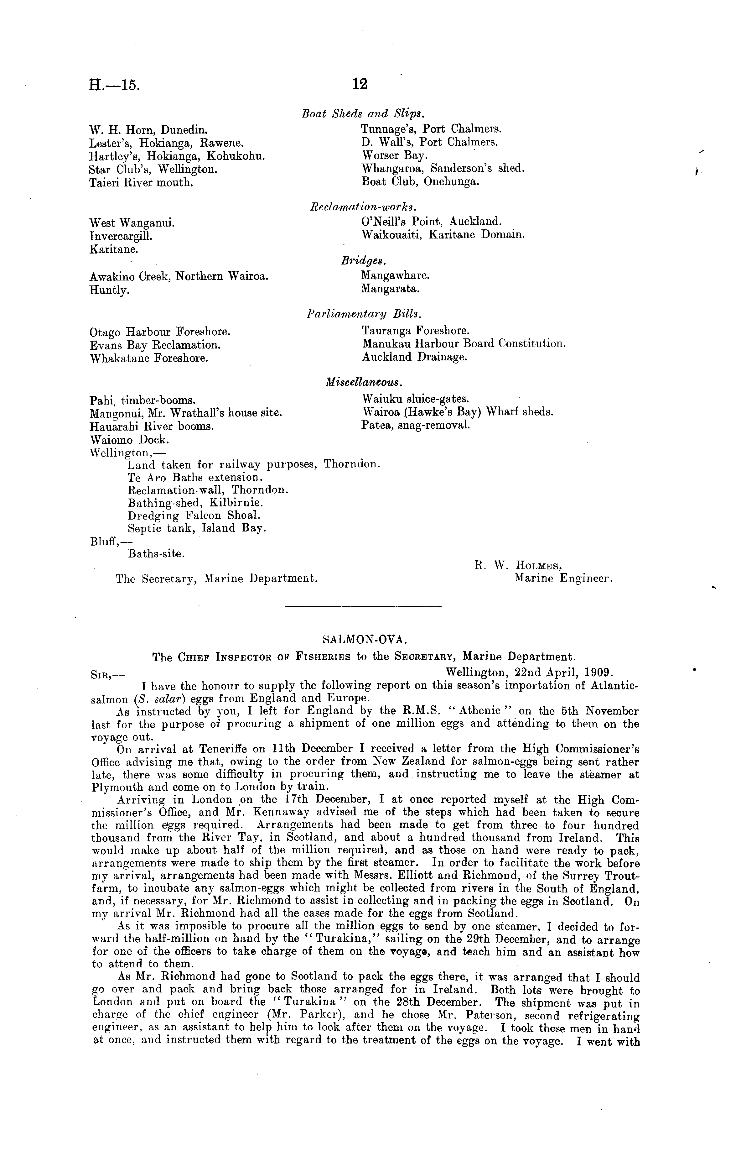 SALMON-OVA. The Chief Inspector of Fisheries to the Secretary, Marine Department. Sir,— Wellington, 22nd April, 1909. I have the honour to supply the following report on this season's importation of Atlanticsalmon (S. salar) eggs from England and Europe. As instructed by you, I left for England by the R.M.S. " Athenic " on the sth November last for the purpose of procuring a shipment of one million eggs and attending to them on the voyage out. On arrival at Teneriffe on 11th December I received a letter from the High Commissioner's Office advising me that, owing to the order from New Zealand for salmon-eggs being sent rather late, there was some difficulty in procuring them, and instructing me to leave the steamer at Plymouth and come on to London by train. Arriving in London on the 17th December, I at once reported myself at the High Commissioner's Office, and Mr. Kennaway advised me of the steps which had been taken to secure the million eggs required. Arrangements had been made to get from three to four hundred thousand from the River Tay, in Scotland, and about a hundred thousand from Ireland. This would make up about half of the million required, and as those on hand were ready to pack, arrangements were made to ship them by the first steamer. In order to facilitate the work before my arrival, arrangements had been made with Messrs. Elliott and Richmond, of the Surrey Troutfarm, to incubate any salmon-eggs which might be collected from rivers in the South of England, and, if necessary, for Mr. Richmond to assist in collecting and in packing the eggs in Scotland. On my arrival Mr. Richmond had all the cases made for the eggs from Scotland. As it was imposible to procure all the million eggs to send by one steamer, I decided to forward the half-million on hand by the " Turakina," sailing on the 29th December, and to arrange for one of the officers to take charge of them on the voyage, and teach him and an assistant how to attend to them. As Mr. Richmond had gone to Scotland to pack the eggs there, it was arranged that I should go over and pack and bring back those arranged for in Ireland. Both lots were brought to London and put on board the " Turakina " on the 28th December. The shipment was put in charge of the chief engineer (Mr. Parker), and he chose Mr. Paterson, second refrigerating engineer, as an assistant to help him to look after them on the voyage. I took these men in hand at once, and instructed them with regard to the treatment of the eggs on the voyage. I went with