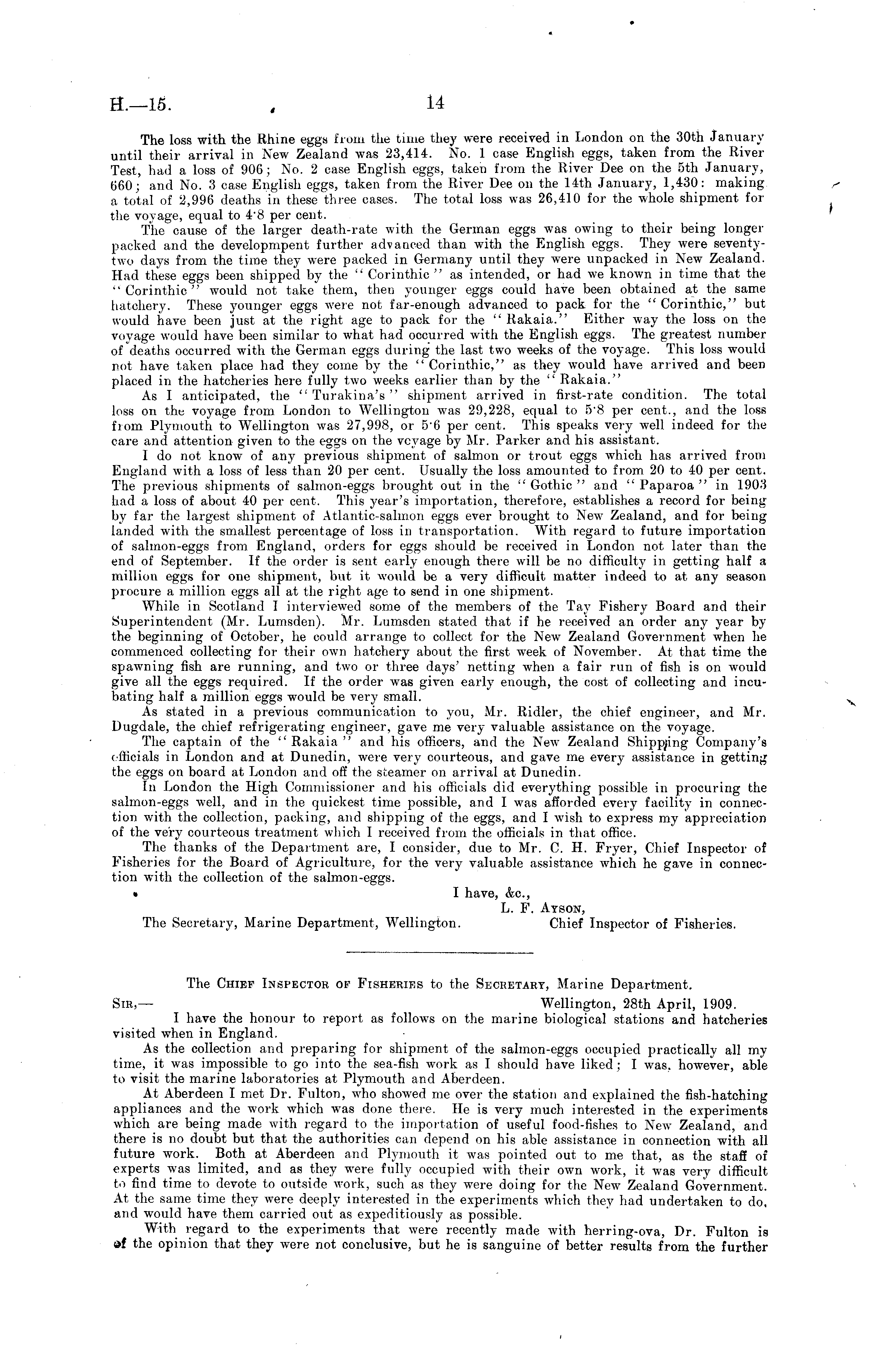 The Chief Inspector of Fisheries to the Secretary, Marine Department. Sir,— Wellington, 28th April, 1909. I have the honour to report as follows on the marine biological stations and hatcheries visited when in England. As the collection and preparing for shipment of the salmon-eggs occupied practically all my time, it was impossible to go into the sea-fish work as I should have liked ; I was. however, able to visit the marine laboratories at Plymouth and Aberdeen. At Aberdeen I met Dr. Fulton, who showed me over the station and explained the fish-hatching appliances and the work which was done there. He is very much interested in the experiments which are being made with regard to the importation of useful food-fishes to New Zealand, and there is no doubt but that the authorities can depend on his able assistance in connection with all future work. Both at Aberdeen and Plymouth it was pointed out to me that, as the staff of experts was limited, and as they were fully occupied with their own work, it was very difficult to find time to devote to outside work, such as they were doing for the New Zealand Government. At the same time they were deeply interested in the experiments which they had undertaken to do, and would have them carried out as expeditiously as possible. With regard to the experiments that were recently made with herring-ova, Dr. Fulton is !»f the opinion that they were not conclusive, but he is sanguine of better results from the further