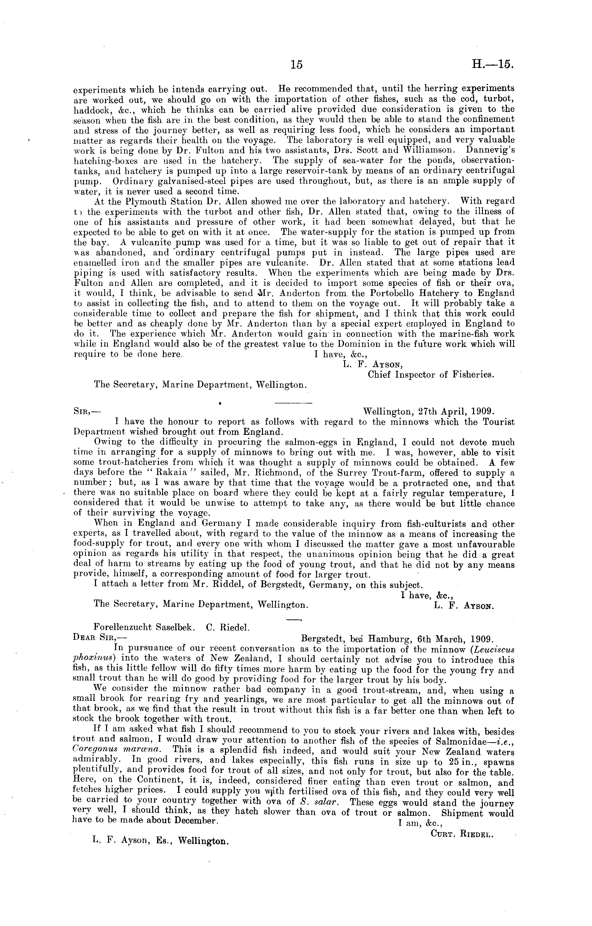 experiments which he intends carrying out. He recommended that, until the herring experiments are worked out, we should go on with the importation of other fishes, such as the cod, turbot, haddock, &c, which he thinks can be carried alive provided due consideration is given to the season when the fish are in the best condition, as they would then be able to stand the confinement and stress of the journey better, as well as requiring less food, which he considers an important matter as regards their health on the voyage. The laboratory is well equipped, and very valuable work is being done by Dr. Fulton and his two assistants, Drs. Scott and Williamson. Dannevig's hatching-boxes are used in the hatchery. The supply of sea-water for the ponds, observationtanks, and hatchery is pumped up into a large reservoir-tank by means of an ordinary centrifugal pump. Ordinary gaivanised-steel pipes are used throughout, but, as there is an ample supply of water, it is never used a second time. At the Plymouth Station Dr. Allen showed me over the laboratory and hatchery. With regard to the experiments with the turbot and other fish, Dr. Allen stated that, owing to the illness of one of his assistants and pressure of other work, it had been somewhat delayed, but that he expected to be able to get on with it at once. The water-supply for the station is pumped up from the bay. A vulcanite pump was used for a time, but it was so liable to get out of repair that it was abandoned, and 'ordinary centrifugal pumps put in instead. The large pipes used are enamelled iron and the smaller pipes are vulcanite. Dr. Allen stated that at some stations lead piping is used with satisfactory results. When the experiments which are being made by Drs. Fulton and Allen are completed, and it is decided to import some species of fish or their ova, it would, I think, be advisable to send Mr. Anderton from, the Portobello Hatchery to England to assist in collecting the fish, and to attend to them on the voyage out. It will probably take a considerable time to collect and prepare the fish for shipment, and I think that this work could be better and as cheapty done by Mr. Anderton than by a special expert employed in England to do it. The experience which Mr. Anderton would gairr in connection with the marine-fish work while in England would also be of the greatest value to the Dominion in the future work which will require to be done here. I have, &c, L. F. Ayson, Chief Inspector of Fisheries. The Secretary, Marine Department, Wellington. Sir,— Wellington, 27th April, 1909. I have the honour to report as follows with regard to the minnows which the Tourist Department wished brought out from England. Owing to the difficulty in procuring the salmon-eggs in England, I could not devote much time in arranging for a supply of minnows to bring out with me. I was, however, able to visit some trout-hatcheries from which it was thought a supply of minnows could be obtained. A few days before the " Rakaia " sailed, Mr. Richmond, of the Surrey Trout-farm, offered to supply a number; but, as I was aware by that time that the voyage would be a protracted one, and that there was no suitable place on board where they could be kept at a fairly regular temperature, I considered that it would be unwise to attempt to take any, as there would be but little chance of their surviving the voyage. When in England and Germany I made considerable inquiry from fish-culturists and other experts, as I travelled about, with regard to the value of the minnow as a means of increasing the food-supply for trout, and every one with whom I discussed the matter gave a most unfavourable opinion as regards his utility in that respect, the unanimous opinion being that he did a great deal of harm to streams by eating up the food of young trout, and that he did not by any means provide, himself, a corresponding amount of food for larger trout. I attach a letter from Mr. Riddel, of Bergstedt, Germany, on this subject. I have, &c, The Secretary, Marine Department, Wellington. L. F. Ayson. Forellenzucht Saselbek. C. Riedel. Dear Sir,— Bergstedt, beii Hamburg, 6th March, 1909. In pursuance of our recent conversation as to the importation of the minnow (Leuciscus phoxinus) into the waters of New Zealand, I should certainly not advise you to introduce this fish, as this little fellow will do fifty times more harm by eating up the food for the young fry and small trout than he will do good by providing food for the larger trout by his body. We consider the minnow rather bad company in a good trout-stream, and, when using a small brook for rearing fry and yearlings, we are most particular to get all the minnows out of that brook, as we find that the result in trout without this fish is a far better one than when left to stock the brook together with trout. If I am asked what fish I should recommend to you to stock your rivers and lakes with, besides trout and salmon, I would draw your attention to another fish of the species of Salmonidae— i.e., Coregonus mara-na. This is a splendid fish indeed, and would suit your New Zealand waters admirably. In good rivers, and lakes especially, this fish runs in size up to 25 in., spawns plentifully, and provides food for trout of all sizes, and not only for trout, but also for the table. Here, on the Continent, it is, indeed, considered finer eating than even trout or salmon, and fetches higher prices. I could supply you wjith fertilised ova of this fish, and they could very well be carried to your country together with ova of S. salar. These eggs would stand the journey very well, I should thrnk, as they hatch slower than ova of trout or salmon. Shipment would have to be made about December. t am & c t t.i a T1 ~r „■ Curt. Riedel, h, r. Ayson, Es., Wellington.