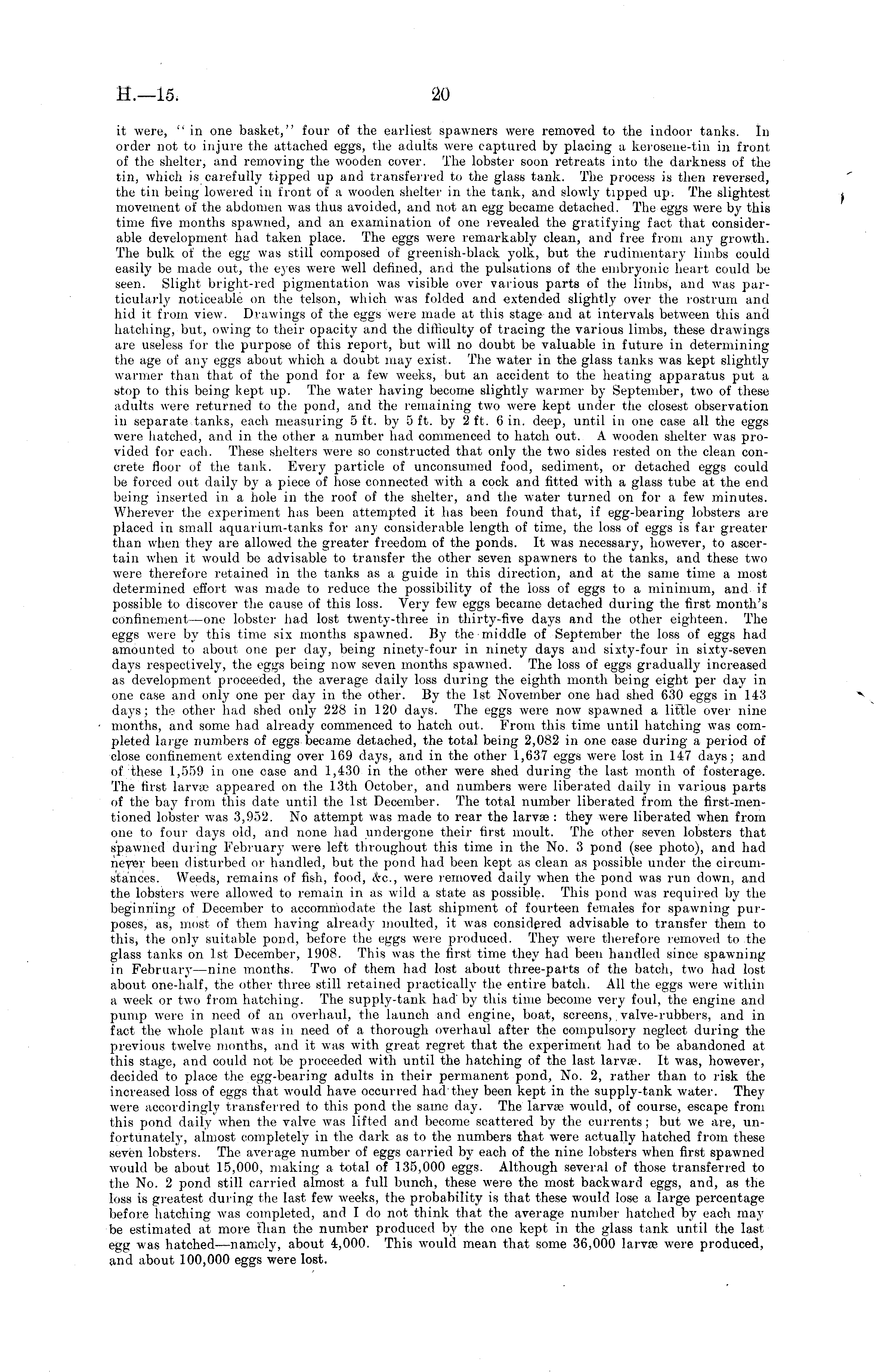 it were, "in one basket," four of the earliest spawners were removed to the indoor tanks. In order not to injure the attached eggs, the adults were captured by placing a kerosene-tin in front of the shelter, and removing the wooden cover. The lobster soon retreats into the darkness of the tin, which is carefully tipped up and transferred to the glass tank. The process is then reversed, the tin being lowered in front of a wooden shelter in the tank, and slowly tipped up. The slightest movement of the abdomen was thus avoided, and not an egg became detached. The eggs were by this time five months spawned, and an examination of one revealed the gratifying fact that considerable development had taken place. The eggs were remarkably clean, and free from any growth. The bulk of the egg was still composed of greenish-black yolk, but the rudimentary limbs could easily be made out, the eyes were well defined, and the pulsations of the embryonic heart could be seen. Slight bright-red pigmentation was visible over various parts of the limbs, and was particularly noticeable on the telson, which was folded and extended slightly over the rostrum and hid it from view. Drawings of the eggs were made at this stage and at intervals between this and hatching, but, owing to their opacity and the difficulty of tracing the various limbs, these drawings are useless for the purpose of this report, but will no doubt be valuable in future in determining the age of any eggs about which a doubt may exist. The water in the glass tanks was kept slightly warmer than that of the pond for a few weeks, but an accident to the heating apparatus put a stop to this being kept up. The water having become slightly warmer by September, two of these adults were returned to the pond, and the remaining two were kept under the closest observation in separate tanks, each measuring 5 ft. by 5 ft. by 2 ft. 6 in. deep, until in one case all the eggs were hatched, and in the other a number had commenced to hatch out. A wooden shelter was provided for each. These shelters were so constructed that only the two sides rested on the clean concrete floor of the tank. Every particle of unconsumed food, sediment, or detached eggs could be forced out daily by a piece of hose connected with a cock and fitted with a glass tube at the end being inserted in a hole in the roof of the shelter, and the water turned on for a few minutes. Wherever the experiment has been attempted it has been found that, if egg-bearing lobsters are placed in small aquarium-tanks for any considerable length of time, the loss of eggs is far greater than when they are allowed the greater freedom of the ponds. It was necessary, however, to ascertain when it would be advisable to transfer the other seven spawners to the tanks, and these two were therefore retained in the tanks as a guide in this direction, and at the same time a most determined effort was made to reduce the possibility of the loss of eggs to a minimum, and if possible to discover the cause of this loss. Very few eggs became detached during the first month's confinement —one lobster had lost twenty-three in thirty-five days and the other eighteen. The eggs were by this time six months spawned. By the middle of September the loss of eggs had amounted to about one per day, being ninety-four in ninety days and sixty-four in sixty-seven days respectively, the eggs being now seven months spawned. The loss of eggs gradually increased as development proceeded, the average daily loss during the eighth month being eight per day in one case and only one per day in the other. By the Ist November one had shed 630 eggs in 143 days; the other had shed only 228 in 120 days. The eggs were now spawned a little over nine months, and some had already commenced to hatch out. From this time until hatching was completed large numbers of eggs became detached, the total being 2,082 in one case during a period of close confinement extending over 169 days, and in the other 1,637 eggs were lost in 147 days; and of these 1,559 in one case and 1,430 in the other were shed during the last month of fosterage. The first larva? appeared on the 13th October, and numbers were liberated daily in various parts of the bay from this date until the Ist December. The total number liberated from the first-men-tioned lobster was 3,952. No attempt was made to rear the larvae : they were liberated when from one to four days old, and none had undergone their- first moult. The other seven lobsters that spawned during February were left throughout this time in the No. 3 pond (see photo), and had nrvrv been disturbed or handled, but the pond had been kept as clean as possible under the circumstances. Weeds, remains of fish, food, &c, were removed daily when the pond was run down, and the lobsters were allowed to remain in as wild a state as possible. This pond was required by the beginning of December to accommodate the last shipment of fourteen females for spawning purposes, as, most of them having already moulted, it was considered advisable to transfer them to this, the only suitable pond, before the eggs were produced. They were therefore removed to the glass tanks on Ist December, 1908. This was the first time they had been handled since spawning in February —nine months. Two of them had lost about three-parts of the batch, two had lost about one-half, the other three still retained practically the entire batch. All the eggs were within a week- or two from hatching. The supply-tank had by this time become very foul, the engine and pump were in need of an overhaul, the launch and engine, boat, screens,, valve-rubbers, and in fact the whole plant was in need of a thorough overhaul after the compulsory neglect during the previous twelve months, and it was with great regret that the experiment had to be abandoned at this stage, and could not be proceeded with until the hatching of the last larvae. It was, however, decided to place the egg-bearing adults
