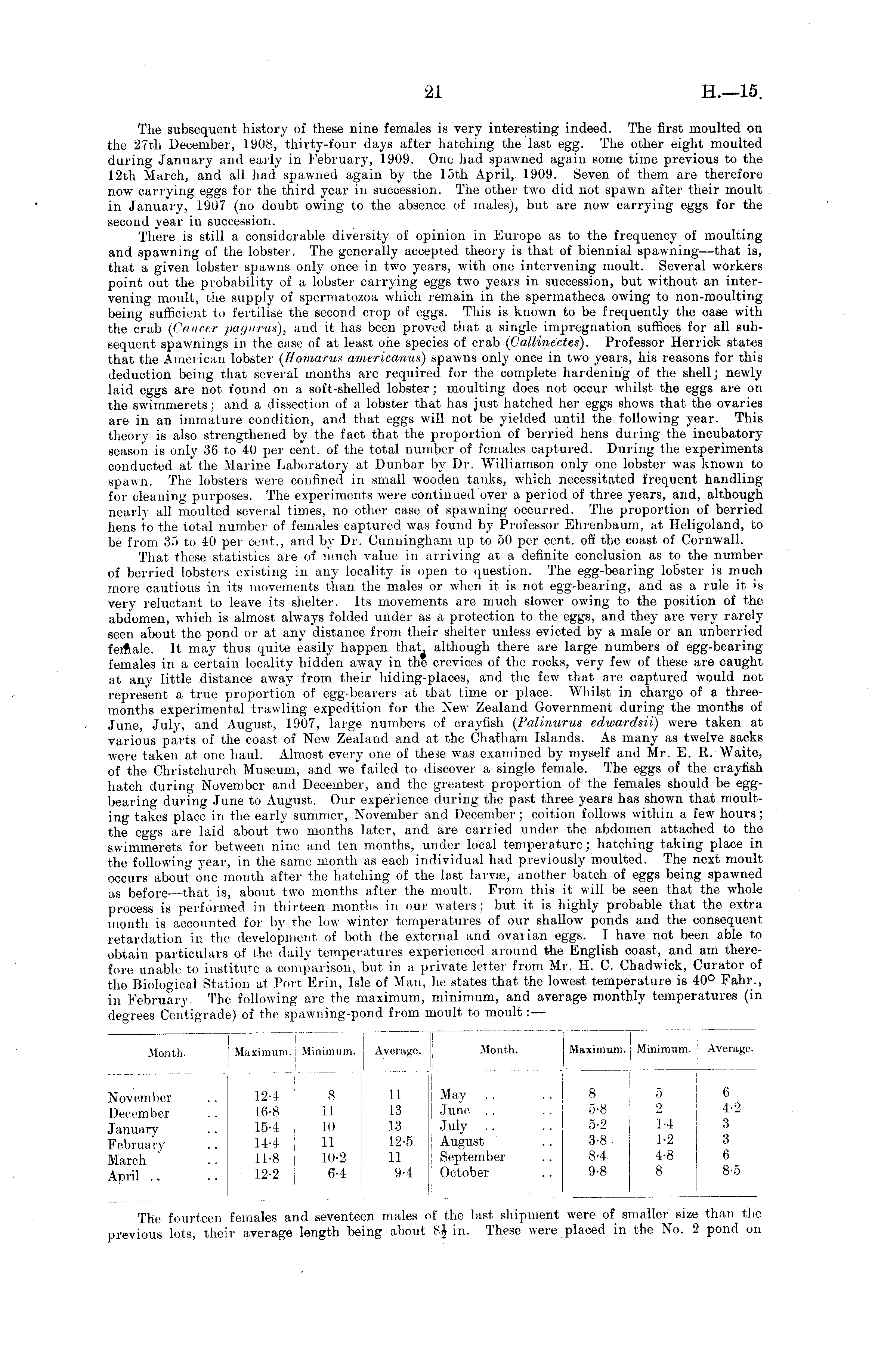 The subsequent history of these nine females is very interesting indeed. The first moulted on the 27th December, 1908, thirty-four days after hatching the last egg. The other eight moulted during January and early in February, 1909. One had spawned again some time previous to the 12th March, and all had spawned again by the 15th April, 1909. Seven of them are therefore now carrying eggs for the third year in succession. The other two did not spawn after their moult in January, 1907 (no doubt owing to the absence of males), but are now carrying eggs for the second year in succession. There is still a considerable diversity of opinion in Europe as to the frequency of moulting and spawning of the lobster. The generally accepted theory is that of biennial spawning—that is, that a given lobster spawns only once in two years, with one intervening moult. Several workers point out the probability of a lobster carrying eggs two years in succession, but without an intervening moult, the supply of spermatozoa which remain in the spermatheca owing to non-moulting being sufficient to fertilise the second crop of eggs. This is known to be frequently the case with the crab (Cancer pagurus), and it has been proved that a single impregnation suffices for all subsequent spawnings in the case of at least one species of crab (Gallinectes). Professor Herrick states that the American lobster (Homarus aniericanus) spawns only once in two years, his reasons for this deduction being that several months are required for the complete hardening of the shell; newly laid eggs are not found on a soft-shelled lobster; moulting does not occur whilst the eggs are on the swimmerets ; and a dissection of a lobster that has just hatched her eggs shows that the ovaries are in an immature condition, and that eggs will not be yielded until the following year. This theory is also strengthened by the fact that the proportion of berried hens during the incubatory season is only 36 to 40 per cent, of the total number of females captured. During the experiments conducted at the Marine Laboratory at Dunbar by Dr. Williamson only one lobster was known to spawn. The lobsters were confined in small wooden tanks, which necessitated frequent handling for cleaning purposes. The experiments were continued over a period of three years, and, although nearly all moulted several times, no other case of spawning occurred. The proportion of berried hens to the total number of females captured was found by Professor Ehrenbaum, at Heligoland, to be from 35 to 40 per cent., and by Dr. Cunningham up to 50 per cent, off the coast of Cornwall. That these statistics are of much value in arriving at a definite conclusion as to the number of berried lobsters existing in any locality is open to question. The egg-bearing lobster is much more cautious in its movements than the males or when it is not egg-bearing, and as a rule it is very reluctant to leave its shelter. Its movements are much slower owing to the position of the abdomen, wilich is almost always folded under as a protection to the eggs, and they are very rarely seen about the pond or at any distance from their shelter unless evicted by a male or an unbended female. It may thus quite easily happen that although there are large numbers of egg-bearing females in a certain locality hidden away in the crevices of the rocks, very few of these are caught at any little distance away from their hiding-places, and the few that are captured would not represent a true proportion of egg-bearers at that time or place. Whilst in charge of a threemonths experimental trawling expedition for the New Zealand Government during the months of June, July, and August, 1907, large numbers of crayfish (Palinurus edwardsii) were taken at various parts of the coast of New Zealand and at the Chatham Islands. As many as twelve sacks were taken at one haul. Almost every one of these was examined by myself and Mr. E. R. Waite, of the Christchurch Museum, and we failed to discover a single female. The eggs of the crayfish hatch during November and December, and the greatest proportion of the females should be eggbearing during June to August. Our experience during the past three years has shown that moulting takes place in the early summer, November and December ; coition follows within a few hours; the eggs are laid about two months later, and are carried under the abdomen attached to the swimmerets for between nine and ten months, under local temperature; hatching taking place in the following year, in the same month as each individual had previously moulted. The next moult occurs about one month after the hatching of the last larva?, another batch of eggs being spawned as before —that is, about two months after the moult. From this it will be seen that the whole process is performed in thirteen months in our waters; but it is highly probable that the extra month is accounted for by the low winter temperatures of our shallow ponds and the consequent retardation in the development of both the external and ovarian eggs. I have not been able to obtain particulars of the daily temperatures experienced around the English coast, and am therefore unable to institute a comparison, but in a private letter from Mr. H. C. Chadwick, Curator of the Biological Station at Port Erin, Isle of Man, he states that the lowest temperature is 40° Fahr., in February. The following are the maximum, minimum, and average monthly temperatures (in degrees Centigrade) of the spawning-pond from moult to moult: —