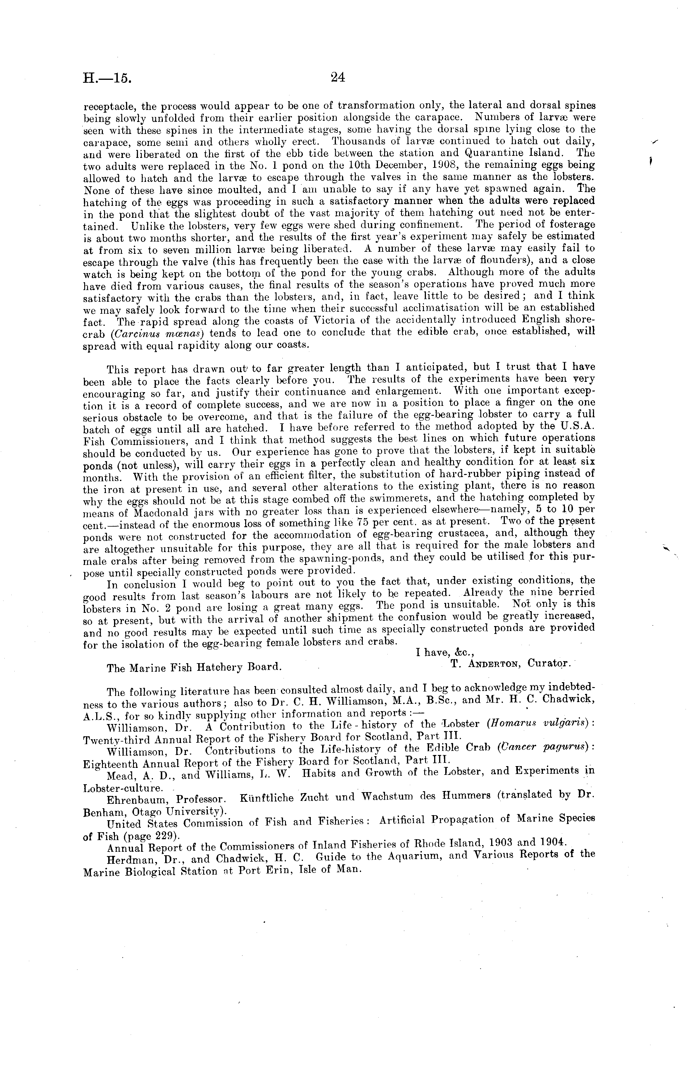 receptacle, the process would appear to be one of transformation only, the lateral and dorsal spines being slowly unfolded from their earlier position alongside the carapace. Numbers of larva? were seen with these spines in the intermediate stages, some having the dorsal spine lying close to the carapace, some semi and others wholly erect. Thousands of larva? continued to hatch out daily, and were liberated on the first of the ebb tide between the station and Quarantine Island. The two adults were replaced in the No. 1 pond on the 10th December, 1908, the remaining eggs being allowed to hatch and the larva? to escape through the valves in the same manner as the lobsters. None of these have since moulted, and I am unable to say if any have yet spawned again. The hatching of the eggs was proceeding in such a satisfactory manner when the adults were replaced in the pond that the slightest doubt of the vast majority of them hatching out need not be entertained. Unlike the lobsters, very few eggs were shed during confinement. The period of fosterage is about two months shorter, and the results of the first year's experiment may safely be estimated at from six to seven million larva? being liberated. A number of these larvae may easily fail to escape through the valve (this has frequently been the case with the larvae of flounders), and a close watch is being kept on the bottom of the pond for the young crabs. Although more of the adults have died from various causes, the final results of the season's operations have proved much more satisfactory with the crabs than the lobsters, and, in fact, leave little to be desired; and I think we may safely look forward to the time when their successful acclimatisation will be an established fact. The rapid spread along the coasts of Victoria of the accidentally introduced English shorecrab (Carcinus moznas) tends to lead one to conclude that the edible crab, once established, will spread with equal rapidity along our coasts. This report has drawn out to far greater length than I anticipated, but I trust that I have been able to place the facts clearly before you. The results of the experiments have been very encouraging so far, and justify their continuance and enlargement. With one important exception it is a record of complete success, and we are now in a position to place a finger on the one serious obstacle to be overcome, and that is the failure of the egg-bearing lobster to carry a full batch of eggs until all are hatched. I have before referred to the method adopted by the U.S.A. Fish Commissioners, and I think that method suggests the best lines on which future operations should be conducted by us. Our experience has gone to prove that the lobsters, if kept in suitable ponds (not unless), will carry their eggs in a perfectly clean and healthy condition for at least six months. With the provision of an efficient filter, the substitution of hard-rubber piping instead of the iron at present in use, and several other alterations to the existing plant, there is no reason why the eggs should not be at this stage combed off the swimmerets, and the hatching completed by means of Macdonald jars with no greater loss than is experienced elsewhere—namely, 5 to 10 per ceut —instead of the enormous loss of something like 75 per cent, as at present. Two of the present ponds were not constructed for the accommodation of egg-bearing Crustacea, and, although they are altogether unsuitable for this purpose, they are all that is required for the male lobsters and male crabs after being removed from the spawning-ponds, and they could be utilised for this purpose until specially constructed ponds were provided. In conclusion I would beg to point out to you the fact that, under existing conditions, the good results from last season's labours are not likely to be repeated. Already the nine berried lobsters in No. 2 pond are losing a great many eggs. The pond is unsuitable. Not only is this so at present but with the arrival of another shipment the confusion would be greatly increased, and no good results may be expected until such time as specially constructed ponds are provided for the isolation of the egg-bearing female lobsters and crabs. I have, &c, The Marine Fish Hatchery Board. T. Anderton, Curator. The following literature has been consulted almost daily, and I beg to acknowledge my indebtedness to the various authors; also to Dr. C. H. Williamson, M.A., B.Sc, and Mr. H. C. Chadwick, A L S , for so kindly supplying other information and reports : — _ 'Williamson, Dr. A Contribution to the Life - history of the 'Lobster (Homarus vulgaris) : Twenty-third Annual Report of the Fishery Board for Scotland, Part 111. Williamson, Dr. Contributions to the Life-history of the Edible Crab (Cancer pagurus) : Eighteenth Annual Report of the Fishery Board for Scotland, Part 111 Mead, A. D., and Williams, L. W. Habits and Growth of the Lobster, and Experrments m Lobster-culture. _ .. • ~ , \ n Ehrenbaum, Professor. Kiinftliche Zucht und Wachstum dcs Hummers (translated by Dr. Benham, Otago University). .„ . , „ .• . ™ • o United States Commission of Fish and Fisheries : Artificial Propagation of Marine Species ° f F Annualßeport of the Commissioners of Inland Fisheries of Rhode Island, 1903 and 1904. Herdman, Dr., and Chadwick, H. C. Guide to the Aquarium, and Various Reports of the Marine Biological Station at Port Erin, Isle of Man.