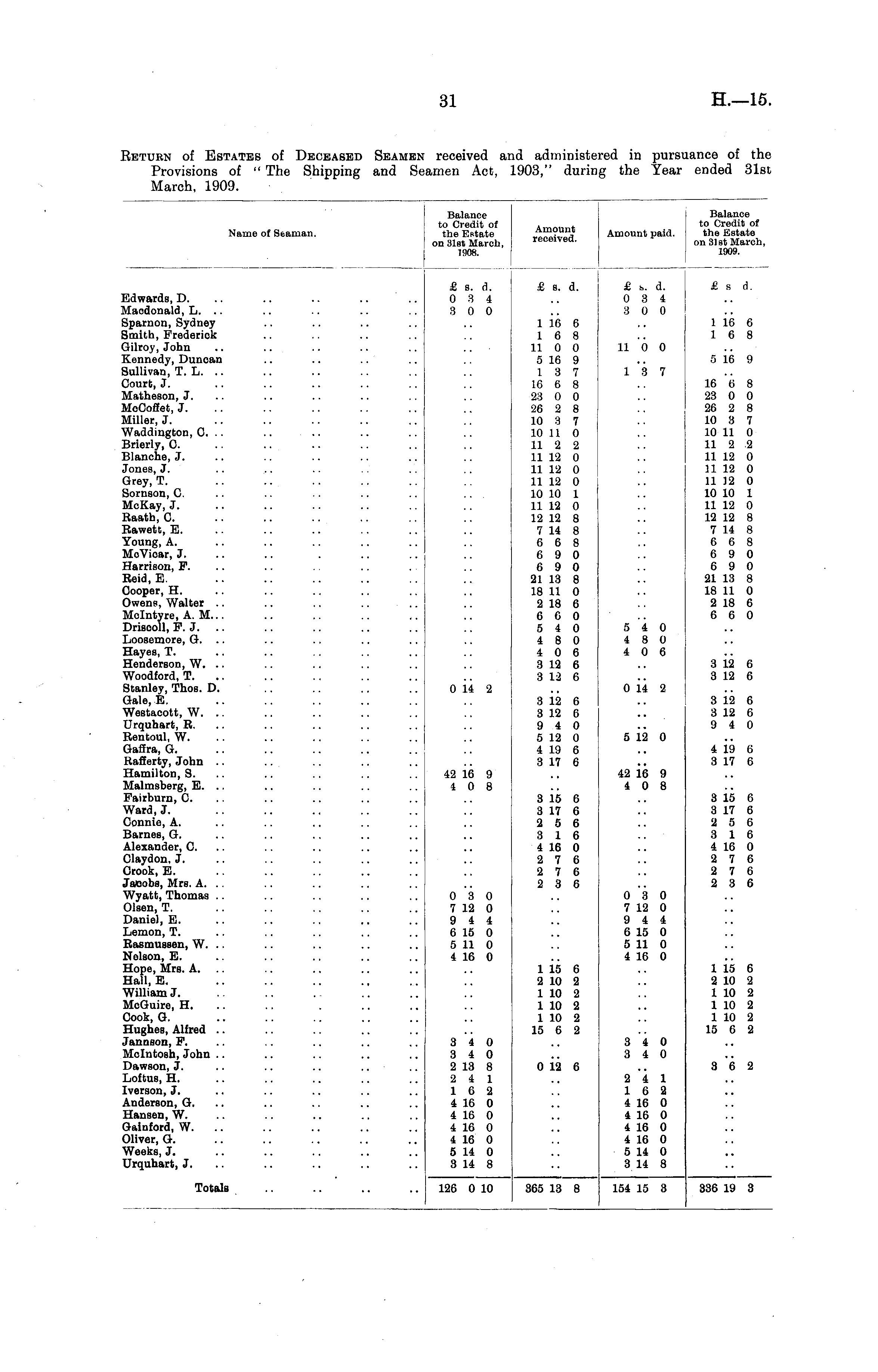 Name of Seaman. Balance to Credit of the Estate on 31st March, 1908. Amount received. Amount paid. _ Balance to Credit of the Estate on 31st March 1909. £ a. d. 0 3 4 3 0 0 S s. d. 1 16 6 1 6 8 11 0 0 5 16 9 1 3 7 16 6 8 23 0 0 26 2 8 10 3 7 10 11 0 11 2 2 11 12 0 11 12 0 11 12 0 10 10 1 11 12 0 12 12 8 7 14 8 6 6 8 6 9 0 6 9 0 21 13 8 18 11 0 2 18 6 6 6 0 5 4 0 4 8 0 4 0 6 3 12 6 3 12 6 3 12 6 3 12 6 9 4 0 5 12 0 4 19 6 3 17 6 3 15 6 3 17 6 2 5 6 3 16 4 16 0 2 7 6 2 7 6 2 3 6 1 15 6 2 10 2 1 10 2 1 10 2 1 10 2 15 6 2 0 12 6 £ b. d. 0 3 4 3 0 0 •• 11 0 0 13 7 5 4 0 4 8 0 4 0 6 0 14 2 5 12 0 42 16 9 4 0 8 0 3 0 7 12 0 9 4 4 6 15 0 5 11 0 4 16 0 3 4 0 3 4 0 2 "i 1 16 2 4 16 0 4 16 0 4 16 0 4 16 0 5 14 0 3 14 8 £ s d. Edwarda, D. Maodonald, L. .. Sparnon, Sydney Smith, Frederiok Gilroy, John Kennedy, Duncan Sullivan, T. L. Court, J. Matheson, J. MeCoffet, J. Miller, J. Waddington, 0. .. Brierly, O. Blanche, J. Jones, J. Grey, T. Sornson, C. McKay, J. Baath, C. Bawett, E. Young, A. MoVicar, J. Harrison, F. Reid, K. Cooper, H. Owens, Walter .. Molntyre, A. M... Drisooll, F. J. .. Loosemore, G. Hayes, T. Henderson, W. .. Woodford, T. Stanley, Thos. D. Gale, E. Westacott, W. .. Urquhart, R. Rentoul, W. Gaffra, G. Rafierty, John .. Hamilton, S. Malmsberg, E. .. Pairburn, C. Ward, J. Connie, A. Barnes, G. Alexander, C. Claydon, J. Crook, E. Jacobs, Mrs. A. .. Wyatt, Thomas .. Olsen, T. Daniel, E. Lemon, T. Rasmussen, W. .. Nelson, E. Hope, Mrs. A. Hall, E. William J. McGuire, H. Cook, G. Hughes, Alfred .. Jannson, F. Mclntosh, John .. Dawson, J. Loftus, H. Iverson, J. Anderson, G. Hansen, W. Gainford, W. Oliver, G. Weeks, J. Urquhart, J. 0 14 2 1 16 6 1 6 8 5 16 9 16 6 8 23 0 0 26 2 8 10 3 7 10 11 0 11 2 .2 11 12 0 11 12 0 11 12 0 10 10 1 11 12 0 12 12 8 7 14 8 6 6 8 6 9 0 6 9 0 21 13 8 18 11 0 2 18 6 6 6 0 3 12 6 3 12 6 3 12 6 3 12 6 9 4 0 4 19 6 3 17 6 42 16 9 4 0 8 3 15 6 3 17 6 2 5 6 3 16 4 16 0 2 7 6 2 7 6 2 3 6 0 3 0 7 12 0 9 4 4 6 15 0 5 11 0 4 16 0 1 15 6 2 10 2 1 10 2 1 10 2 1 10 2 15 6 2 3 4 0 3 4 0 2 13 8 2 4 1 16 2 4 16 0 4 16 0 4 16 0 4 16 0 5 14 0 3 14 8 3 6 2 Totals 126 0 10 365 13 8 154 15 3 336 19 3