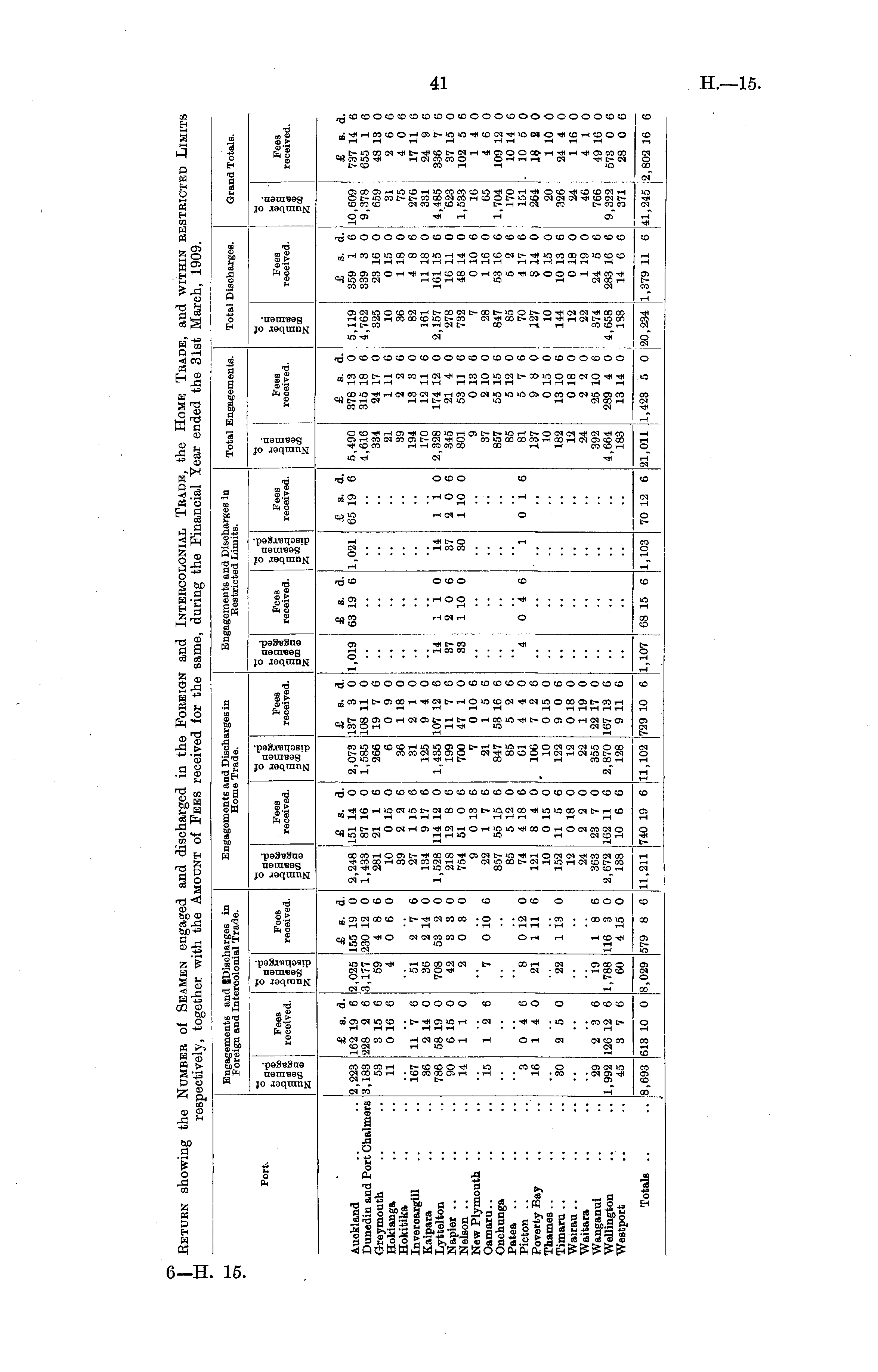 En gas Fori [ements an< sign and Int€ J JDiscl ircolonii [arges in tl Trade. Engagements and Discharges in Home Trade. Engagements ai Restrict* id Disci id Limit larges in ;s. Total Engagements. Total Discharges. Grand TotalB. Port. °Brj rl H O O g DC x a it pen J r5 Fees received. o "d ~ eo U ev h H P ~ eo eo SCC to Fees received. °a« sag r5 o "d Fees S S S Fees received. g =a x received. SCC to rn '"3 HH °ad u eo c? eo a On X H & g c3 be SCC <D Fees received. o „'d a eo h eo DC sec I Fees received. a x8 8$ Pen Fees received. %8 8% Pe/l r5 Fees received. . a Ha a <d Pen Fees received. Auckland Dunedin and Port Chalmers Greymouth Hokianga Hokitika Inveroargill Kaipara Lyttelton Napier Nelson New Plymouth Oamaru Onehunga Patea Picton Poverty Bay Thames Timaru Wairau Waitara Wanganui Wellington Westport 2,223 3,183 53 11 167 36 786 90 14 15 £ s. d. 162 19 6 •228 2 6 3 15 6 0 16 6 11 7 6 2 14 0 58 19 0 6 15 0 110 1 "2 6 2,025 3,177 59 4 51 36 708 42 2 "7 £ s. d. 155 19 0 230 12 0 4 8 6 0 6 0 2 7 6 2 14 0 53 2 0 3 3 0 0 3 0 0 10 6 2,248 1,433 281 10 39 27 134 1,528 218 754 9 22 857 85 74 121 10 152 12 24 363 2,672 138 £ s. d. 151 14 0 87 16 0 21 1 6 0 15 0 2 2 6 1 15 6 9 17 6 114 12 0 12 8 6 51 0 6 0 13 6 17 6 55 15 6 5 12 0 4 18 6 8 4 0 0 15 0 11 5 6 0 18 0 2 2 0 23 7 0 162 11 6 10 6 6 2,073 1,585 266 6 36 31 125 1,435 199 700 7 21 847 85 61 106 10 122 12 22 355 2,870 128 £ a. d. 137 3 0 108 11 0 19 7 6 0 9 0 1 18 0 2 10 9 4 0 107 12 6 11 7 6 47 1 0 0 10 6 15 6 53 16 6 5 2 6 4 4 0 7 2 6 0 15 0 9 0 6 0 18 0 1 19 0 22 17 0 167 13 6 9 11 6 1,019 14 37 33 £ a. d. 63 19 6 110 2 0 6 1 10 0 1,021 14 37 30 £ s. d. 65 19 6 1 1 0 2 0 6 1 10 0 5,490 4,616 334 21 39 194 170 2,328 345 801 9 37 857 85 81 137 10 182 12 24 392 4,664 183 £ s. d. 378 13 0 315 18 6 24 17 0 1 11 6 2 2 6 13 3 0 12 11 6 174 12 0 21 4 0 53 11 6 0 13 6 2 10 0 55 15 6 5 12 0 5 7 6 9 8 0 0 15 0 13 10 6 0 18 0 2 2 0 25 10 6 289 4 0 13 14 0 5,119 . 4,762 325 10 36 82 161 2,157 278 732 7 28 847 85 70 127 10 144 12 22 374 4,658 188 £ s. d. 359 1 6 339 3 0 23 16 0 0 15 0 1 18 0 4 8 6 11 18 0 161 15 6 16 11 0 48 14 0 0 10 6 1 16 0 53 16 6 5 2 6 4 17 6 8 H 0 0 15 0 10 13 6 0 18 0 1 19 0 24 5 6 283 16 6 14 6 6 10,609 9,378 659 31 75 276 331 4,485 623 1,533 16 65 1,704 170 151 264 20 326 24 46 766 9,322 371 £ s. d. 737 14 e 655 1 6 48 13 C 2 6 e 4 0 e. 17 11 e 24 9 e 336 7 £ 37 15 C 102 5 e 1 4 C 4 6 C 109 12 C 10 14 e . 10 5 c 18 2 C 1 10 c 24 4 C 1 16 C 4 1 C 49 16 C 573 0 € 28 0 e o 16 0 4 6 14 0 "e 21 0 12 0 1 11 6 4 0 *4 6 "l 0 16 '30 2 5 0 22 1 13 0 - 29 1,992 45 2 3 6 126 12 6 3 7 6 19 1,788 60 18 6 116 3 0 4 15 0 Totals .. 8,693 613 10 0 8,029 579 8 6 11,211 740 19 6 11,102 729 10 6 1,107 68 15 6 1,103 20,234 1,379 11 6 41,245 2,802 16 6 70 12 6 21,011 1,423 5 0