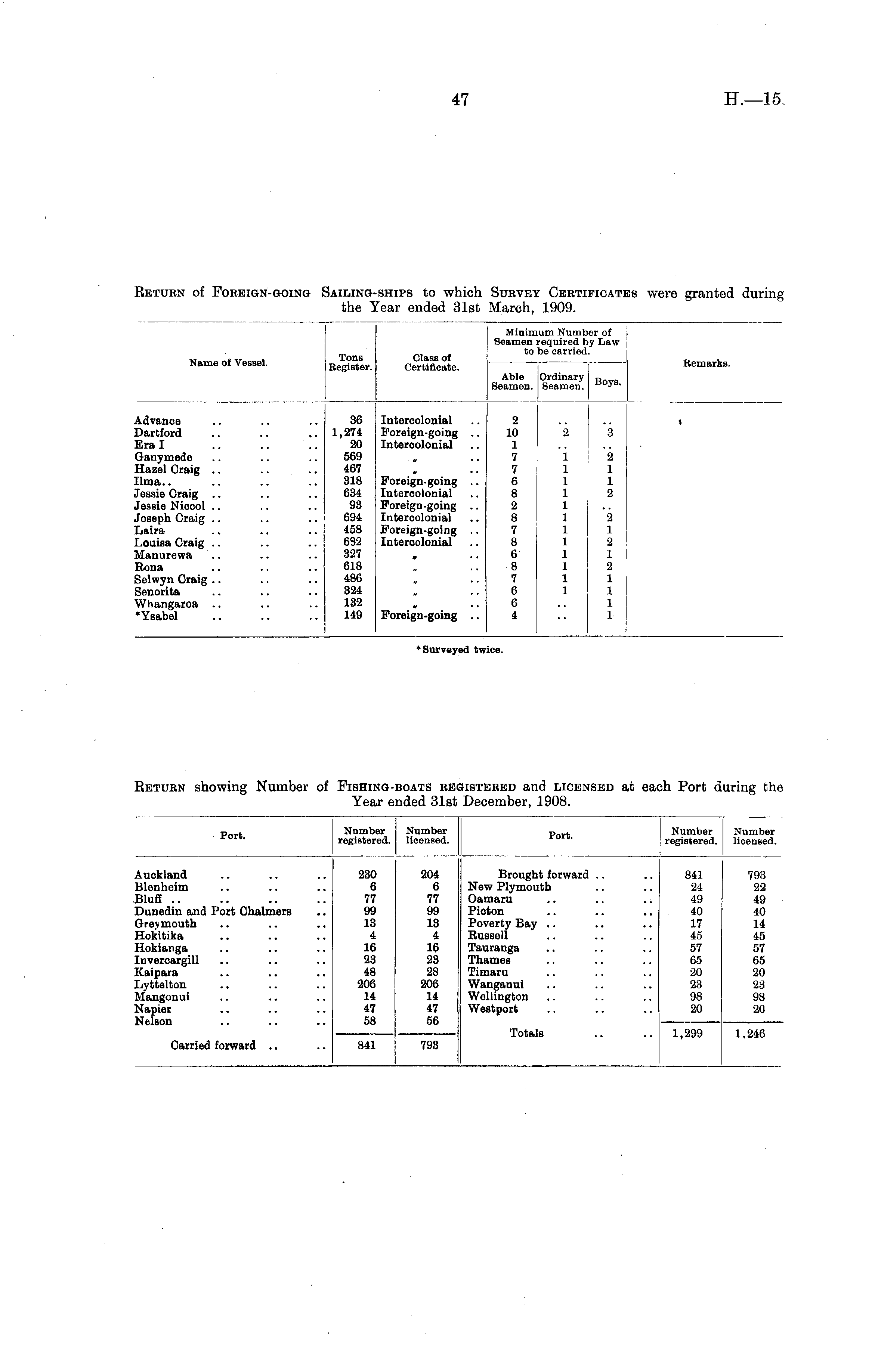Port. Number Number registered. licensed. Port. Number Number registered. licensed. Vuckland Blenheim Jluff .. Dunedin and Port Chalmers Jrey mouth Hokitika lokianga Invercargill < aipara liyttelton \Iangonui Napier Slelson 230 6 77 99 13 4 16 23 48 206 14 47 58 204 6 77 99 13 4 16 23 28 206 14 47 56 Brought forward .. New Plymouth Oamaru Pioton Poverty Bay Russell Tauranga Thames Timaru Wanganui Wellington Westport 841 24 49 40 17 45 57 65 20 23 98 20 793 22 49 40 14 45 57 65 20 23 98 20 841 793 Totals 1,299 1,246 Carried forward ..