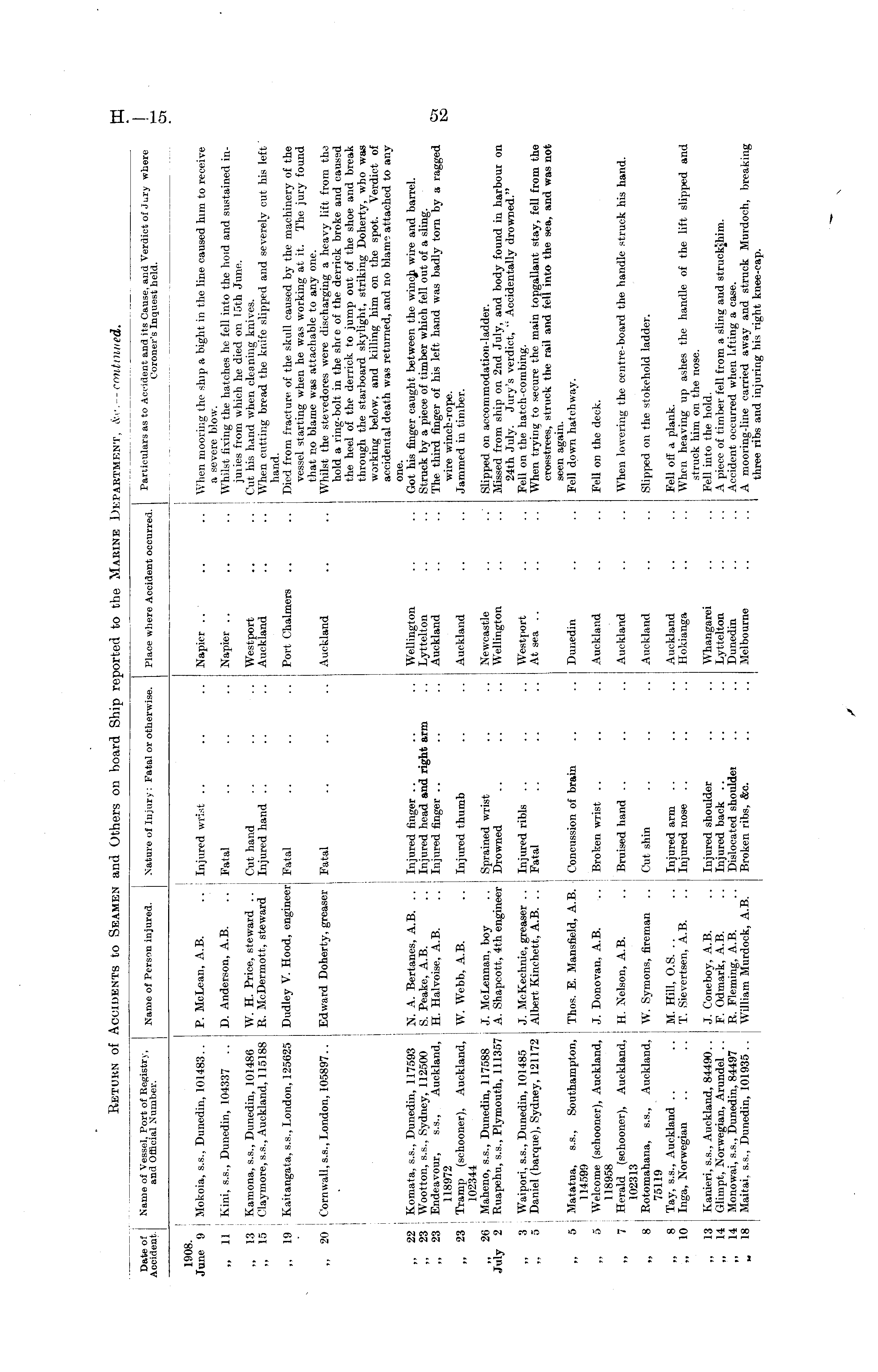 Date of Name of Vessel, Port of Registry, w. mp nf Pprsin inirmWl incident, and Official Number. Jsame ot P erson injured. Nature of Injury-: Fatal or otherwise. Place where Accident occurred. Particulars as to Accident and its Cause, and Verdict of Jury where Coroner's Inquest held. I 1908. June 9 i Mokoia, s.s., Dunedin, 101483.. „ 11 | Kini, s.s., Dunedin, 104337 .. P. McLean, A.B. .. j Injured wrist .. Napier .. Napier .. When mooring the ship a bight in the line caused him to receive a severe blow. Whilst fixing the hatches he fell into the hold and sustained injuiies from which he died on 15th June. Cut his hand when cleaning knives. When cutting bread the knife slipped and severely cut his left hand. Died from fracture; of the skull caused by the machinery of the vessel starting when he was working at it. The jury found that no blame was attachable to any one. Whilst the stevedores were discharging a heavy lift from the hold a ring-bolt in the shre of the derrick broke and caused the heel of the derrick to jump out of the shoe and break through the starboard skylight, striking Doherty, who was working below, and killing him on the spot. Verdict of accidental death was returned, and no blam? attached to any- ' D. Anderson, A.B. .. | Fatal .......... W. H. Price, steward .. Cut hand R. McDermott, steward Injured hand ,, 13 Kamona, s.s., Dunedin, 101486 ,, 15 Claymore, s.s., Auckland, 115188 Westport Auckland .. i ,, 19 Kaitangata, s.s., London, 125625 Dudley V. Hood, engineer Fatal Edward Doherty, greaser Fatal Port Chalmers „ 20 Cornwall, s.s., London, 105897.. . Auckland i • ,, 22 i Komata, s.s., Dunedin, 117593 „ 23 ; Wootton, s.s., Sydney, 112500 ,, 23 i Endeavour, s.s., Auckland, 118972 „ 23 I Tramp (schooner), Auckland, 102344 ,, 26 ; Maheno, s.s., Dunedin, 117588 July 2 : Ruapehu, s.s., Plymouth, 111357 N. A. Bertanes, A.B. .. Injured finger .. S. Peake, A.B. .. Injured head and right arm H. Halvoise, A.B. .. Injured finger .. W. Webb, A.B. .. Injured thumb Wellington Lyttelton Auckland one. Got his finger caught between the wincjp. wire and barrel. Struck by a piece of timber which fell out of a sling. The third finger of his left hand was badly torn by a ragged wire winch-rope. Jammed in timber. Auckland J. MeLennan, boy .. Sprained wrist A. Shapcott, 4th engineer Drowned J. McKechnie, greaser .. Injured ribls Albert Kinchett, A.B. .. Fatal Newcastle Wellington Slipped on accommodation-ladder. Missed from ship on 2nd July, and body found in harbour on 24th July. Jury's verdict, " Accidentally drowned." Fell on the hatch-combing. When trying to secure the main topgallant stay, fell from the crosstrees, struck the rail and fell into the sea, and was not seen again. Fell down hatchway. ,, 3 Waipori, s.s., Dunedin, 101485 „ 5 Daniel (barque), Sydney, 121172 Westport At sea . . „ 5 Matatua, s.s., Southampton, 114599 ,, 5 Welcome (schooner), Auckland, 118958 ,, 7 ' Herald (schooner), Auckland, 102313 ,, 8 Rotomahana, s.s., Auckland, 75119 Thos. E. Mansfield, A.B. Concussion of brain Dunedin J. Donovan, A.B. .. Broken wrist .. Auckland Fell on the deck. ! H. Nelson, A.B. .. Bruised hand .. Auckland When lowering the centre-board the handle struck his hand. W. Symons, fireman .. Cut shin Auckland Slipped on the stokehold ladder. ,, 8 Tay, s.s., Auckland . . ,, 10 Inga, Norwegian M. Hill, O.S. .. .. Injured arm T. Sievertsen, A.B. .. Injured nose Auckland Hokianga Fell off a plank. When heaving up ashes the handle of the lift slipped and struck him on the nose. Fell into the hold. A piece of timber fell from a sling and struckUiim. Accident occurred when lifting a case. A mooring-line carried away and struck Murdoch, breaking three ribs and injuring his right knee-cap. ,, 13 Kanieri, s.s., Auckland, 84490.. „ 14 Glimpt, Norwegian, Arundel .. „ 14 Monowai, s.s., Dunedin, 84497 „ 18 Maitai, s.s., Dunedin, 101935 .. J. Coneboy, A.B. .. Injured shoulder F. Odmark, A.B. .. Injured back .. R. Fleming, A.B. .. Dislocated shouldei William Murdock, A.B. Broken ribs, &e. Whangarei Lyttelton Dunedin Melbourne