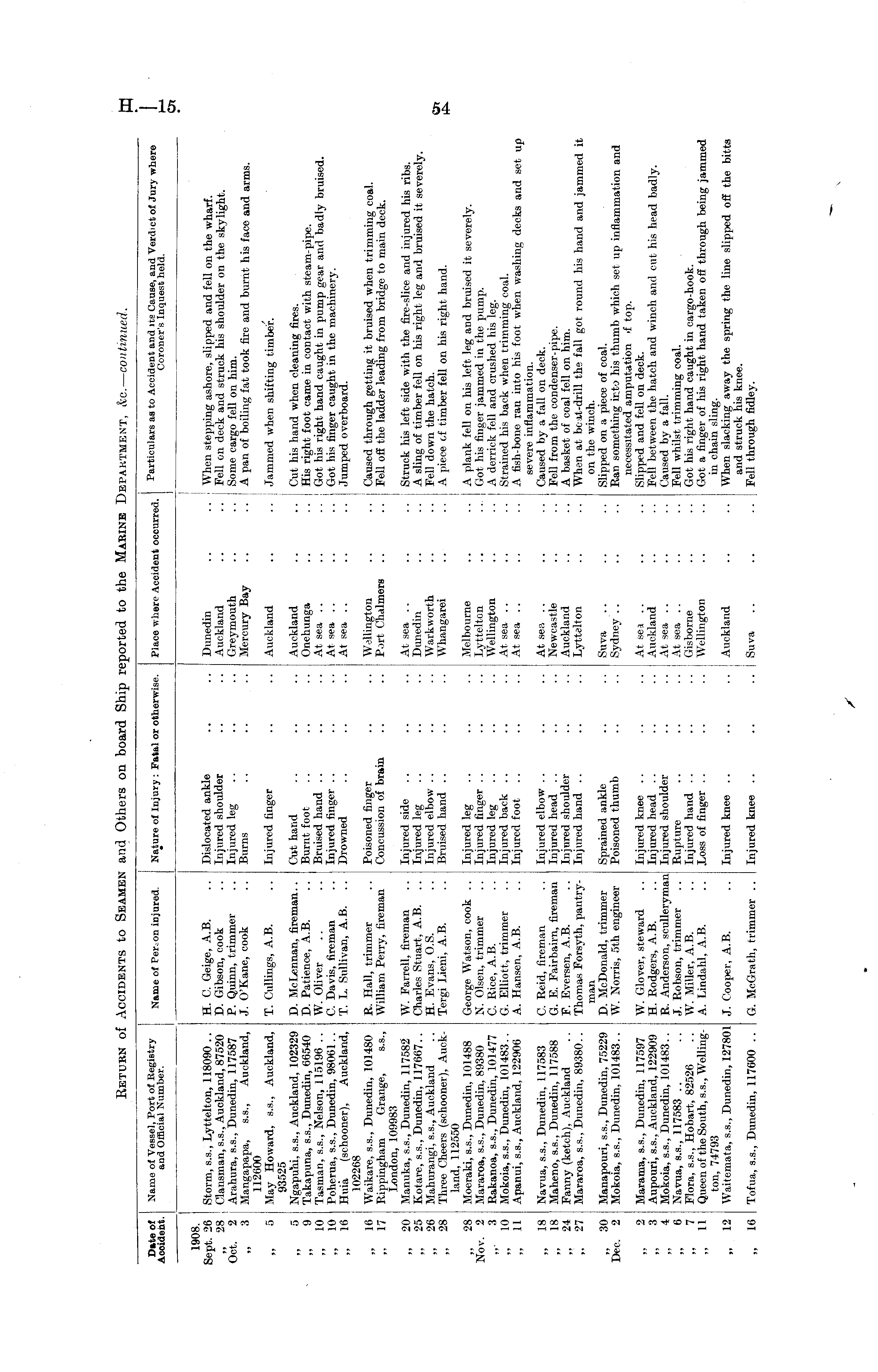 Date of Name of Vessel, Port of Registry Acoident. and Official Number. Name of Person injured. Nature of Injury : Fatal or otherwise. Place where Accident occurred. Particulars as to Accident and its Cause and Verdict of Jury where Coroner s Inquest held. 1908. Sept. 26 „ 28 Oct. 2 „ 3 .Storm, s.s., Lyttelton, 118090 .. Clansman, s.s., Auckland, 87520 Arahura, s.s., Dunedin, 117587 Mangapapa, s.s., Auckland, 112600 May Howard, s.s., Auckland, 93525 Ngapuhi, s.s., Auckland, 102329 Takapuna, s.s., Dunedin, 66540 Tasman, s.s., Nelson, 115196 .. Poherua, s.s., Dunedin, 98061.. Huia (schooner), Auckland, 102268 Waikare, s.s., Dunedin, 101480 Rippingham Grange, s.s., London, 109983 Manuka, s.s., Dunedin, 117582 Kotare, s.s., Dunedin, 117667.. Mahurangi, s.s., Auckland Three Cheers (schooner), Auckland, 112550 lloeraki, s.s., Dunedin, 101488 Mararoa, s.s., Dunedin, 89380 Rakanoa, s.s., Dunedin, 101477 Mokoia, s.s., Dunedin, 101483.. Apanui, s.s., Auckland, 122906 H. C. Geige, A.B. D. Gibson, cook P. Quinn, trimmer J. O'Kane, cook Dislocated ankle Injured shoulder Injured leg Burns Dunedin Auckland Greymouth Mercury Bay .. i When stepping ashore, sli pped and fell on the wharf. Fell on deck and struck his shoulder on the skylight. Some cargo fell on him. A pan of boiling fat took fire and burnt h is face and arms. „ 5 T. Cullings, A.B. Injured finger Auckland .. j Jammed when shifting timber. 5 9 „ 10 „ 10 „ 16 D. MeLennan, fireman.. D. Patience, A.B. W. Oliver C. Davis, fireman T. L. Sullivan, A.B. .. Cut hand Burnt foot Bruised hand .. Injured finger .. Drowned Auckland Onehunga At sea .. At sea .. At sea .. Cut his hand when cleaning fires. .. I His right foot came in contact with steam-pipe. Got his right hand caught in pump gear and badly bruised. .. i Got his finger caught in the machinery. .. I Jumped overboard. „ 16 „ 17 R. Hall, trimmer William Perry, fireman Poisoned finger Concussion of brain Wellington Port Chalmers .. : Caused through getting it bruised when trimming coal. .. j Fell off the ladder leading from bridge to main deck. „ 20 „ 25 „ 26 „ 28 W. Farrell, fireman Charles Stuart, A.B. . . H. Evans, O.S. Tergi Lieni, A.B. Injured side Injured leg Injured elbow .. Bruised hand .. At sea .. Dunedin Warkworth Whangarei Struck his left side with the fire-slice and injured his ribs. A sling of timber fell on his right leg and bruised it severely. Fell down the hatch. A piece of timber fell on his right hand. „ 28 Nov. 2 „ 3 „ 10 „ 11 George Watson, cook .. N. Olsen, trimmer C. Rice, A.B. G. Elliott, trimmer A. Hansen, A.B. Injured leg Inj ured finger .. Injured leg Injured back .. Injured foot Melbourne Lyttelton Wellington At sea .. At sea .. At sea .. Newcastle Auckland Lyttelton Suva Sydney .. At sea .. Auckland At sea .. At sea .. Gisborne Wellington Auckland Suva .. j A plank fell on his left leg and bruised it severely. ... | Got his finger jammed in the pump. .. I A derrick fell and crushed his leg. Strained his back when trimming coal. A fish-bone ran into his foot when washing decks and set up severe inflammation. Caused by a fall on deck. Fell from the condenser- pipe. A basket of coal fell on him. When at beat-drill the fall got round his hand and jammed it on the winch. Slipped on a piece of coal. Ran something into his thumb which set up inflammation and necessitated amputation ,f top. Slipped and fell on deck. Fell between the hatch and winch and cut his head badly. Caused by a fall. Fell whilst trimming coal. Got his right hand caught in cargo-hook. Got a finger of his right hand taken off through being jammed in chain sling. When slacking away the spring the line slipped off the bitts and struck his knee. .. Fell through fidley. „ 18 „ 18 „ 24 „ 27 Navua, s.s., Dunedin, 117583 Maheno, s.s., Dunedin, 117588 Fanny (ketch), Auckland Mararoa, s.s., Dunedin, 89380.. C. Reid, fireman G. E. Fairbairn, fireman F. Eversen, A.B. Thomas Forsyth, pantryman D. McDonald, trimmer W. Norris, 5th engineer Injured elbow . . Injured head .. Injured shoulder Injured hand .. „ 30 Dec. 2 Manapouri, s.s., Dunedin, 75229 Mokoia, s.s., Dunedin, 101483.. Sprained ankle Poisoned thumb 2 3 6 7 „ 11 Marama, s.s., Dunedin, 117597 Aupouri, s.s., Auckland, 122909 Mokoia, s.s., Dunedin, 101483.. Navua, s.s., 117583 .. Flora, s.s., Hobart, 82526 Queen of the South, s.s., Wellington, 74793 Waitemata, s.s., Dunedin, 127801 W. Glover, steward H. Rodgers, A.B. R. Anderson, sculleryman J. Robson, trimmer W. Miller, A.B. A. Lindahl, A.B. Injured knee .. Injured head .. Injured shoulder Rupture Injured hand . . Loss of finger .. „ 12 J. Cooper, A.B. Injured knee .. „ 16 Tofua, s.s., Dunedin, 117600 .. G. McGrath, trimmer .. Injured knee .. .. I