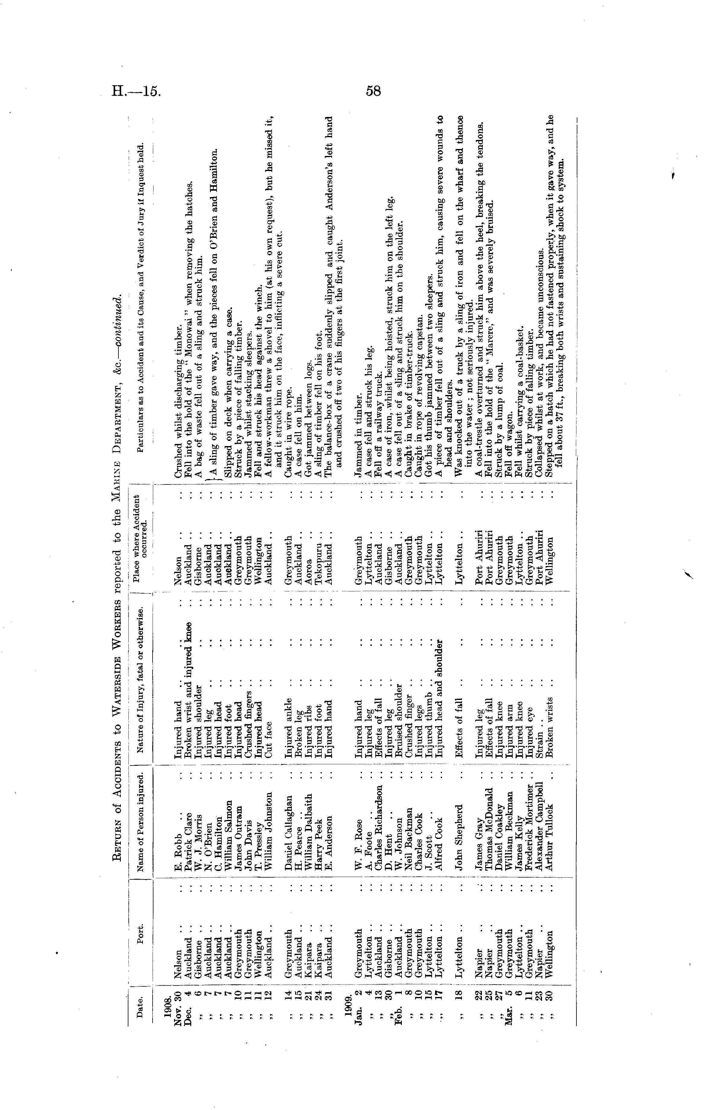 Date. Port. Name of Person injured. Nature of Injury, fatal or otherwise. Place where Accident Particulars as to Accident and its Cause, and Verdict of Jury if Inquest held. r 1908. Nov. 30 Nelson Dec. 4 Auckland .. ,, 6 Gisborne . . ,, 7 Auckland .. ,, 7 Auckland .. „ 7 Auckland .. ,, 10 Greymouth ,, 11 Greymouth 11 Wellington ,, 12 Auckland .. E. Robb .. .. Injured hand Patrick Clare . . Broken wrist and injured knee W. J. Morris .. Injured shoulder N. O'Brien .. j Injured leg C. Hamilton .. Injured head William Salmon .. Injured foot James Outram .. Injured head John Davis .. I Crushed fingers .. T. Pressley .. Injured head William Johnston .. Cut face Daniel Callaghan .. Injured ankle H. Pearce .. . . Broken leg William Dalbaith .. Injured ribs Harry Peek .. Injured foot E. Anderson .. Injured hand Nelson .. .. Crushed whilst discharging timber. Auckland .. .. Fell into the hold of the " Monowai " when removing the hatches. .. ! Gisborne .. .. A bag of waste fell out of a sling and struck him. Auckland s ' m 8 timber gave way, and the pieces fell on O'Brien and Hamilton. Auckland .. .. Slipped on deck when carrying a case. Greymouth .. Struck by a piece of falling timber. Greymouth .. j Jammed whilst stacking sleepers. Wellington . . Fell and struck his head against the winch. Auckland .. . . A fellow-workman threw a shovel to him (at his own request), but he missed it, and it struck him on the face, inflicting a severe cut. Greymouth . . Caught in wire rope. Auckland .. A case fell on him. Aoroa .. .. Got jammed between logs. Tekopuru .. .. A sling of timber fell on his foot. Auckland .. .. The balance-box of a crane suddenly slipped and caught Anderson's left hand and crushed off two of his fingers at the first joint. ,, 14 Greymouth ,, 15 Auckland .. ,, 21 Kaipara .. ,, 24 Kaipara .. ,, 31 Auckland .. 1909. Jan. 2 Greymouth ,, 4 Lyttelton .. ,, 13 Auckland .. „ 30 Gisborne . . Feb. 1 [ Auckland .. ,, 8 Greymouth ,, 10 Greymouth ,, 15 Lyttelton .. ,, 17 Lyttelton .. I W. F. Rose .. i Injured hand A. Foote .. .. Injured leg Charles Richardson .. Effects of fall .. D. Hent .. .. Injured leg AV. Johnson .. I Bruised shoulder Neil Backman .. Crushed finger Charles Cook .. Injured legs J. Scott .. .. Injured thumb Alfred Cook .. Injured head and shoulder John Shepherd .. Effects of fall James Gray .. Injured leg Thomas McDonald .. Effects of fall Daniel Coakley .. Injured knee William Beckman .. Injured arm James Kelly .. Injured knee Frederick Mortimer . . Injured eye Alexander Campbell Strain Arthur Tullock .. Broken wrists .. .... Greymouth . . Jammed in timber. Lyttelton .. ., A case fell and struck his leg. Auckland .. .. i Fell off a railway truck. Gisborne .. .. I A case of iron, whilst being hoisted, struck him on the left leg. Auckland . . .. A case fell out of a sling and struck him on the shoulder. Greymouth .. Caught in brake of timber-truck. Greymouth .. Caught in rope of revolving capstan. Lyttelton .. .. Got his thumb jammed between two sleepers. Lyttelton .. .. A piece of timber fell out of a sling and struck him, causing severe wounds to head and shoulders. Lyttelton .. .. Was knocked out of a truck by a sling of iron and fell on the wharf and thence into the water ; not seriously injured. Port Ahuriri .. A coal-trestle overturned and struck him above the heel, breaking the tendons. Port Ahuriri . .. Fell into the hold of the " Marere," and was severely bruised. Greymouth .. | Struck by a lump of coal. Greymouth .. Fell off wagon. Lyttelton .. .. Fell whilst carrying a coal-basket. Greymouth .. Struck by piece of falling timber. Port Ahuriri .. Collapsed whilst at work, and became unconscious. Wellington .. Stepped on a hatch which he had not fastened properly, when it gave way, and he fell about 37 ft., breaking both wrists and sustaining shock to system. „ 18 Lyttelton .. „ 22 Napier ,, 25 Napier „ 27 | Greymouth Mar. 5 ; Greymouth ,, 6 [ Lyttelton .. ,, 11 I Greymouth ,, 23 Napier „ 30 Wellington