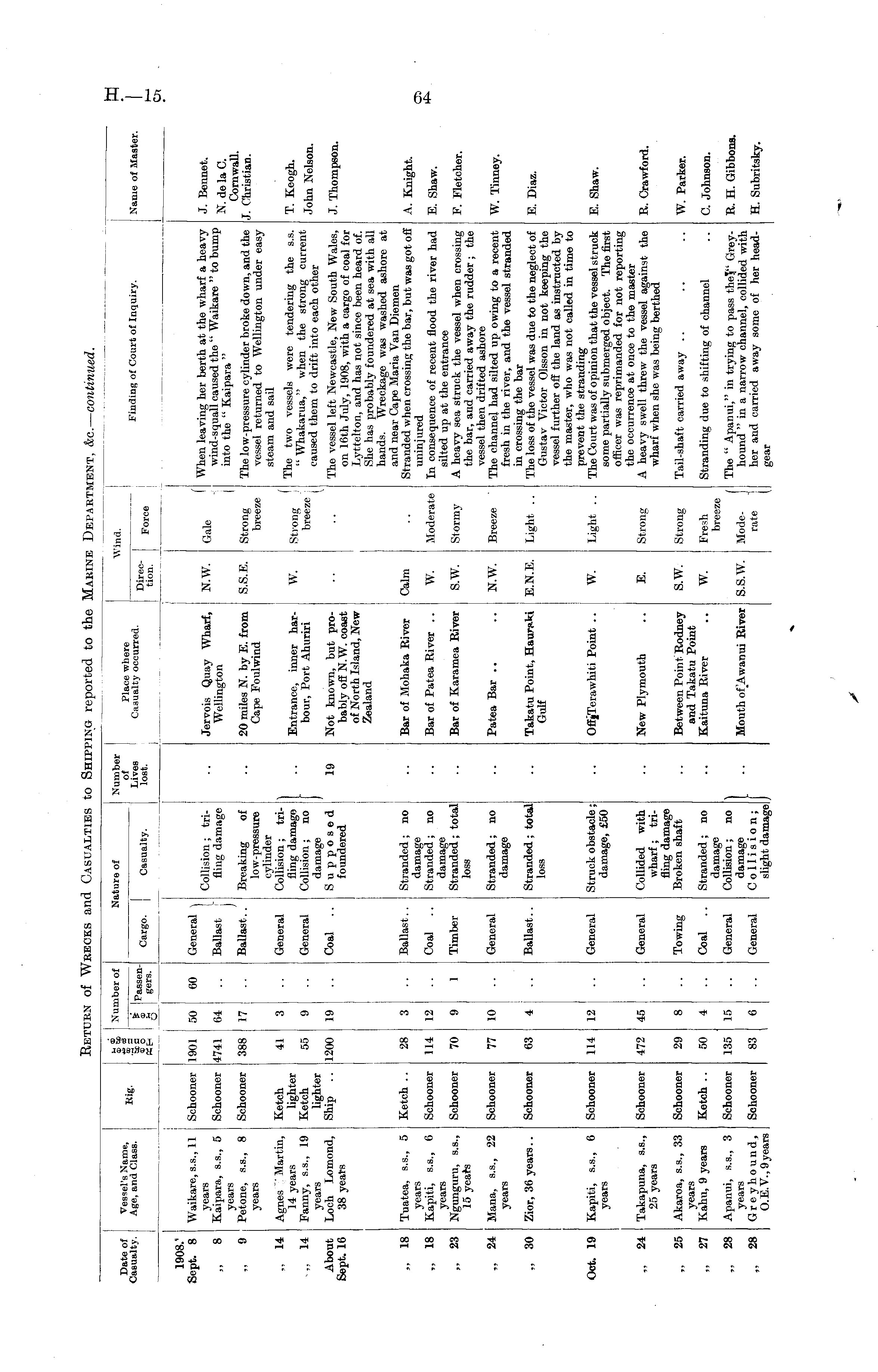 Date of Jasualty. Vessel's Name, Age, and Class. Kig. * si CO CO Nui iber of Nature of Number Place where Casualty occurred. Direction. ind. Finding of Court of Inquiry. Name of Master. ■H = eo o eo H Passengers. Cargo. Casualty. Lives lost. Force i 1908.' Sept. 8 Waikare, s.s., 11 years Kaipara, s.s., 5 years Petone, s.s., 8 years Schooner 1901 50 (50 General \ Ballast When leaving her berth at the wharf a heavy wind-squall caused the " Waikare " to bump into the " Kaipara " Collision ; trifling damage Jervois Quay Wharf, Wellington Gale J. Bennet. „ 8 Schooner 4741 04 N.W. N. de la C. Cornwall. J. Christian. S.S.E. I „ 9 Schooner 388 17 Ballast.. Breaking of low-pressure cylinder Collision; trifling damage Collision ; no ' damage Supposed foundered 20 miles N. by E. from Cape Foulwind Strong breeze The low-pressure cylinder broke down, and the vessel returned to Wellington under easy steam and sail „ 14 Agnes " Martin, 14 years Fanny, s.s., 19 years Loch Lomond, 38 yeafs Ketch lighter Ketch lighter Ship .. 41 3 General I Entrance, inner harbour, Port Ahuriri W. Strong breeze The two vessels were tendering the s.s. " Whakarua," when the strong current caused them to drift into each other T. Keogh. „ 14 55 9 General John Nelson. About Sept. 16 1200 19 Coal .. 19 Not known, but probably off N.W. coast of North Island, New Zealand The vessel left Newcastle, New South Wales, on 16th July, 1908, with a cargo of coal for Lyttelton, and has not since been heard of. She has probably foundered at sea with all hands. Wreckage was washed ashore at and near Cape Maria Van Diemen Stranded when crossing the bar, but was got off uninjured In consequence of recent flood the river had silted up at the entrance A heavy sea struck the vessel when crossing the bar, and carried away the rudder; the vessel then drifted ashore The channel had silted up owing to a recent fresh in the river, and the vessel stranded in crossing the bar The loss of the vessel was due to the neglect of Gustav Victor Olsson in not keeping the vessel further off the land as instructed by the master, who was not called in time to prevent the stranding The Court was of opinion that the vessel struck some partially submerged object. The first officer was reprimanded for not reporting the occurrence at once to the master A heavy swell threw the vessel against the wharf when she was being berthed J. Thompson. Tuatea, s.s., 5 years Kapiti, s.s., 6 years Ngunguru, s.s., 15 yeafs Stranded; no damage Stranded; no damage Stranded ; total loss Bar of Mohaka River A. Knight. 18 Ketch .. 28 3 Ballast.. Calm 18 Schooner 114 12 Coal .. Bar of Patea River .. W. Moderate E. Shaw. 23 Schooner 70 9 1 Timber Bar of Karamea River S.W. Stormy F. Fletcher. 24 Mana, s.s., 22 years Schooner 77 10 General Stranded; no damage Patea Bar N.W. Breeze W. Tinney. 30 Zior, 36 years.. Schooner 63 Ballast.. Stranded ; total loss Takatu Point, Haurpki Gulf E.N.E. Light .. E. Diaz. Kapiti, s.s., 6 years Schooner 114 General Struck obstacle; damage, £50 OffjTerawhiti Point .. Light .. E. Shaw. Oct. 19 12 w. „ 24 Takapuna, s.s., 25 years Schooner 472 45 General Collided with wharf; trifling damage Broken shaft New Plymouth E. Strong R. Crawford. „ 25 Akaroa, s.s., 33 years Kahu, 9 years Schooner 29 8 Towing Between Point Rodney and Takatu Point Kaituna River S.W. Strong Tail-shaft carried away W. Parker. „ 27 Ketch .. 50 4 Coal .. Stranded; no damage Collision; no damage Collision; slight damage W. Fresh breeze Stranding due to shifting of channel C. Johnson. „ 28 Apanui, s.s., 3 years Gr e yhound, O.E.V.,9years Schooner 135 15 General 1 Mouth of Awanui River S.S.W. Moderate The " Apanui," in trying to pass theH" Greyhound " in a narrow channel, collided with her and carried away some of her headR. H. Gibbons. „ 28 Schooner 83 6 General H. Subritsky. gear