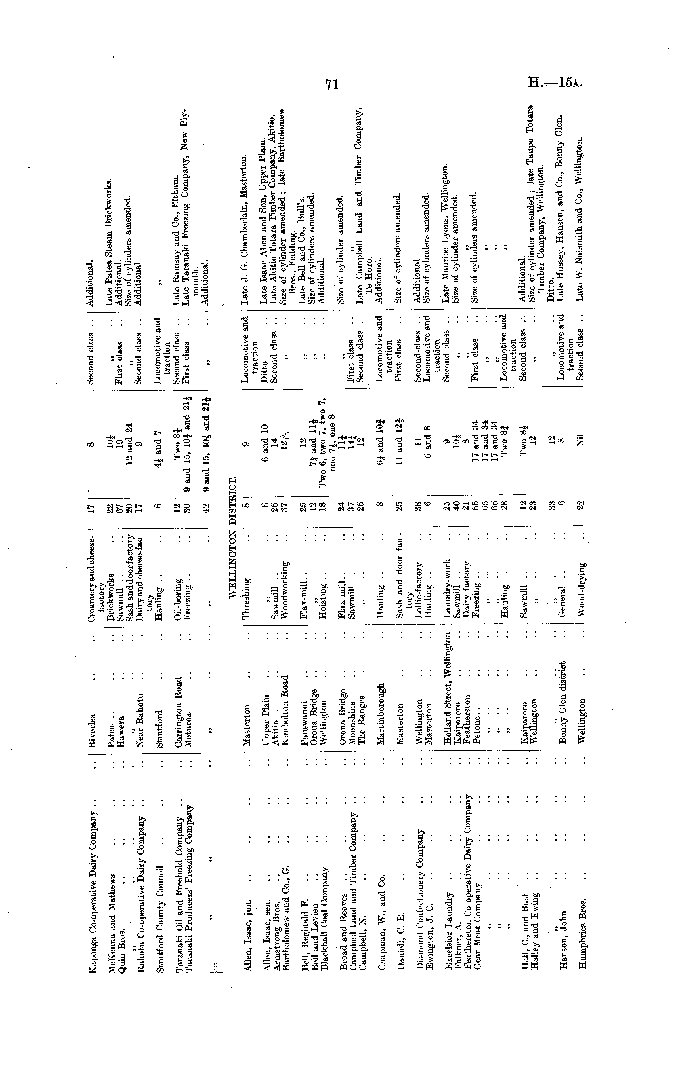 Kaponga Co-operative Dairy Company .. Riverlea Creamery and cheese- 17 factory Brickworks .. 22 Sawmill .. .. 67 Sash and door factory 20 Dairy and cheese-fac- 17 tory Hauling .. .. 6 8 Second class .. Additional. McKenna and Mathews Quin Bros. Patea Hawera 19 12 and 24 9 First class Second class .. Late Patea Steam Brickworks. Additional. Size of cylinders amended. Additional. Rahotu Co-operative Dairy Company .. Near Rahotu Stratford County Council Stratford 44 and 7 Locomotive and traction Second class .. First class Late Ramsay and Co., Eltham. Late Taranaki Freezing Company, New Plymouth. Additional. Taranaki Oil and Freehold Company .. Taranaki Producers' Freezing Company Carrington Road Moturoa Oil-boring .. 12 Freezing .. .. 30 Two 8J 9 and 15, 10J and 21J [-=, 42 9 and 15, K>£ and 214 WELLINGTON DIST] SOT. Allen, Isaac, jun. .. .. Allen, Isaac, sen. Armstrong Bros. Bartholomew and Co., G. Masterton Upper Plain Akitio Kimbolton Road Threshing .. 8 ..6 Sawmill .. .. 25 Woodworking .. 37 9 6 and 10 14 Locomotive and traction Ditto Second class .. Late J. G. Chamberlain, Masterton. Late Isaac Allen and Son, Upper Plain. Late Akitio Totara Timber Company, Akitio. Size of cylinder amended; late Bartholomew Bros., Feilding. Late Bell and Co., Bull's. Size of cylinders amended. Additional. Bell, Reginald F. Bell and Levien Blackball Coal Company Parawanui Oroua Bridge Wellington Flax-mill.. .. 25 ..12 Hoisting . . .. 18 12 7i and 11$ Two 6, two 7, two 7, one 74, one 8 Hi 12 Broad and Reeves Campbell Land and Timber Company .. Campbell, N. Oroua Bridge Moonshine The Ranges Flax-mill. . .. 24 Sawmill . . .. 37 25 First class Second class .. Locomotive and traction First class Size of cylinder amended. Late Campbell Land and Timber Company, Te Horo. Additional. Size of cylinders amended. Chapman, W., and Co. Martinborough .. Hauling . . .. 8 6J and lOf Daniell, C. E. Diamond Confectionery Company Ewington, J. C. llasterton Wellington Masterton Sash and door fac - 25 tory Lollie-factory .. 38 Hauling . . .. 6 11 and 12f 11 5 and 8 Second-class .. Locomotive and traction Second class .. Additional. Size of cylinders amended. Late Maurice Lyons, Wellington. Size of cylinder amended. Excelsior Laundry Falkner, A. Featherston Co-operative Dairy Company Gear Meat Company Holland Street, Wellington Kaiparoro Featherston Petone. . Laundry-work .. 25 Sawmill .. .. 40 Dairy factory .. 21 Freezing .. .. 65 65 65 Hauling .. .. 28 9 10| 8 17 and 34 17 and 34 17 and 34 Two 8| First class Size of cylinders amended. ..I „ Hall, C, and Bust Halley and Ewing ,, Kaiparoro Wellington Sawmill . . .. 12 23 Two 84 12 Locomotive and traction Second class .". Locomotive and traction Second class .. Additional. Size of cylinder amended ; late Taupo Totara Timber Company, Wellington. Ditto. Late Hussey, Hansen, and Co., Bonny Glen. Late W. Naismith and Co., Wellington. Hanson, John Bonny Glen district 33 General .. .. 6 12 8 Humphries Bros. Wellington Wood-drying .. 22 Nil