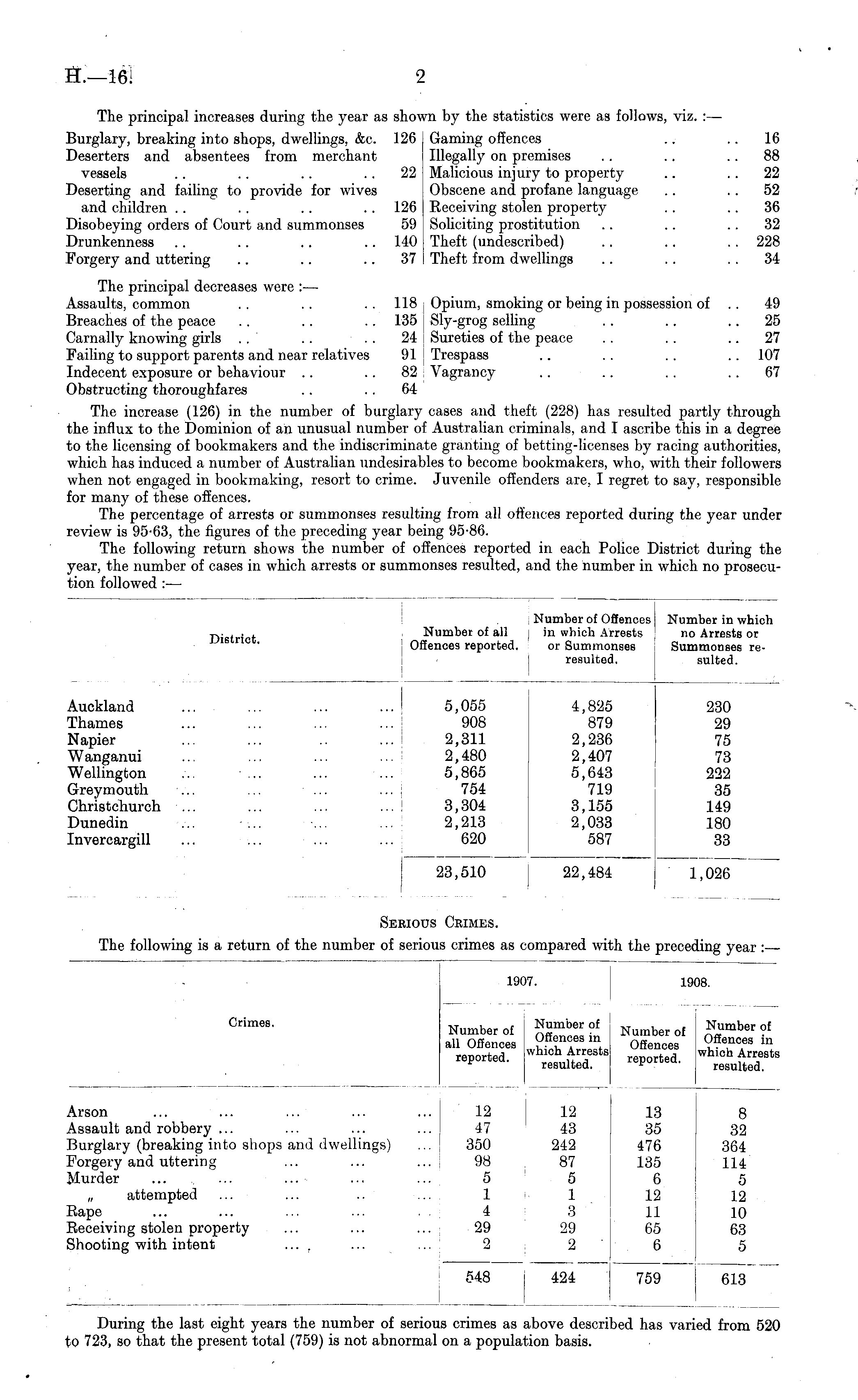 The principal increases during the year as shown by the statistics were as follows, viz. :— Burglary, breaking into shops, dwellings, &c. 126 | Gaming offences . . . . 16 Deserters and absentees from merchant i Illegally on premises .. .. 88 vessels .. .. .. 22 Malicious injury to property .. . . 22 Deserting and failing to provide for wives Obscene and profane language .. . . 52 and children . . . . .. 126 Receiving stolen property . . .. 36 Disobeying orders of Court and summonses 59 Soliciting prostitution .. .. 32 Drunkenness .. .. .. .. 140 Theft (undescribed) .. .. .. 228 Forgery and uttering .. .. .. 37 Theft from dwellings .. .. 34 The principal decreases were : — Assaults, common .. .. ..118 Opium, smoking or being in possession of .. 49 Breaches of the peace .. .. .. 135 j Sly-grog selling . . . . 25 Carnally knowing girls . . .. . . 24 Sureties of the peace . . . . 27 Failing to support parents and near relatives 91 Trespass .. .. .. .. 107 Indecent exposure or behaviour . . .. 82 Vagrancy .. .. . . 67 Obstructing thoroughfares .. .. 64 The increase (126) in the number of burglary cases and theft (228) has resulted partly through the influx to the Dominion of an unusual number of Australian criminals, and I ascribe this in a degree to the licensing of bookmakers and the indiscriminate granting of betting-licenses by racing authorities, which has induced a number of Australian undesirables to become bookmakers, who, with their followers when not engaged in bookmaking, resort to crime. Juvenile offenders are, I regret to say, responsible for many of these offences. The percentage of arrests or summonses resulting from all offences reported during the year under review is 95-63, the figures of the preceding year being 95-86. The following return shows the number of offences reported in each Police District during the year, the number of cases in which arrests or summonses resulted, and the number in which no prosecution followed : —
