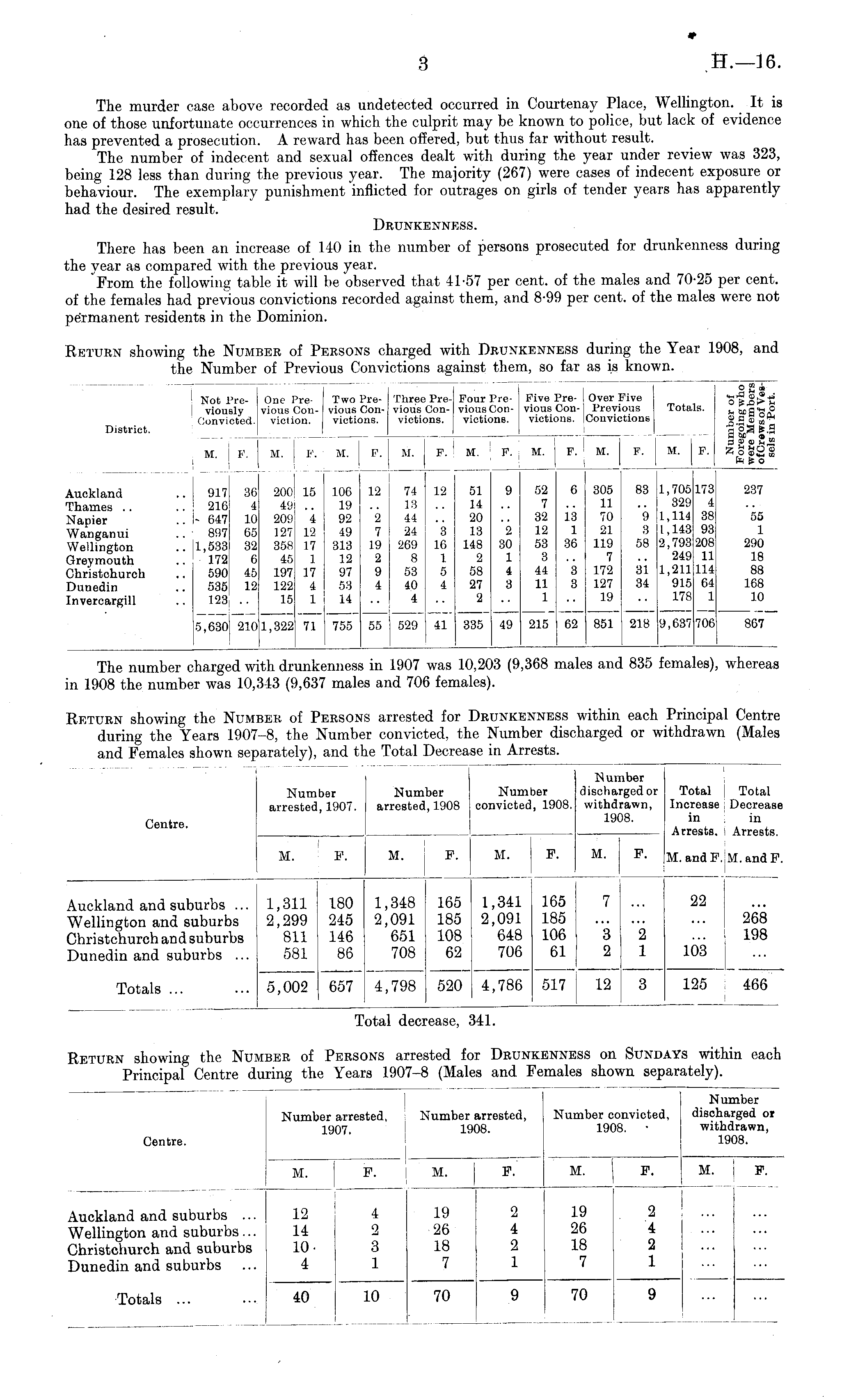The murder case above recorded as undetected occurred in Courtenay Place, Wellington. It is one of those unfortunate occurrences in which the culprit may be known to police, but lack of evidence has prevented a prosecution. A reward has been offered, but thus far without result. The number of indecent and sexual offences dealt with during the year under review was 323, being 128 less than during the previous year. The majority (267) were cases of indecent exposure or behaviour. The exemplary punishment inflicted for outrages on girls of tender years has apparently had the desired result. Drunkenness. There has been an increase of 140 in the number of persons prosecuted for drunkenness during the year as compared with the previous year. "From the following table it will be observed that 41-57 per cent, of the males and 70-25 per cent, of the females had previous convictions recorded against them, and 8-99 per cent, of the males were not permanent residents in the Dominion. Return showing the Number of Persons charged with Drunkenness during the Year 1908, and the Number of Previous Convictions against them, so far as is known.
