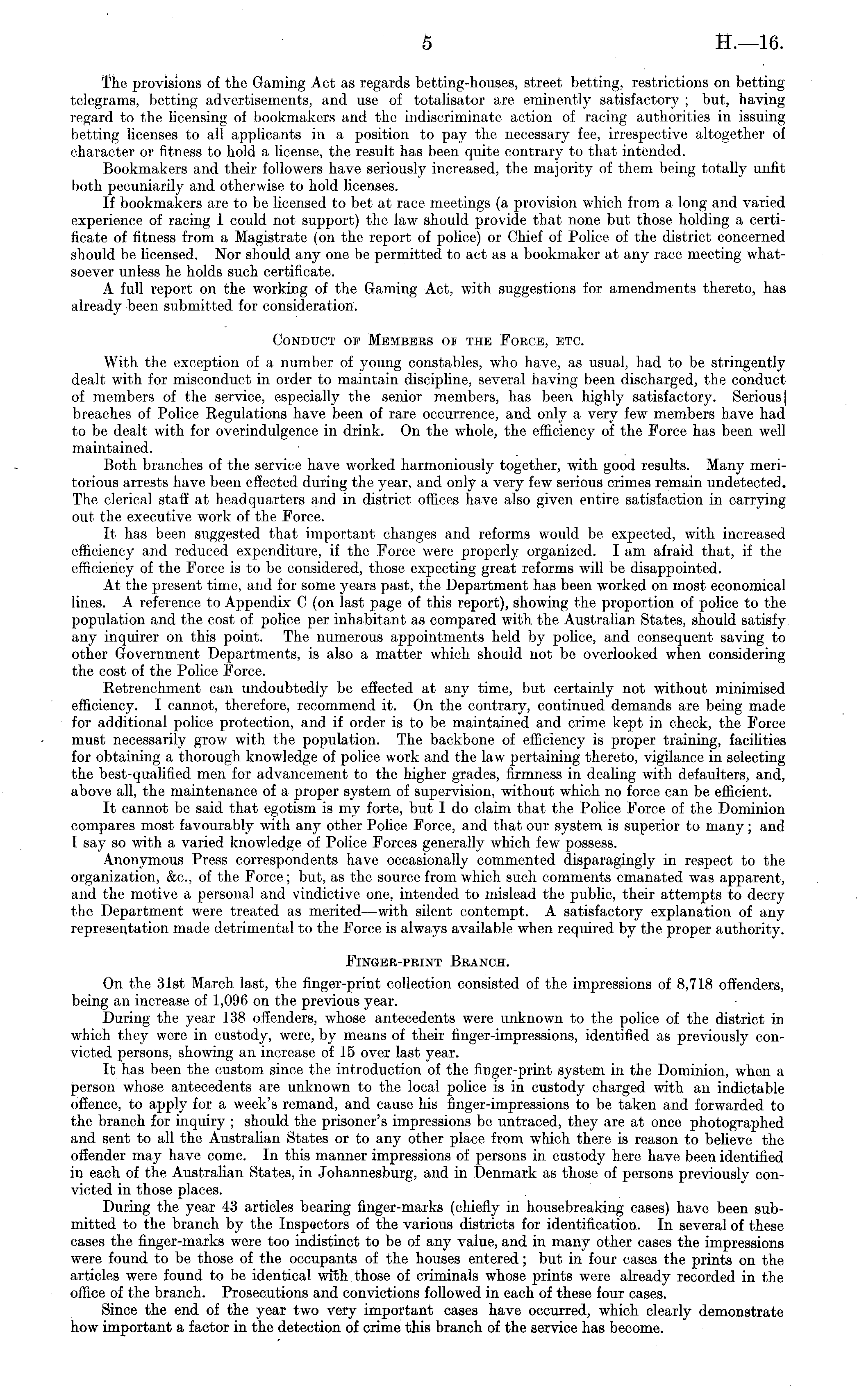 The provisions of the Gaming Act as regards betting-houses, street betting, restrictions on betting telegrams, betting advertisements, and use of totalisator are eminently satisfactory ; but, having regard to the licensing of bookmakers and the indiscriminate action of racing authorities in issuing betting licenses to all applicants in a position to pay the necessary fee, irrespective altogether of character or fitness to hold a license, the result has been quite contrary to that intended. Bookmakers and their followers have seriously increased, the majority of them being totally unfit both pecuniarily and otherwise to hold licenses. If bookmakers are to be licensed to bet at race meetings (a provision which from a long and varied experience of racing I could not support) the law should provide that none but those holding a certificate of fitness from a Magistrate (on the report of police) or Chief of Police of the district concerned should be licensed. Nor should any one be permitted to act as a bookmaker at any race meeting whatsoever unless he holds such certificate. A full report on the working of the Gaming Act, with suggestions for amendments thereto, has already been submitted for consideration. Conduct of Members oi the Force, etc. With the exception of a number of young constables, who have, as usual, had to be stringently dealt with for misconduct in order to maintain discipline, several having been discharged, the conduct of members of the service, especially the senior members, has been highly satisfactory. Serious | breaches of Police Regulations have been of rare occurrence, and only a very few members have had to be dealt with for overindulgence in drink. On the whole, the efficiency of the Force has been well maintained. Both branches of the service have worked harmoniously together, with good results. Many meritorious arrests have been effected during the year, and only a very few serious crimes remain undetected. The clerical staff at headquarters and in district offices have also given entire satisfaction in carrying out the executive work of the Force. It has been suggested that important changes and reforms would be expected, with increased efficiency and reduced expenditure, if the Force were properly organized. lam afraid that, if the efficiency of the Force is to be considered, those expecting great reforms will be disappointed. At the present time, and for some years past, the Department has been worked on most economical lines. A reference to Appendix C (on last page of this report), showing the proportion of police to the population and the cost of police per inhabitant as compared with the Australian States, should satisfy any inquirer on this point. The numerous appointments held by police, and consequent saving to other Government Departments, is also a matter which should not be overlooked when considering the cost of the Police Force. Retrenchment can undoubtedly be effected at any time, but certainly not without minimised efficiency. I cannot, therefore, recommend it. On the contrary, continued demands are being made for additional police protection, and if order is to be maintained and crime kept in check, the Force must necessarily grow with the population. The backbone of efficiency is proper training, facilities for obtaining a thorough knowledge of police work and the law pertaining thereto, vigilance in selecting the best-qualified men for advancement to the higher grades, firmness in dealing with defaulters, and, above all, the maintenance of a proper system of supervision, without which no force can be efficient. It cannot be said that egotism is my forte, but I do claim that the Police Force of the Dominion compares most favourably with any other Police Force, and that our system is superior to many; and I say so with a varied knowledge of Police Forces generally which few possess. Anonymous Press correspondents have occasionally commented disparagingly in respect to the organization, &c, of the Force; but, as the source from which such comments emanated was apparent, and the motive a personal and vindictive one, intended to mislead the public, their attempts to decry the Department were treated as merited —with silent contempt. A satisfactory explanation of any representation made detrimental to the Force is always available when required by the proper authority. Finger-print Branch. On the 31st March last, the finger-print collection consisted of the impressions of 8,718 offenders, being an increase of 1,096 on the previous year. During the year J3B offenders, whose antecedents were unknown to the police of the district in which they were in custody, were, by means of their finger-impressions, identified as previously convicted persons, showing an increase of 15 over last year. It has been the custom since the introduction of the finger-print system in the Dominion, when a person whose antecedents are unknown to the local police is in custody charged with an indictable offence, to apply for a week's remand, and cause his finger-impressions to be taken and forwarded to the branch for inquiry ; should the prisoner's impressions be untraced, they are at once photographed and sent to all the Australian States or to any other place from which there is reason to believe the offender may have come. In this manner impressions of persons in custody here have been identified in each of the Australian States, in Johannesburg, and in Denmark as those of persons previously convicted in those places. During the year 43 articles bearing finger-marks (chiefly in housebreaking cases) have been submitted to the branch by the Inspectors of the various districts for identification. In several of these cases the finger-marks were too indistinct to be of any value, and in many other cases the impressions were found to be those of the occupants of the houses entered; but in four cases the prints on the articles were found to be identical with those of criminals who