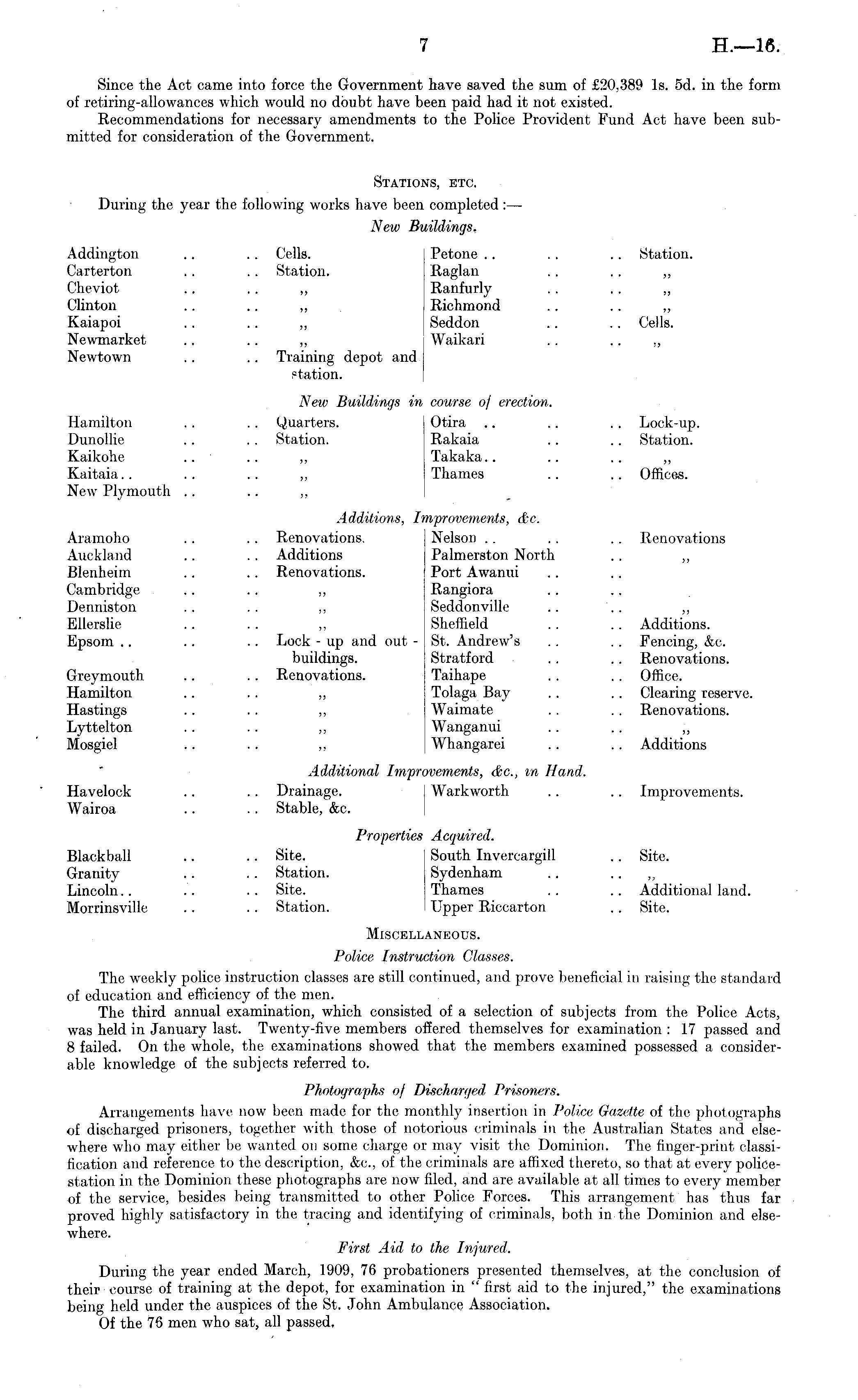 Since the Act came into force the Government have saved the sum of £20,389 Is. sd. in the form of retiring-allowances which would no doubt have been paid had it not existed. Recommendations for necessary amendments to the Police Provident Fund Act have been submitted for consideration of the Government. Stations, etc. During the year the following works have been completed :— New Buildings. Addington .. . . Cells. Petone .. .. .. Station. Carterton .. .. Station. Raglan .. .. ~ Cheviot .. .. „ Ranfurly .. .. „ Clinton .. .. ~ Richmond . . . . ~ Kaiapoi .. .. „ Seddon .. . . Cells. Newmarket .. .. „ Waikari .. .. „ Newtown . . .. Training depot and station. New Buildings in course of erection. Hamilton . . . . Quarters. Otira .. .. . . Lock-up. Dunollie .. . . Station. Rakaia . . .. Station. Kaikohe .. .. ~ Takaka.. .. .. ~ Kaitaia. . .. .. ~ Thames .. .. Offices. New Plymouth . . .. „ Additions, Improvements, &c. Aramoho .. . . Renovations. . Nelson .. .. . . Renovations Auckland . . .. Additions i Palmerston North .. ~ Blenheim .. .. Renovations. Port Awanui Cambridge .. .. „ Rangiora Denniston .. .. ~ Seddonville .. .. ~ Ellerslie .. .. „ Sheffield . . . . Additions. Epsom .. .. .. Lock -up and out - i St. Andrew's . . .. Fencing, &c. buildings. Stratford . . .. Renovations. Greymouth .. . . Renovations. ; Taihape .. . . Office. Hamilton .. . . ~ i Tolaga Bay . . . . Clearing reserve. Hastings . . . . ~ AVaimate .. . . Renovations. Lyttelton . . .. ~ Wanganui .. .. „ Mosgiel .. . . „ Whangarei .. . . Additions Additional Improvements, &c, in Hand. Havelock .. . . Drainage. Warkworth .. .. Improvements. Wairoa .. .. Stable, &c. Properties Acquired. Blackball .. .. Site. South Invert-argil] .. Site. Granity .. .. Station. Sydenham .. .. „ Lincoln. . .. . . Site. Thames .. .. Additional land. Morrinsville .. . . Station. Upper Riccarton . . Site. Miscellaneous. Police Instruction Classes. The weekly police instruction classes are still continued, and prove beneficial in raising the standard of education and efficiency of the men. The third annual examination, which consisted of a selection of subjects from the Police Acts, was held in January last. Twenty-five members offered themselves for examination :17 passed and 8 failed. On the whole, the examinations showed that the members examined possessed a considerable knowledge of the subjects referred to. Photographs of Discharged Prisoners. Arrangements have now been made for the monthly insertion in Police Gazette of the photographs of discharged prisoners, together with those of notorious criminals in the Australian States and elsewhere who may either he wanted on some charge or may visit the Dominion. The finger-print classification and reference to the description, &c, of the criminals are affixed I hereto, so that at every policestation in the Dominion these photographs are now filed, and are available at all times to every member of the service, besides being transmitted to other Police Forces. This arrangement has thus far proved highly satisfactory in the tracing and identifying of criminals, both in the Dominion and elsewhere. First Aid to the Injured. During the year ended March, 1909, 76 probationers presented themselves, at the conclusion of their course of training at the depot, for examination in " first aid to the injured," the examinations being held under the auspices of the St. John Ambulance Association. Of the 76 men who sat, all passed.