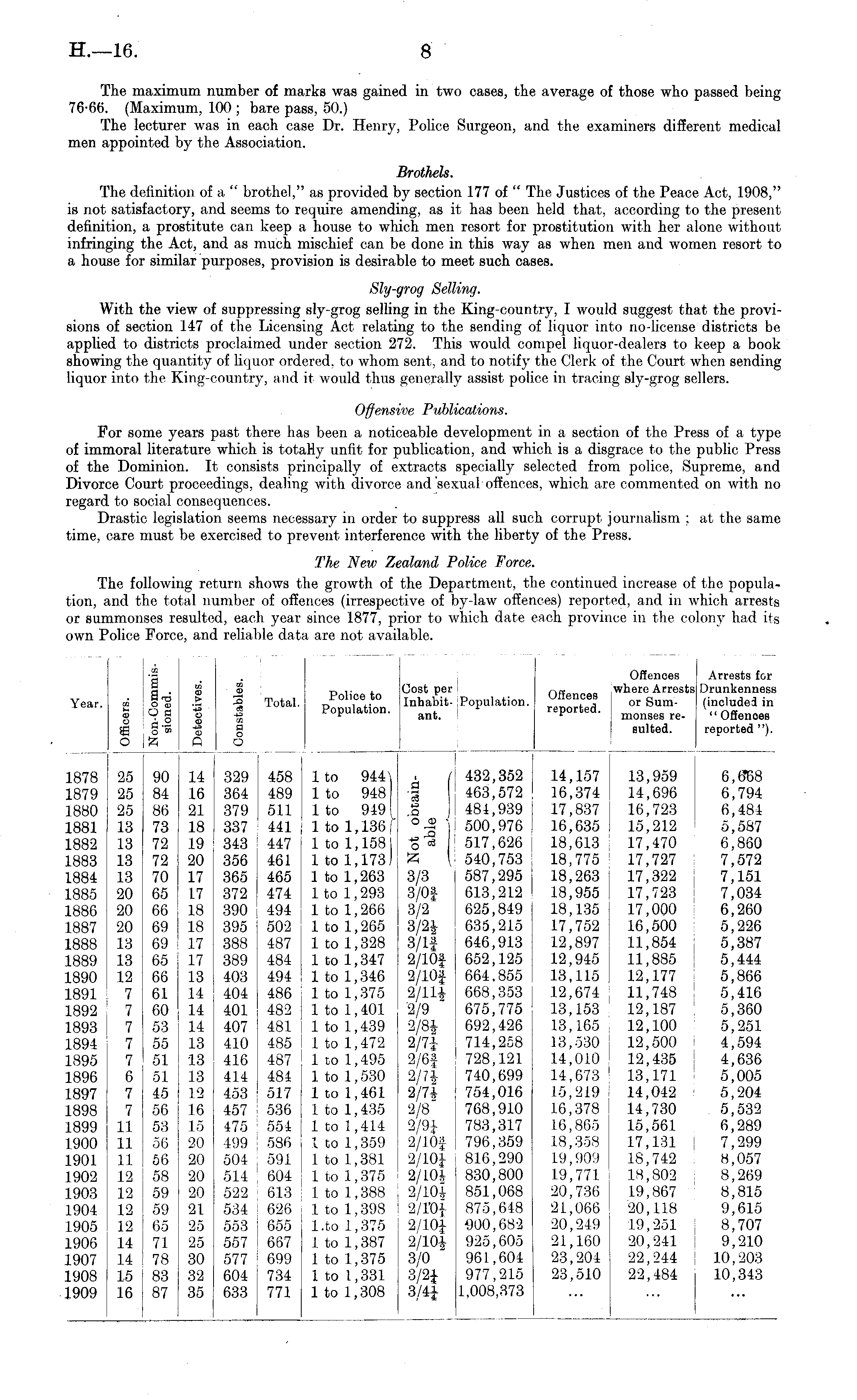 The maximum number of marks was gained in two cases, the average of those who passed being 76-66. (Maximum, 100 ; bare pass, 60.) The lecturer was in each case Dr. Henry, Police Surgeon, and the examiners different medical men appointed by the Association. Brothels. The definition of a " brothel," aw provided by section 177 of " The Justices of the Peace Act, 1908," is not satisfactory, and seems to require amending, as it has been held that, according to the present definition, a prostitute can keep a house to which men resort for prostitution with her alone without infringing the Act, and as much mischief can be done in this way as when men and women resort to a house for similar purposes, provision is desirable to meet such cases. Sly-grog Selling. With the view of suppressing sly-grog selling in the King-country, I would suggest that the provisions of section 147 of the licensing Act relating to the sending of liquor into no-license districts be applied to districts proclaimed under section 272. This would compel liquor-dealers to keep a book showing the quantity of liquor ordered, to whom sent, and to notify the Clerk of the Court when sending liquor into the King-country, and it would thus generally assist police in tracing sly-grog sellers. Offensive Publications. For some years past there has been a noticeable development in a section of the Press of a type of immoral literature which is totally unfit for publication, and which is a disgrace to the public Press of the Dominion. It consists principally of extracts specially selected from police, Supreme, and Divorce Court proceedings, dealing with divorce and sexual offences, which are commented on with no regard to social consequences. Drastic legislation seems necessary in order to suppress all such corrupt journalism ; at the same time, care must be exercised to prevent interference with the liberty of the Press. The New Zealand Police Force. The following return shows the growth of the Department, the continued increase of the population, and the total number of offences (irrespective of by-law offences) reported, and in which arrests or summonses resulted, each year since 1877, prior to which date each province in the colony had its own Police Force, and reliable data are not available.