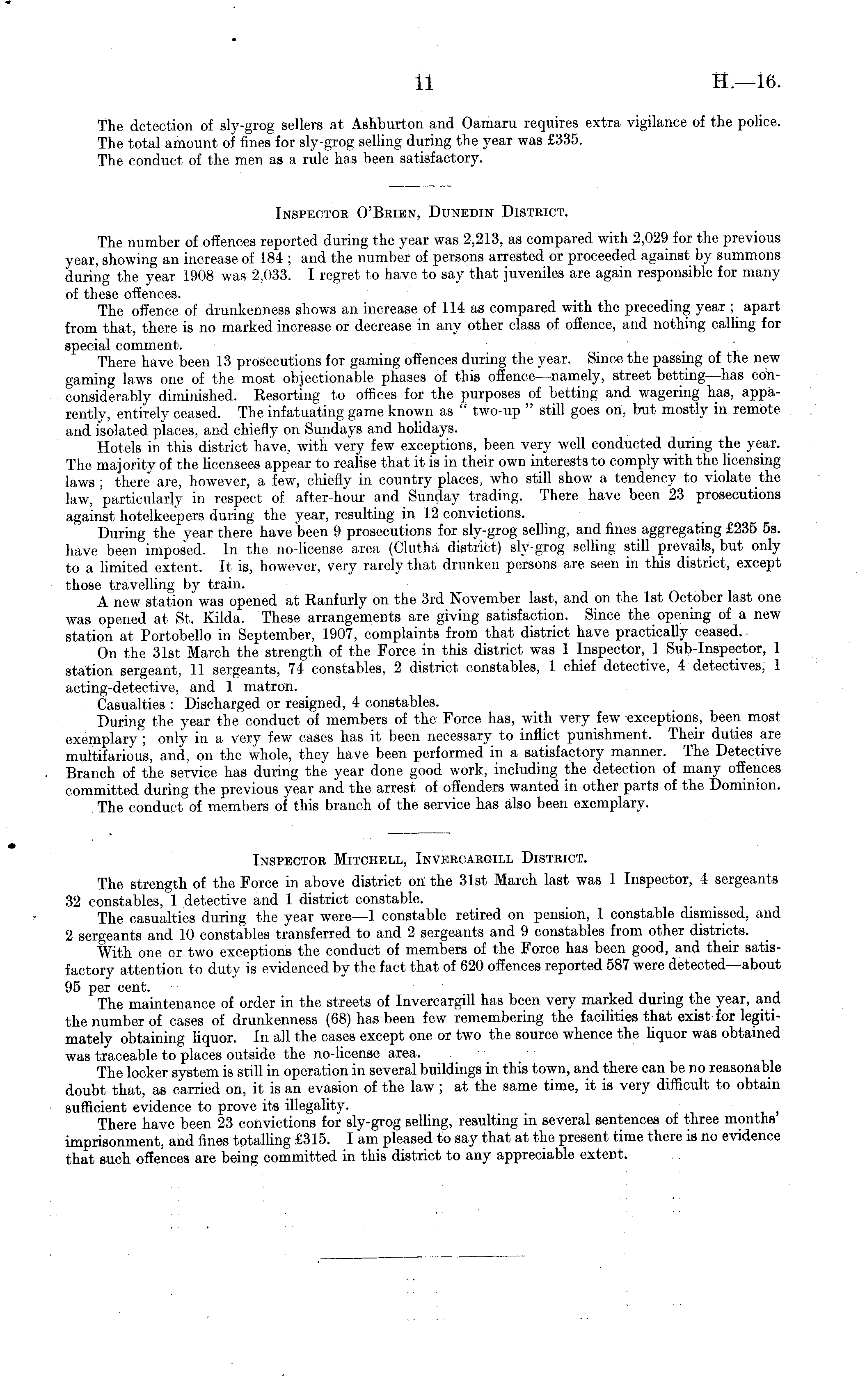 Inspector O'Brien, Dunedin District. The number of offences reported during the year was 2,213, as compared with 2,029 for the previous year, showing an increase of 184 ; and the number of persons arrested or proceeded against by summons during the year 1908 was 2,033. I regret to have to say that juveniles are again responsible for many of these offences. The offence of drunkenness shows an increase of 114 as compared with the preceding year ; apart from that, there is no marked increase or decrease in any other class of offence, and nothing calling for special comment. There have been 13 prosecutions for gaming offences during the year. Since the passing of the new gaming laws one of the most objectionable phases of this offence—namely, street betting—has conconsiderably diminished. Resorting to offices for the purposes of betting and wagering has, apparently, entirely ceased. The infatuating game known as " two-up " still goes on, but mostly in remote and isolated places, and chiefly on Sundays and holidays. Hotels in this district have, with very few exceptions, been very well conducted during the year. The majority of the licensees appear to realise that it is in their own interests to comply with the licensing laws ; there are, however, a few, chiefly in country places ; who still show a tendency to violate the law, particularly in respect of after-hour and Sunday trading. There have been 23 prosecutions against hotelkeepers during the year, resulting in 12 convictions. During the year there have been 9 prosecutions for sly-grog selling, and fines aggregating £235 ss. have been imposed. In the no-license area (Clutha district) sly-grog selling still prevails, but only to a limited extent. It is, however, very rarely that drunken persons are seen in this district, except those travelling by train. A new station was opened at Eanfurly on the 3rd November last, and on the Ist October last one was opened at St. Kilda. These arrangements are giving satisfaction. Since the opening of a new station at Portobello in September, 1907, complaints from that district have practically ceased. On the 31st March the strength of the Force in this district was 1 Inspector, 1 Sub-Inspector, 1 station sergeant, 11 sergeants, 74 constables, 2 district constables, 1 chief detective, 4 detectives, 1 acting-detective, and 1 matron. Casualties : Discharged or resigned, 4 constables. During the year the conduct of members of the Force has, with very few exceptions, been most exemplary ; only in a very few cases has it been necessary to inflict punishment. Their duties are multifarious, and, on the whole, they have been performed in a satisfactory manner. The Detective Branch of the service has during the year done good work, including the detection of many offences committed during the previous year and the arrest of offenders wanted in other parts of the Dominion. The conduct of members of this branch of the service has also been exemplary. Inspector Mitchell, Invercargill District. The strength of the Force in above district on the 31st March last was 1 Inspector, 4 sergeants 32 constables, 1 detective and 1 district constable. The casualties during the year were—l constable retired on pension, 1 constable dismissed, and 2 sergeants and 10 constables transferred to and 2 sergeants and 9 constables from other districts. With one or two exceptions the conduct of members of the Force has been good, and their satisfactory attention to duty is evidenced by the fact that of 620 offences reported 587 were detected—about 95 per cent. . The maintenance of order in the streets of Invercargill has been very marked during the year, and the number of cases of drunkenness (68) has been few remembering the facilities that exist for legitimately obtaining liquor. In all the cases except one or two the source whence the liquor was obtained was traceable to places outside the no-license area. The locker system is still in operation in several buildings in this town, and there can be no reasonable doubt that, as carried on, it is an evasion of the law ;at the same time, it is very difficult to obtain sufficient evidence to prove its illegality. ; There have been 23 convictions for sly-grog selling, resulting in several sentences of three months imprisonment, and fines totalling £315. lam pleased to say that at the present time there is no evidence that such offences are being committed in this district to any appreciable extent.