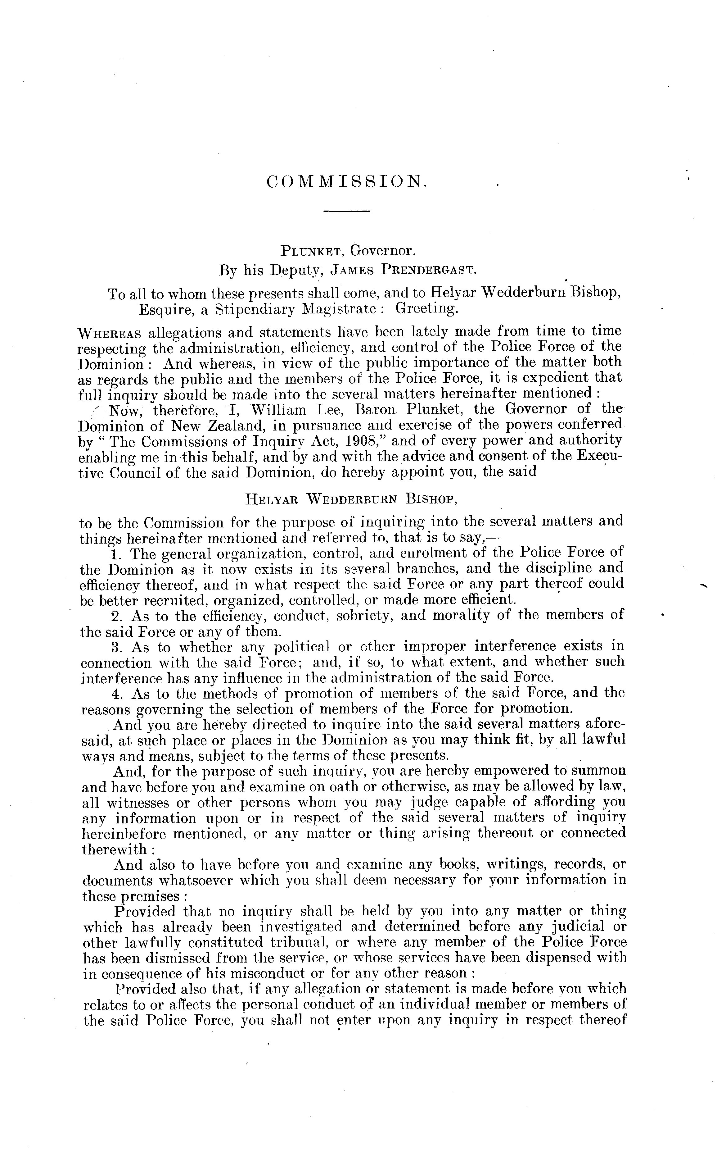 Plunket, Governor. By his Deputy, James Prendergast. To all to whom these presents shall come, and to Helyar Wedderburn Bishop, Esquire, a Stipendiary Magistrate : Greeting. Whereas allegations and statements have been lately made from time to time respecting the administration, efficiency, and control of the Police Force of the Dominion : And whereas, in view of the public importance of the matter both as regards the public and the members of the Police Force, it is expedient that full inquiry should be made into the several matters hereinafter mentioned : ' Now, therefore, I, William Lee, Baron Plunket, the Governor of the Dominion of New Zealand, in pursuance and exercise of the powers conferred by " The Commissions of Inquiry Act, 1908," and of every power and authority enabling me in this behalf, and by and with the advice and consent of the Executive Council of the said Dominion, do hereby appoint you, the said Helyar Wedderburn Bishop, to be the Commission for the purpose of inquiring into the several matters and things hereinafter mentioned and referred to, that is to say,— 1. The general organization, control, and enrolment of the Police Force of the Dominion as it now exists in its several branches, and the discipline and efficiency thereof, and in what respect the said Force or any part thereof could be better recruited, organized, controlled, or made more efficient. 2. As to the efficiency, conduct, sobriety, and morality of the members of the said Force or any of them. 3. As to whether any political or other improper interference exists in connection with the said Force; and, if so, to what extent, and whether such interference has any influence in the administration of the said Force. 4. As to the methods of promotion of members of the said Force, and the reasons governing the selection of members of the Force for promotion. And you are hereby directed to inquire into the said several matters aforesaid, at such place or places in the Dominion as you may think fit, by all lawful ways and means, subject to the terms of these presents. And, for the purpose of such inquiry, you are hereby empowered to summon and have before you and examine on oath or otherwise, as may be allowed by law, all witnesses or other persons whom you may judge capable of affording you any information upon or in respect of the said several matters of inquiry hereinbefore mentioned, or any matter or thing arising thereout or connected therewith : And also to have before you and examine any books, writings, records, or documents whatsoever which you shall deem necessary for your information in these premises : Provided that no inquiry shall be held by you into any matter or thing which has already been investigated and determined before any judicial or other lawfully constituted tribunal, or where any member of the Police Force has been dismissed from the service, or whose services have been dispensed with in consequence of his misconduct or for any other reason : Provided also that, if any allegation or statement is made before you which relates to or affects the personal conduct of an individual member or members of the said Police Force, you shall not enter upon any inquiry in respect thereof