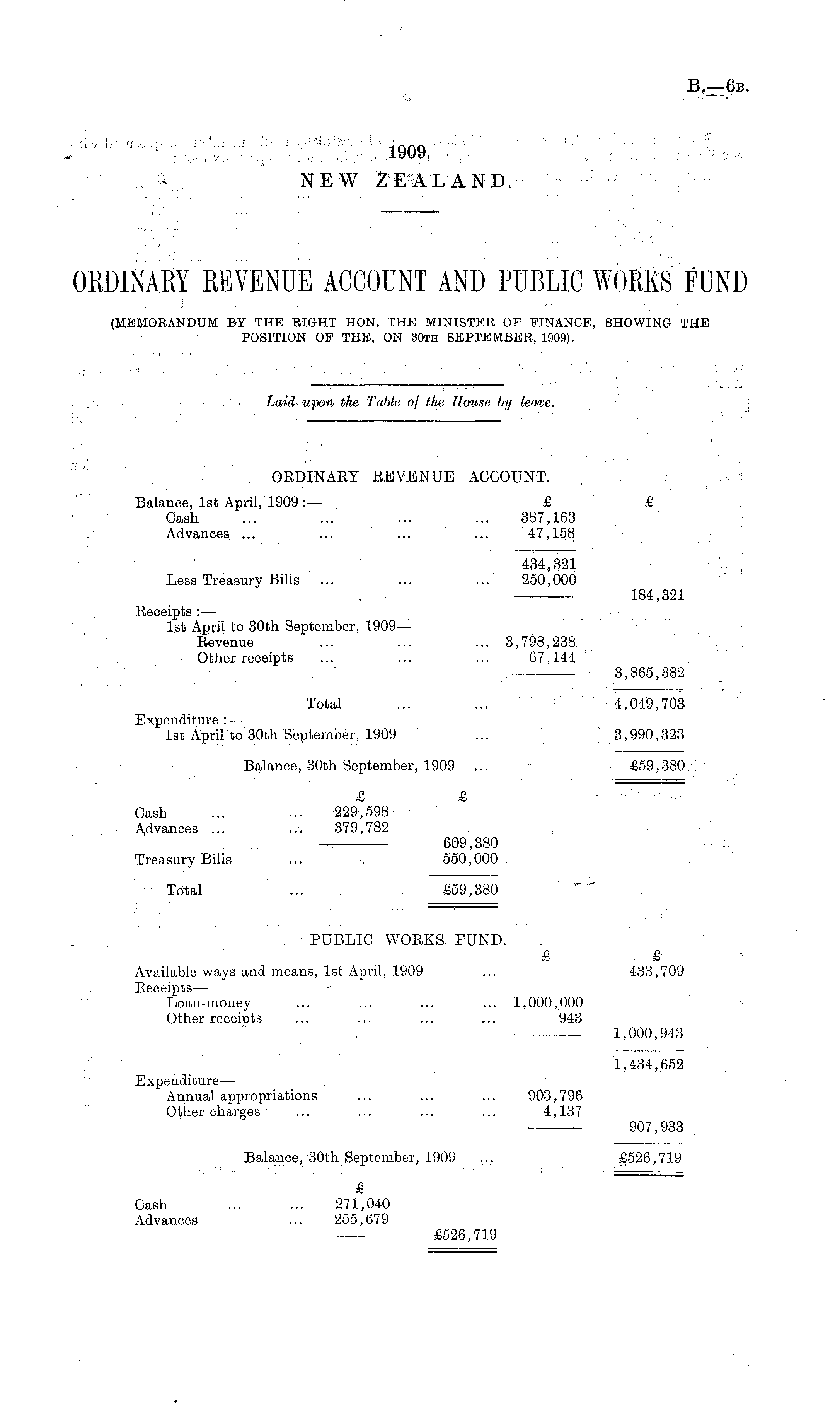 ORDINARY REVENUE ACCOUNT AND PUBLIC WORKS FUND (MEMORANDUM BY THE EIGHT HON. THE MINISTER OF FINANCE, SHOWING THE POSITION OF THE, ON 30th SEPTEMBER, 1909).