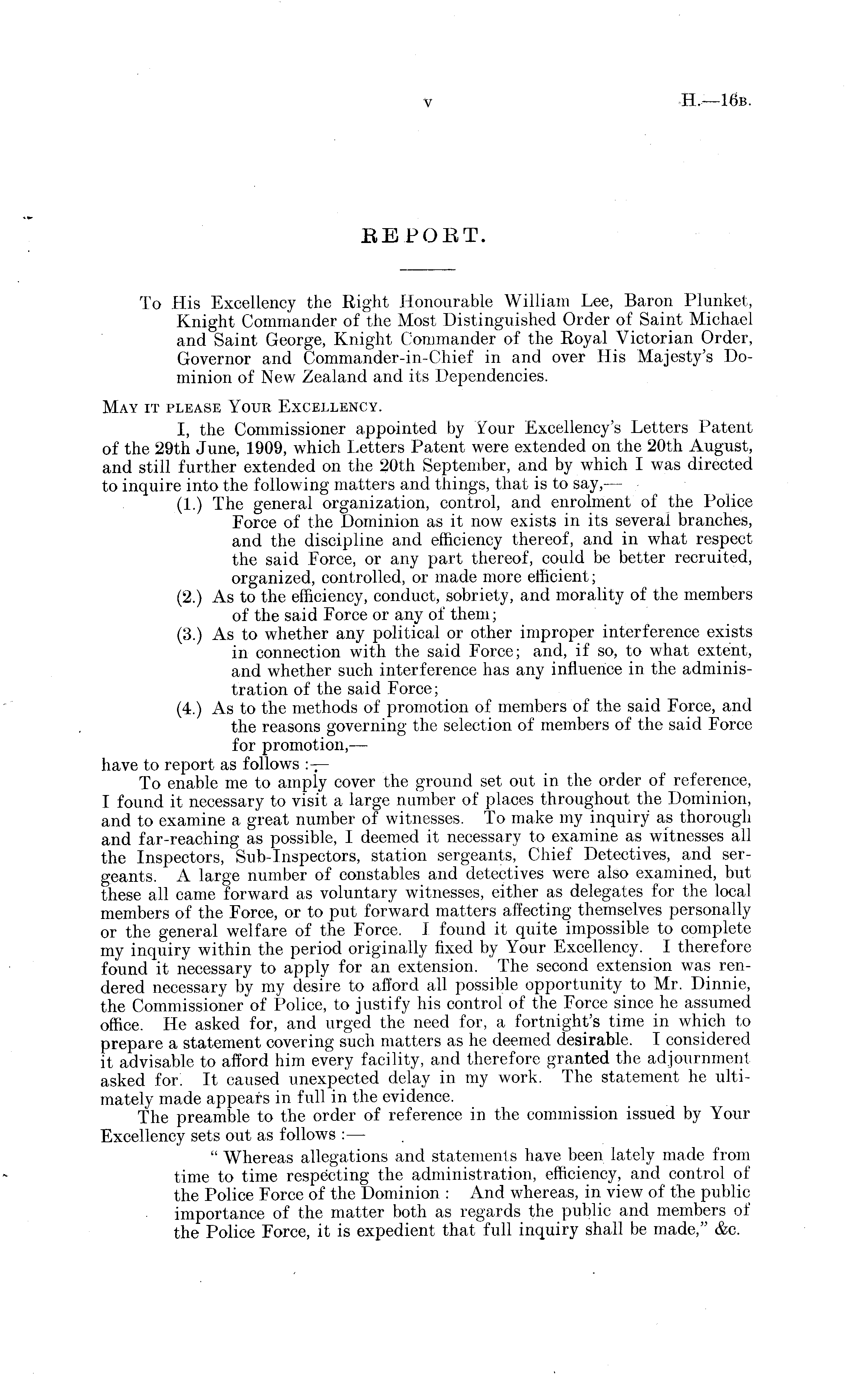 To His Excellency the Right Honourable William Lee, Baron Plunket, Knight Commander of the Most Distinguished Order of Saint Michael and Saint George, Knight Commander of the Royal Victorian Order, Governor and Commander-in-Chief in and over His Majesty's Dominion of New Zealand and its Dependencies. May it please Your Excellency. I, the Commissioner appointed by Your Excellency's Letters Patent of the 29th June, 1909, which Letters Patent were extended on the 20th August, and still further extended on the 20th September, and by which I was directed to inquire into the following matters and things, that is to say, — (1.) The general organization, control, and enrolment of the Police Force of the Dominion as it now exists in its several branches, and the discipline and efficiency thereof, and in what respect the said Force, or any part thereof, could be better recruited, organized, controlled, or made more efficient; (2.) As to the efficiency, conduct, sobriety, and morality of the members of the said Force or any of them; (3.) As to whether any political or other improper interference exists in connection with the said Force; and, if so, to what extent, and whether such interference has any influence in the administration of the said Force; (4.) As to the methods of promotion of members of the said Force, and the reasons governing the selection of members of the said Force for promotion, — have to report as follows :— To enable me to amply cover the ground set out in the order of reference, I found it necessary to visit a large number of places throughout the Dominion, and to examine a great number of witnesses. To make my inquiry as thorough and far-reaching as possible, I deemed it necessary to examine as witnesses all the Inspectors, Sub-Inspectors, station sergeants, Chief Detectives, and sergeants. A large number of constables and detectives were also examined, but these all came forward as voluntary witnesses, either as delegates for the local members of the Force, or to put forward matters affecting themselves personally or the general welfare of the Force. I found it quite impossible to complete my inquiry within the period originally fixed by Your Excellency. I therefore found it necessary to apply for an extension. The second extension was rendered necessary by my desire to afford all possible opportunity to Mr. Dinnie, the Commissioner of Police, to justify his control of the Force since he assumed office. He asked for, and urged the need for, a fortnight's time in which to prepare a statement covering such matters as he deemed desirable. I considered it advisable to afford him every facility, and therefore granted the adjournment asked for. It caused unexpected delay in my work. The statement he ultimately made appears in full in the evidence. The preamble to the order of reference in the commission issued by Your Excellency sets out as follows : — " Whereas allegations and statements have been lately made from time to time respecting the administration, efficiency, and control of the Police Force of the Dominion : And whereas, in view of the public importance of the matter both as regards the public and members of the Police Force, it is expedient that full inquiry shall be made," &c.