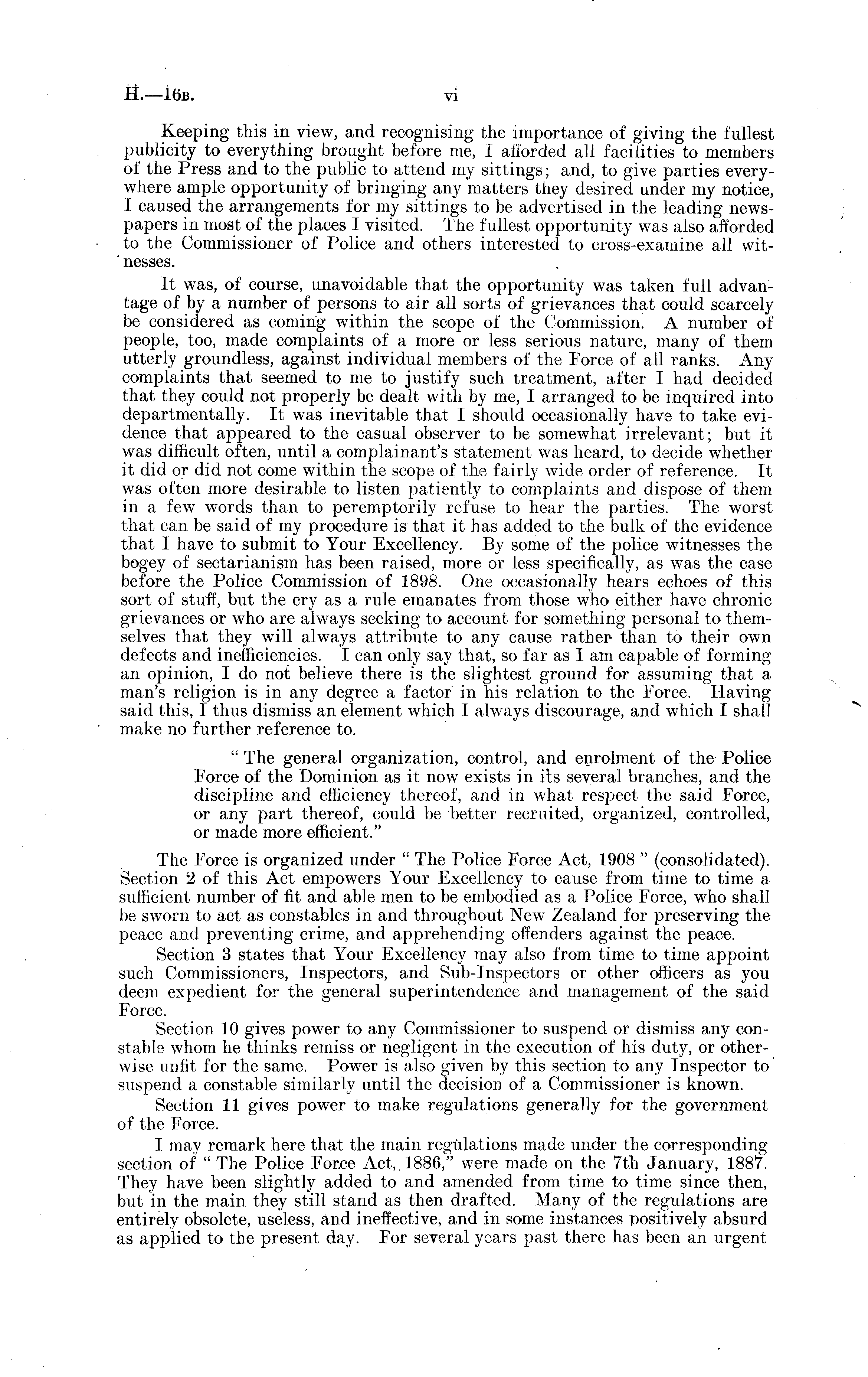 Keeping this in view, and recognising the importance of giving the fullest publicity to everything brought before me, I afforded all facilities to members of the Press and to the public to attend my sittings; and, to give parties everywhere ample opportunity of bringing any matters they desired under my notice, I caused the arrangements for my sittings to be advertised in the leading newspapers in most of the places I visited. The fullest opportunity was also afforded to the Commissioner of Police and others interested to cross-examine all witnesses. It was, of course, unavoidable that the opportunity was taken full advantage of by a number of persons to air all sorts of grievances that could scarcely be considered as coming within the scope of the Commission. A number of people, too, made complaints of a more or less serious nature, many of them utterly groundless, against individual members of the Force of all ranks. Any complaints that seemed to me to justify such treatment, after I had decided that they could not properly be dealt with by me, I arranged to be inquired into departmentally. It was inevitable that I should occasionally have to take evidence that appeared to the casual observer to be somewhat irrelevant; but it was difficult often, until a complainant's statement was heard, to decide whether it did or did not come within the scope of the fairly wide order of reference. It was often more desirable to listen patiently to complaints and dispose of them in a few words than to peremptorily refuse to hear the parties. The worst that can be said of my procedure is that it has added to the bulk of the evidence that I have to submit to Your Excellency. By some of the police witnesses the bogey of sectarianism has been raised, more or less specifically, as was the case before the Police Commission of 1898. One occasionally hears echoes of this sort of stuff, but the cry as a rule emanates from those who either have chronic grievances or who are always seeking to account for something personal to themselves that they will always attribute to any cause rather- than to their own defects and inefficiencies. I can only say that, so far as lam capable of forming an opinion, I do not believe there is the slightest ground for assuming that a man's religion is in any degree a factor in his relation to the Force. Having said this, I thus dismiss an element which I always discourage, and which I shall make no further reference to. " The general organization, control, and enrolment of the Police Force of the Dominion as it now exists in its several branches, and the discipline and efficiency thereof, and in what respect the said Force, or any part thereof, could be better recruited, organized, controlled, or made more efficient." The Force is organized under " The Police Force Act, 1908 " (consolidated). Section 2 of this Act empowers Your Excellency to cause from time to time a sufficient number of fit and able men to be embodied as a Police Force, who shall be sworn to act as constables in and throughout New Zealand for preserving the peace and preventing crime, and apprehending offenders against the peace. Section 3 states that Your Excellency may also from time to time appoint such Commissioners, Inspectors, and Sub-Inspectors or other officers as you deem expedient for the general superintendence and management of the said Force. Section 10 gives power to any Commissioner to suspend or dismiss any constable whom he thinks remiss or negligent in the execution of his duty, or otherwise unfit for the same. Power is also given by this section to any Inspector to suspend a constable similarly until the decision of a Commissioner is known. Section 11 gives power to make regulations generally for the government of the Force. I may remark here that the main regulations made under the corresponding section of " The Police Force Act,. 1886," were made on the 7th January, 1887. They have been slightly added to and amended from time to time since then, but in the main they still stand as then drafted. Many of the regulations are entirely obsolete, useless, and ineffective, and in some instances positively absurd as applied to the present day. For several years past there has been an urgent