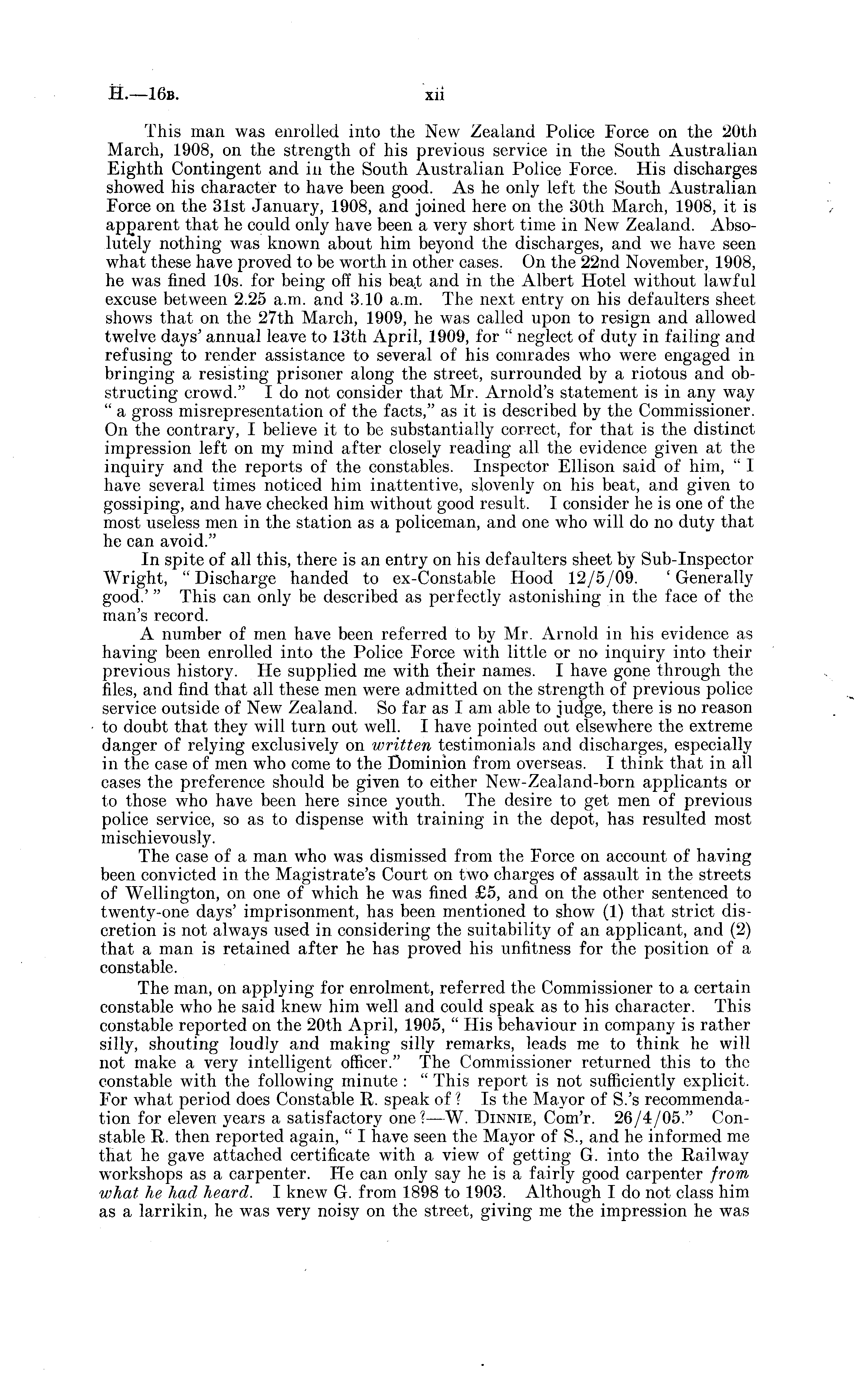 This man was enrolled into the New Zealand Police Force on the 20th March, 1908, on the strength of his previous service in the South Australian Eighth Contingent and in the South Australian Police Force. His discharges showed his character to have been good. As he only left the South Australian Force on the 31st January, 1908, and joined here on the 30th March, 1908, it is apparent that he could only have been a very short time in New Zealand. Absolutely nothing was known about him beyond the discharges, and we have seen what these have proved to be worth in other cases. On the 22nd November, 1908, he was fined 10s. for being off his beat and in the Albert Hotel without lawful excuse between 2.25 a.m. and 3.10 a.m. The next entry on his defaulters sheet shows that on the 27th March, 1909, he was called upon to resign and allowed twelve days' annual leave to 13th April, 1909, for " neglect of duty in failing and refusing to render assistance to several of his comrades who were engaged in bringing a resisting prisoner along the street, surrounded by a riotous and obstructing crowd." Ido not consider that Mr. Arnold's statement is in any way " a gross misrepresentation of the facts," as it is described by the Commissioner. On the contrary, I believe it to be substantially correct, for that is the distinct impression left on my mind after closely reading all the evidence given at the inquiry and the reports of the constables. Inspector Ellison said of him, " I have several times noticed him inattentive, slovenly on his beat, and given to gossiping, and have checked him without good result. I consider he is one of the most useless men in the station as a policeman, and one who will do no duty that he can avoid." In spite of all this, there is an entry on his defaulters sheet by Sub-Inspector Wright, " Discharge handed to ex-Constable Hood 12/5/09. ' Generally good.'' This can only be described as perfectly astonishing in the face of the man's record. A number of men have been referred to by Mr. Arnold in his evidence as having been enrolled into the Police Force with little or no inquiry into their previous history. He supplied me with their names. I have gone through the files, and find that all these men were admitted on the strength of previous police service outside of New Zealand. So far as lam able to judge, there is no reason to doubt that they will turn out well. I have pointed out elsewhere the extreme danger of relying exclusively on written testimonials and discharges, especially in the case of men who come to the Dominion from overseas. I think that in all cases the preference should be given to either New-Zealand-born applicants or to those who have been here since youth. The desire to get men of previous police service, so as to dispense with training in the depot, has resulted most mischievously. The case of a man who was dismissed from the Force on account of having been convicted in the Magistrate's Court on two charges of assault in the streets of Wellington, on one of which he was fined £5, and on the other sentenced to twenty-one days' imprisonment, has been mentioned to show (1) that strict discretion is not always used in considering the suitability of an applicant, and (2) that a man is retained after he has proved his unfitness for the position of a constable. The man, on applying for enrolment, referred the Commissioner to a certain constable who he said knew him well and could speak as to his character. This constable reported on the 20th April, 1905, " His behaviour in company is rather silly, shouting loudly and making silly remarks, leads me to think he will not make a very intelligent officer." The Commissioner returned this to the constable with the following minute : " This report is not sufficiently explicit. For what period does Constable R. speak of ? Is the Mayor of S.s recommendation for eleven years a satisfactory one? —W. Dinnie, Com'r. 26/4/05." Constable R. then reported again, " I have seen the Mayor of S., and he informed me that he gave attached certificate with a view of getting G. into the Railway workshops as a carpenter. He can only say he is a fairly good carpenter from what he had heard. I knew G. from 1898 to 1903. Although Ido not class him as a larrikin, he was very noisy on the street, giving me the impression he was