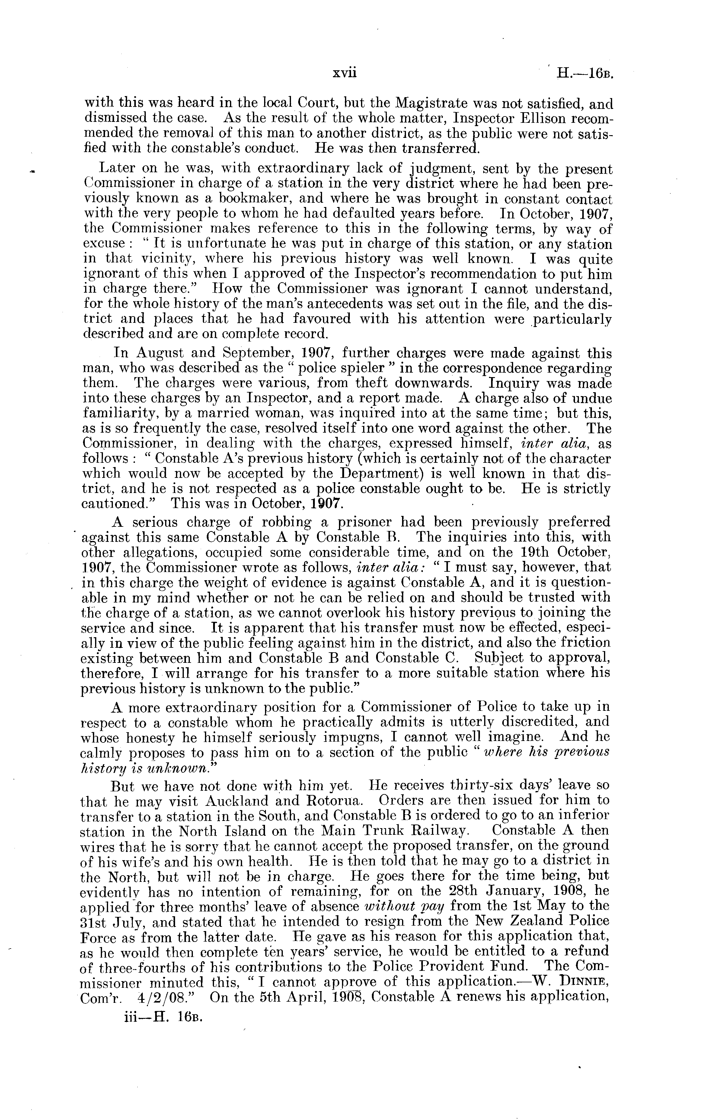 with this was heard in the local Court, but the Magistrate was not satisfied, and dismissed the case. As the result of the whole matter, Inspector Ellison recommended the removal of this man to another district, as the public were not satisfied with the constable's conduct. He was then transferred. Later on he was, with extraordinary lack of judgment, sent by the present Commissioner in charge of a station in the very district where he had been previously known as a bookmaker, and where he was brought in constant contact with the very people to whom he had defaulted years before. In October, 1907, the Commissioner makes reference to this in the following terms, by way of excuse : "It is unfortunate he was put in charge of this station, or any station in that vicinity, where his previous history was well known. I was quite ignorant of this when I approved of the Inspector's recommendation to put him in charge there." How the Commissioner was ignorant I cannot understand, for the whole history of the man's antecedents was set out in the file, and the district and places that he had favoured with his attention were particularly described and are on complete record. In August and September, 1907, further charges were made against this man, who was described as the " police spieler " in the correspondence regarding them. The charges were various, from theft downwards. Inquiry was made into these charges by an Inspector, and a report made. A charge also of undue familiarity, by a married woman, was inquired into at the same time; but this, as is so frequently the case, resolved itself into one word against the other. The Commissioner, in dealing with the charges, expressed himself, inter alia, as follows : " Constable A's previous history (which is certainly not of the character which would now be accepted by the Department) is well known in that district, and he is not respected as a police constable ought to be. He is strictly cautioned." This was in October, 1907. A serious charge of robbing a prisoner had been previously preferred against this same Constable Aby Constable B. The inquiries into this, with other allegations, occupied some considerable time, and on the 19th October. 1907, the Commissioner wrote as follows, inter alia: " I must say, however, that in this charge the weight of evidence is against Constable A, and it is questionable in my mind whether or not he can be relied on and should be trusted with the charge of a station, as we cannot overlook his history previous to joining the service and since. It is apparent that his transfer must now be effected, especially in view of the public feeling against him in the district, and also the friction existing between him and Constable B and Constable C. Subject to approval, therefore, I will arrange for his transfer to a more suitable station where his previous history is unknown to the public." A more extraordinary position for a Commissioner of Police to take up in respect to a constable whom he practically admits is utterly discredited, and whose honesty he himself seriously impugns, I cannot well imagine. And he calmly proposes to pass him on to a section of the public " where his previous history is unknown" But we have not done with him yet. He receives thirty-six days' leave so that he may visit Auckland and Rotorua. Orders are then issued for him to transfer to a station in the South, and Constable B is ordered to go to an inferior station in the North Island on the Main Trunk Railway. Constable A then wires that he is sorry that he cannot accept the proposed transfer, on the ground of his wife's and his own health. He is then told that he may go to a district in the North, but will not be in charge. He goes there for the time being, but evidently has no intention of remaining, for on the 28th January, 1908, he applied for three months' leave of absence without pay from the Ist May to the 31st July, and stated that he intended to resign from the New Zealand Police Force as from the latter date. He gave as his reason for this application that, as he would then complete ten years' service, he would be entitled to a refund of three-fourths of his contribuitions to the Police Provident Fund. The Commissioner minuted this, " I cannot approve of this application.—W. Dinnie, Com'r. 4/2/08." On the sth April, 1908, Constable A renews his application, iii—H. 16b.