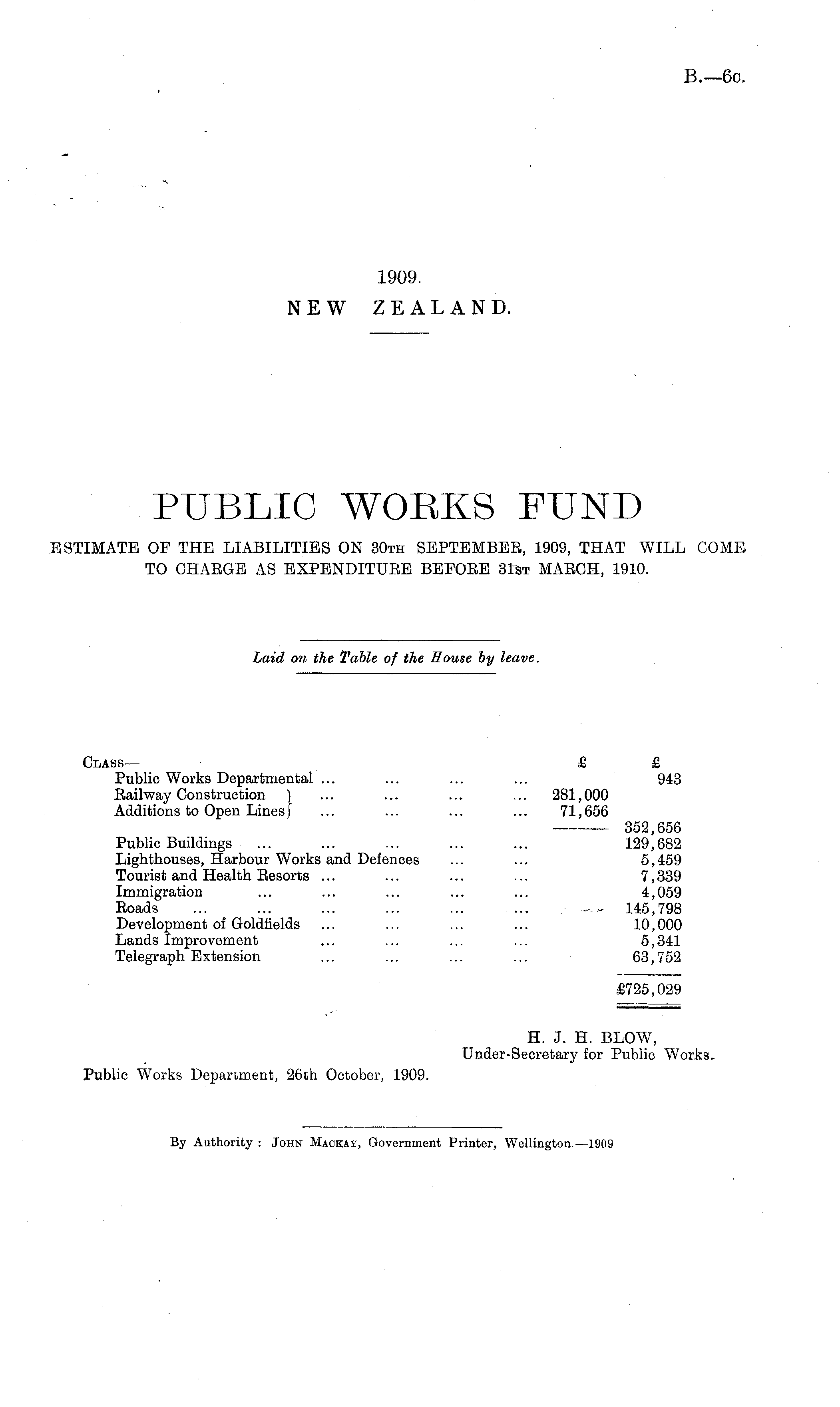 Laid on the 'Fable of the House by leave. Class — £ £ Public Works Departmental ... ... ... ... 943 Eailway Construction ) ... ... ... ... 281,000 Additions to Open Lines ] ... ... ... ... 71,656 352,656 Public Buildings ... ... ... ... ... 129,682 Lighthouses, Harbour Works and Defences ... ... 5,459 Tourist and Health Eesorts ... ... ... ... 7,339 Immigration ... ... ... ... ... 4,059 Eoads ... ... ... ... ... ... 145,798 Development of Goldfields ... ... ... ... 10,000 Lands Improvement ... ... ... ... 5,341 Telegraph Extension ... ... ... ... 63,752 £725,029 H. J. H. BLOW, Under-Secretary for Public Works.. Public Works Department, 26th October, 1909.