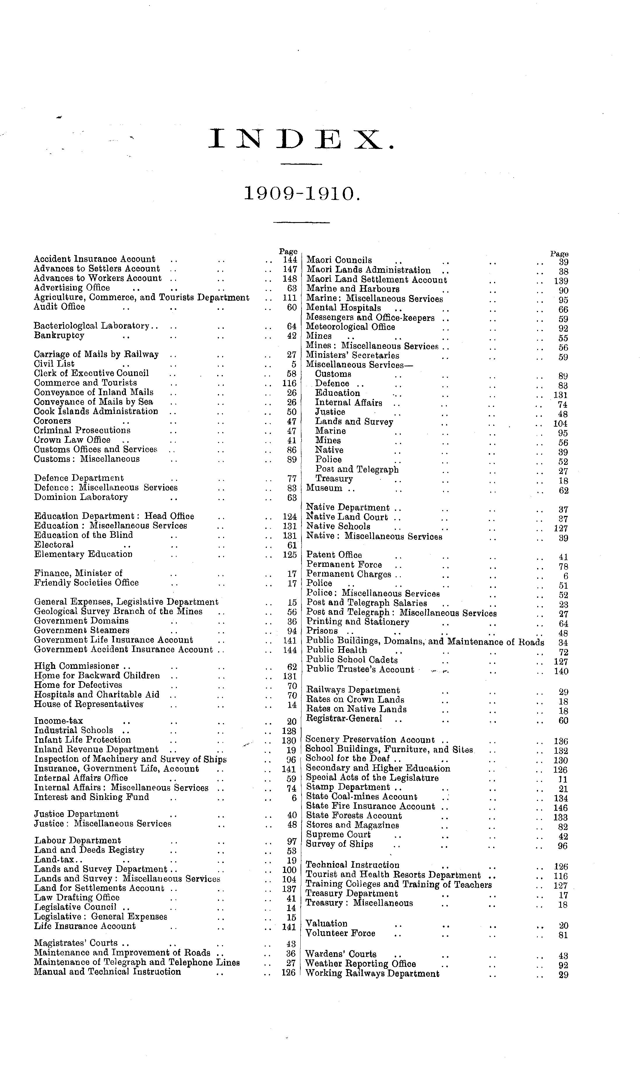 1909-1910. Page Page Accident lnsuranoe Acoount .. .. .. 144 Maori Councils .. .. .. 39 Advances to Settlers Acoount .. .. 147 Maori Lands Administration .. !! 38 Advances to Workers Acoount .. .. ..148 Maori Land Settlement Account .. '.'. 139 Advertising Office .. .. .. 63 Marine and Harbours .. .. .. 90 Agrioulture, Commerce, and Tourists Department .. 11l Marine: Miscellaneous Services .. .[95 Audit Offioe .. .. .. 60 Mental Hospitals .. ~ .. " 66 Messengers and Office-keepers .. .. 59 Bacteriological Laboratory.... .. 64 Meteorological Office .. .. 92 Bankruptcy .. .. .. 42 Mines .. .. .. .. 55 Mines : Miscellaneous Servioee .. .. .. 56 Carriage of Mails by Bailway .. .. 27 Ministers' Secretaries .. .. .. 59 Civil List .. .. .. .. 5 Miscellaneous Servioes— Clerk of Executive Council .. ... 58 Customs .... .. 8 ( J Commerce and Tourists .. .. .. 116 Defence .. .. .. .. 83 Conveyance of Inland Mails .. .. 26 Eduoation ... .. 131 Conveyance of Mails by Sea .. .. 26 Internal Affairs .. .. .. .. 74 Cook Islands Administration .. 50 Justice .. .. .. 49 Coroners .. .. .. 47 Lands and Survey .. .. .. 104 Criminal Prosecutions .. .. .. 47 Marine .. .. .. 95 Crown Law Office .. .. .. 41 Mines .. .. ~ 56 Customs Offices and Services .. .. 86 Native .. .. 39 Customs: Miscellaneous .. .. 89 Police .... 52 Post and Telegraph .. .. .. 27 Defence Department .. .. .. 77 Treasury .. .. 18 Defence: Miscellaneous Servioes .. 83 Museum .. .. .. 62 Dominion Laboratory .. .. 63 Native Department .. .. .. .. 37 Education Department: Head Offioe .. .. 124 Native Land Court .. .. .. 37 Education : Miscellaneous Services .. .. 131 Native Schools .. .. .. 127 Education of the Blind .. .. .. 131 Native : Miscellaneous Servioes .. 39 Electoral .. .. .. 61 Elementary Education .. .. .. 125 Patent Offioe .. .. .. 41 Permanent Force .. .. .. .. 78 Finance, Minister of .. .. ..17 Permanent Charges .. .. .. \\ 6 Friendly Societies Office .. .. .. 17 Police .. .. .. .. 51 Police: Miscellaneous Services .. .. 52 General Expenses, Legislative Department .. 15 Post and Telegraph Salaries .. .. , . 23 Geological Survey Branch of the Mines .. 56 Post and Telegraph : Miscellaneous Services ! '. 27 Government Domains .. .. .. 36 Printing and Stationery .. .. .. 64 Government Steamers .. .. 94 Prisons .. .. .. .. 49 Government Life Insurance Aooount .. .. 141 Public Buildings, Domains, and Maintenance of Koads 34 Government Accident Insurance Account .. .. 144 Public Health .. .. .. 72 TT . , _ . . Public School Cadets .. .. 127 High Commissioner .. .. ..62 Public Trustee's Account .. 140 Home for Backward Children ...... 131 au Home for Defectives .. .. .. 70 t>„;i„,„ -n 1 Hospitals and Charitable Aid 70 s*l? r P 29 tt ct> i !• , V Bates on Crown Lands .. is House of Bepresentatives 14 Rate s on Native Lands .. .. \ \ ijj Income-tax .. .. .. ..20 Registrar-General .. .. .. ..60 Industrial Schools .. .. .. .. 128 Infant Life Protection .. .. 130 Scenery Preservation Acoount .. .. .. 136 Inland Bevenue Department .. .. .. 19 School Buildings, Furniture, and Sites. .. .. 132 Inspection of Machinery and Survey of Ships .. 96 School for the Deaf .. .. .. .. 130 lnsuranoe, Government Life, Acoount .. .. 141 Secondary and Higher Education .. ~ 126 Internal Affairs Office .. .. ..59 Special Acts of the Legislature .. .. ]i Internal Affairs : Miscellaneous Services .. 74 Stamp Department .. .. .. .. 21 Interest and Sinking Fund .. .. .. 6 State Coal-mines Account ..' .. ~ 134 State Fire Insurance Account .. .. 146 Justice Department .. .. 40 State Forests Account .. .. 133 Justioe: Miscellaneous Services .. 48 Stores and Magazines .. .. ..82 T , _ „ Supreme Court .. .. .. .. 42 Labour Department .. .. .. 97 Survey of ships _ _ * Land and Deeds Begistry .. .. 53 Land-tax.. .. .. .. 19 m , . . T , ~ Lands and Survey Department.. .. 100 technical Induction .. .. .. 126 Lands and Survey : Miscellaneous Services .. i O4 and Health Besorts Department .. .. 116 Land for Settlements Account .. .. .. 137 draining Colleges and Training of Teachers .. 127 Law Drafting Office .. .. ..41 Treasury Department .. .. ..17 Legislative Council .. .. .. .. 14 Treasury: Miscellaneous .. .. .. U Legislative : General Expenses .. .. 15 Life Insurance Account .. .. .. 141 " a ' uatloll • • • • .. 20 Volunteer Force .. .. .. .. 81 Magistrates' Courts .. .. .. 43 Maintenance and Improvement of Boads .. 36 Wardens' Courts .. .. .. .. 43 Maintenance of Telegraph and Telephone Lines .. 27 Weather Beporting Offioe .. .. .. 92 Manual and Technical Instruction .. .. 126 Working Bailways Department .'. .. 29