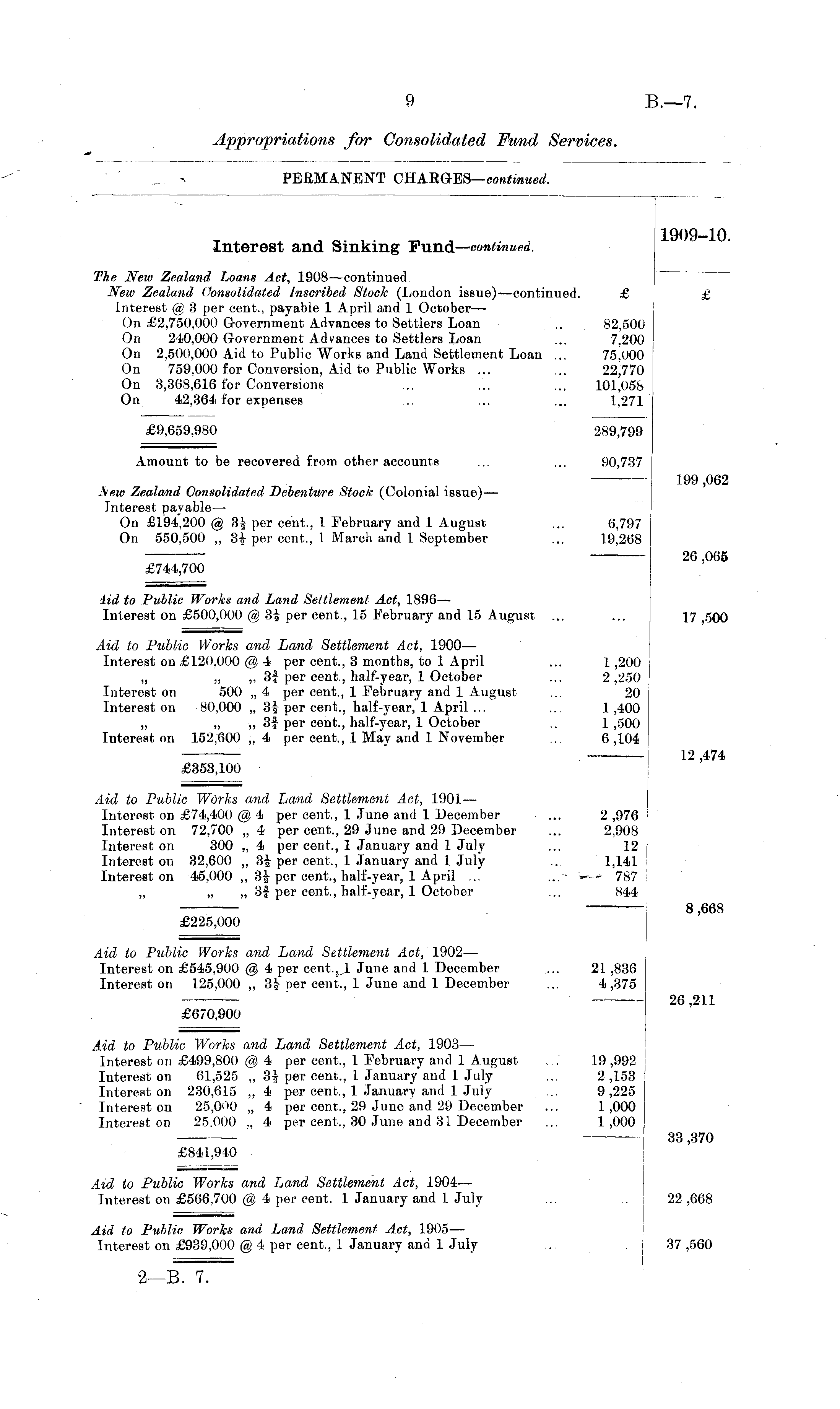 Interest and Sinking Fund— continued. 1909-10. The New Zealand Loans Act, 1908—continued New Zealand Consolidated Inscribed Stock (London issue) —continued. £ Interest @ 3 per cent., payable 1 April and 1 October— On £2,750,000 Government Advances to Settlers Loan .. 82,500 On 240,000 Government Advances to Settlers Loan ... 7,200 On 2,500,000 Aid to Public Works and Land Settlement Loan ... 75,000 On 759,000 for Conversion, Aid to Public Works ... ... 22,770 On 3,368,616 for Conversions ... ... ... 101,058 On 42,364 for expenses ... ... ... 1,271 £ £9,659,980 289,799 Amount to be recovered from other accounts ... ... 90,737 199 ,062 New Zealand Consolidated Debenture Stock (Colonial issue) — Interest payable — On £194,200 @ 31 per cent., 1 February and 1 August ... 6,797 On 550,500 ,, 31 per cent., 1 March and 1 September ... 19,268 26 ,065 £744,700 Hd to Public Works and Land Settlement Act, 1896 — Interest on £500,000 @ 31 per cent., 15 February and 15 August ... Aid to Public Works and Land Settlement Act, 1900— Interest on £120,000 @ 4 per cent., 3 months, to 1 April ... 1 ,200 „ „ ,, 3f per cent, half-year, 1 October ... 2,250 Interest on 500 „4 per cent., 1 February and 1 August, ... 20 Interest on 80,000 „ 31 per cent., half-year, 1 April ... ... 1,400 „ „ ,, 3f per cent., half-year, 1 October .. 1 ,500 Interest on 152,600 „ 4 per cent., 1 May and 1 November ... 6 ,104 17 ,500 12 ,474 £353,100 Aid to Public Works and Land Settlement Act, 1901 — Interest on £74,400 @ 4 per cent., 1 June and 1 December ... 2 ,976 Interest on 72,700 „ 4 per cent., 29 June and 29 December ... 2,908 Interest on 300 ,, 4 per cent., 1 January and 1 July ... 12 Interest on 32,600 „ 31 per cent., 1 January and 1 July ... 1,141 Interest on 45,000 „ 31 per cent., half-year, 1 April ... ... 787 ' „ „ „ 3f per cent., half-year, 1 October ... 844 8,668 £225,000 Aid to Public Works and Land Settlement Act, 1902— Interest on £545,900 @ 4 per cent., 1 June and 1 December ... 21 ,836 Interest on 125,000 ,, 31 per cent., 1 June and 1 December ... 4,375 26,211 £670,900 Aid to Public Works and Land Settlement Act, 1903— Interest on £499,800 @ 4 per cent., 1 February and 1 August ... 19,992 Interest on 61,525 „ 31 per cent., 1 January and 1 July ... 2 ,153 Interest on 230,615 ,, 4 per cent., 1 January and 1 July ... 9,225 Interest on „ 4 per cent., 29 June and 29 December ... 1,000 Interest on 25.000 ,, 4 per cent., 30 June and 31 December ... 1,000 33 ,370 £841,940 Aid to Public Works and Land Settlement Act, 1904— Interest on £566,700 @ 4 per cent. 1 January and 1 July Aid to Public Works and Land Settlement Act, 1905 — Interest on £939,000 @ 4 per cent., 1 January and 1 July 22 ,668 37 ,560