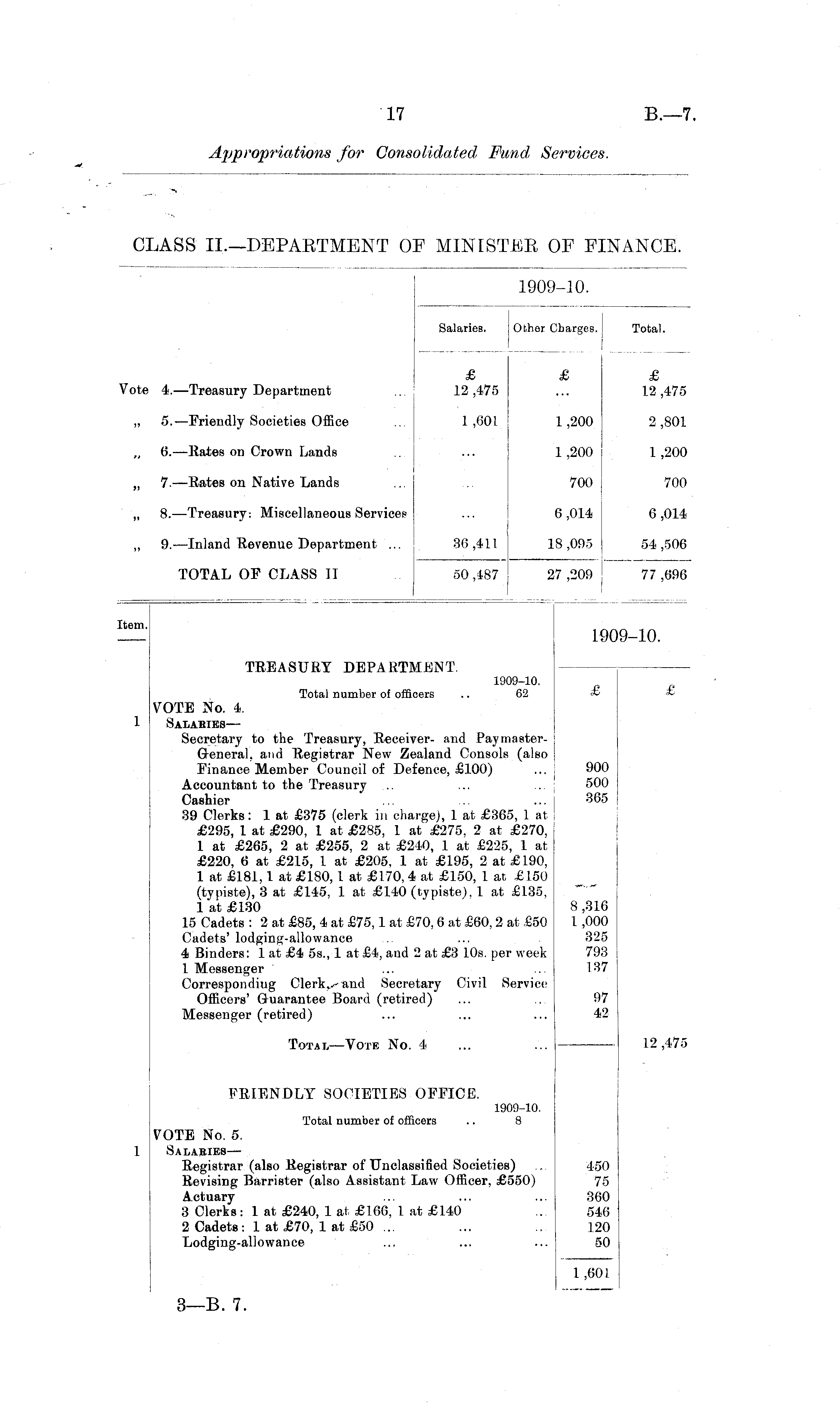 1909-10. Vote 4.—Treasury Department Salaries. Other Charges. Total. £ 12 ,475 £ £ 12 ,475 ,, 5.—Friendly Societies Office 1 ,601 1,200 2,801 6. —Rates on Crown Lands 1,200 1,200 „ 7. —Rates on Native Lands 700 700 „ 8. —Treasury: Miscellaneous Services 6,014 6,014 „ 9.—Inland Revenue Department ... 36,411 18 ,095 54 ,506 TOTAL OF CLASS II 50 ,487 17 ,209 77 ,696 item. 109-10. TREASURY DEPARTMENT. 1909-10. Total number of officers .. 62 VOTE No. 4. Salaries — Secretary to the Treasury, Receiver- and PaymasterGeneral, and Registrar New Zealand Consols (also Finance Member Council of Defence, £100) Accountant to the Treasury ... Cashier 39 Clerks: 1 at £375 (clerk in charge), 1 at £365, 1 at £295, 1 at £290, 1 at £285, 1 at £275, 2 at £270, 1 at £265, 2 at £255, 2 at £240, 1 at £225, 1 at £220, 6 at £215, 1 at £205, 1 at £195, 2 at £190, 1 at £181,1 at £180,1 at £170, 4 at £150, 1 at £150 (typiste), 3 at £145, 1 at £140 (typiste). 1 at £135, 1 at £130 15 Cadets : 2 at £85, 4 at £75,1 at £70,6 at £60,2 at £50 Cadets' lodging-allowance 4 Binders: 1 at £4 5s., 1 at £4, and 2 at £3 10s. per week 1 Messenger Corresponding Clerk,-- and Secretary Civil Service Officers' Guarantee Board (retired) Messenger (retired) 900 500 365 £ 8 ,316 1,000 325 793 137 97 42 Total —Vote No. 4 12 ,475 FRIENDLY SOCIETIES OFFICE. 1909-10. Total number of officers .. 8 VOTE No. 5. Salaries— Registrar (also Registrar of Unclassified Societies) Revising Barrister (also Assistant Law Officer, £550) Actuary 3 Clerks: 1 at £240, 1 at £166, 1 at £140 2 Cadets: 1 at £70, 1 at £50 ... Lodging-allowance 450 75 360 546 120 50 1,601