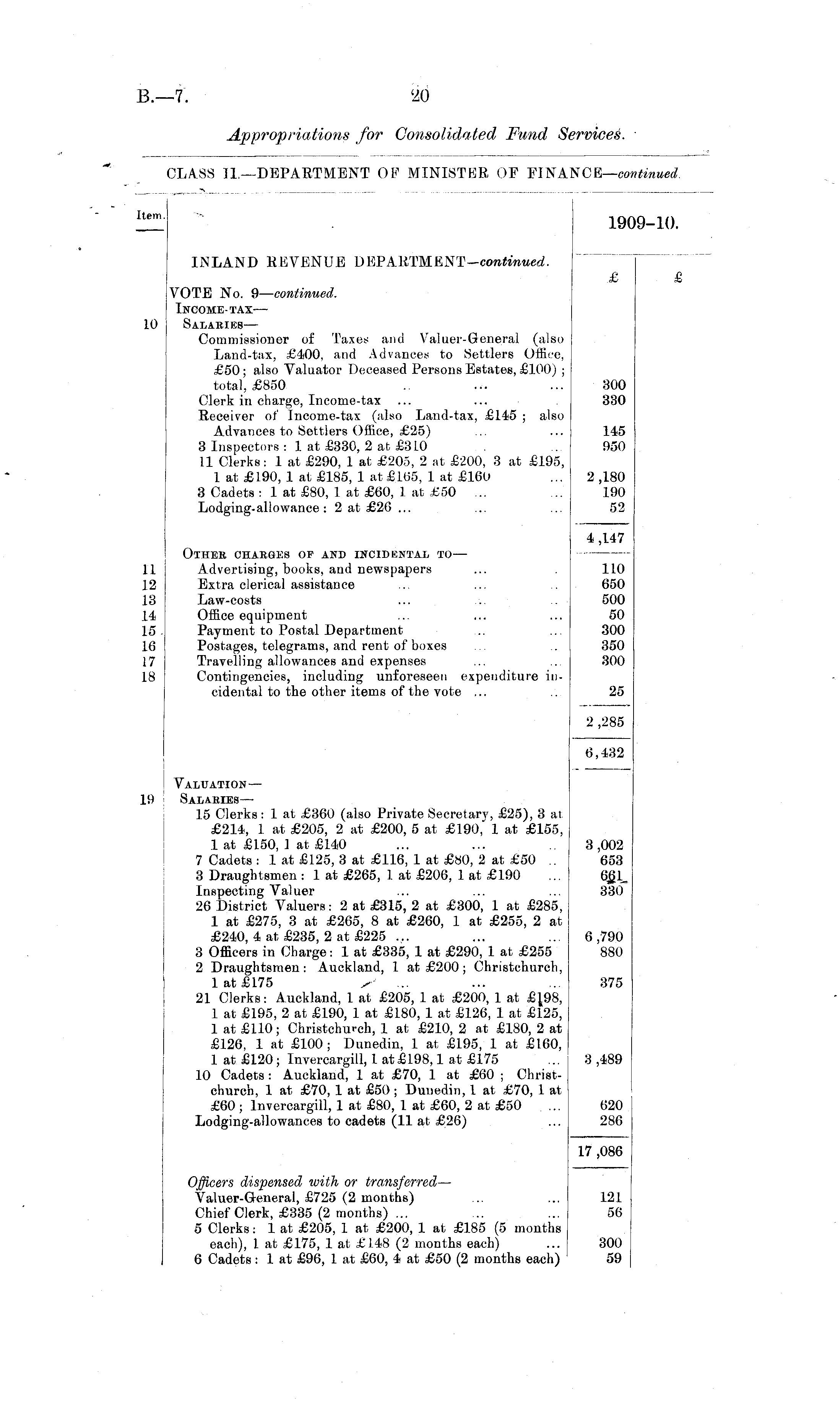 tern. 1909-10. INLAND REVENUE DEPARTMENT-continued. £ £ 10 VOTE No. 9— continued. Income-tax — Salabies — Commissioner of Taxes and Valuer-General (also Land-tax, £400, and Advances to Settlers Office, £50; also Valuator Deceased Persons Estates, £100) ; total, £850 Clerk in charge, Income-tax ... Receiver of income-tax (also Land-tax, £145 ; also Advances to Settlers Office, £25) 3 Inspectors : 1 at £330, 2 at £310 11 Clerks: 1 at £290, 1 at £205, 2 at £200, 3 at £195, 1 at £190, 1 at £185, 1 at £165, 1 at £160 3 Cadets : 1 at £80, 1 at £60, 1 at £50 ... Lodging-allowance: 2 at £26 ... 300 330 145 950 2,180 190 52 11 12 13 14 15 16 17 18 Othee chaeges op and incidental to — Advertising, books, and newspapers Extra clerical assistance Law-costs Office equipment Payment to Postal Department Postages, telegrams, and rent of boxes Travelling allowances and expenses Contingencies, including unforeseen expenditure incidental to the other items of the vote ... 4,147 110 650 500 50 300 350 300 25 2,285 L9 Valuation — Salabies — 15 Clerks: 1 at £360 (also Private Secretary, £25), 3 at £214, 1 at £205, 2 at £200, 5 at £190, 1 at £155, 1 at £150, 1 at £140 7 Cadets : 1 at £125, 3 at £116, 1 at £80, 2 at £50 .. 3 Draughtsmen : 1 at £265, 1 at £206, 1 at £190 Inspecting Valuer 26 District Valuers: 2 at £315, 2 at £300, 1 at £285, 1 at £275, 3 at £265, 8 at £260, 1 at £255, 2 at £240, 4 at £235, 2 at £225 ... 3 Officers in Charge: 1 at £335, 1 at £290, 1 at £255 2 Draughtsmen: Auckland, 1 at £200; Christchureh, 1 at £175 y ... 21 Clerks: Auckland, 1 at £205, 1 at £200, 1 at 1 at £195, 2 at £190, 1 at £180, 1 at £126, 1 at £125, 1 at £110; Christchureh, 1 at £210, 2 at £180, 2 at £126, 1 at £100; Dunedin, 1 at £195, 1 at £160, 1 at £120; Invercargill, 1 at £198,1 at £175 10 Cadets: Auckland, 1 at £70, 1 at £60 ; Christchureh, 1 at £70, 1 at £50 ; Dunedin, 1 at £70, 1 at £60 ; Invercargill, 1 at £80, 1 at £60, 2 at £50 Lodging-allowances to cadets (11 at £26) 6,432 3,002 653 661 330 6 ,790 880 375 3 ,489 620 286 17 ,086 Officers dispensed with or transferred — Valuer-General, £725 (2 months) Chief Clerk, £335 (2 months) ... 5 Clerks: 1 at £205, 1 at £200, 1 at £185 (5 months each), 1 at £175, 1 at £148 (2 months each) 6 Cadets: 1 at £96, 1 at £60, 4 at £50 (2 months each) 121 56 300 59