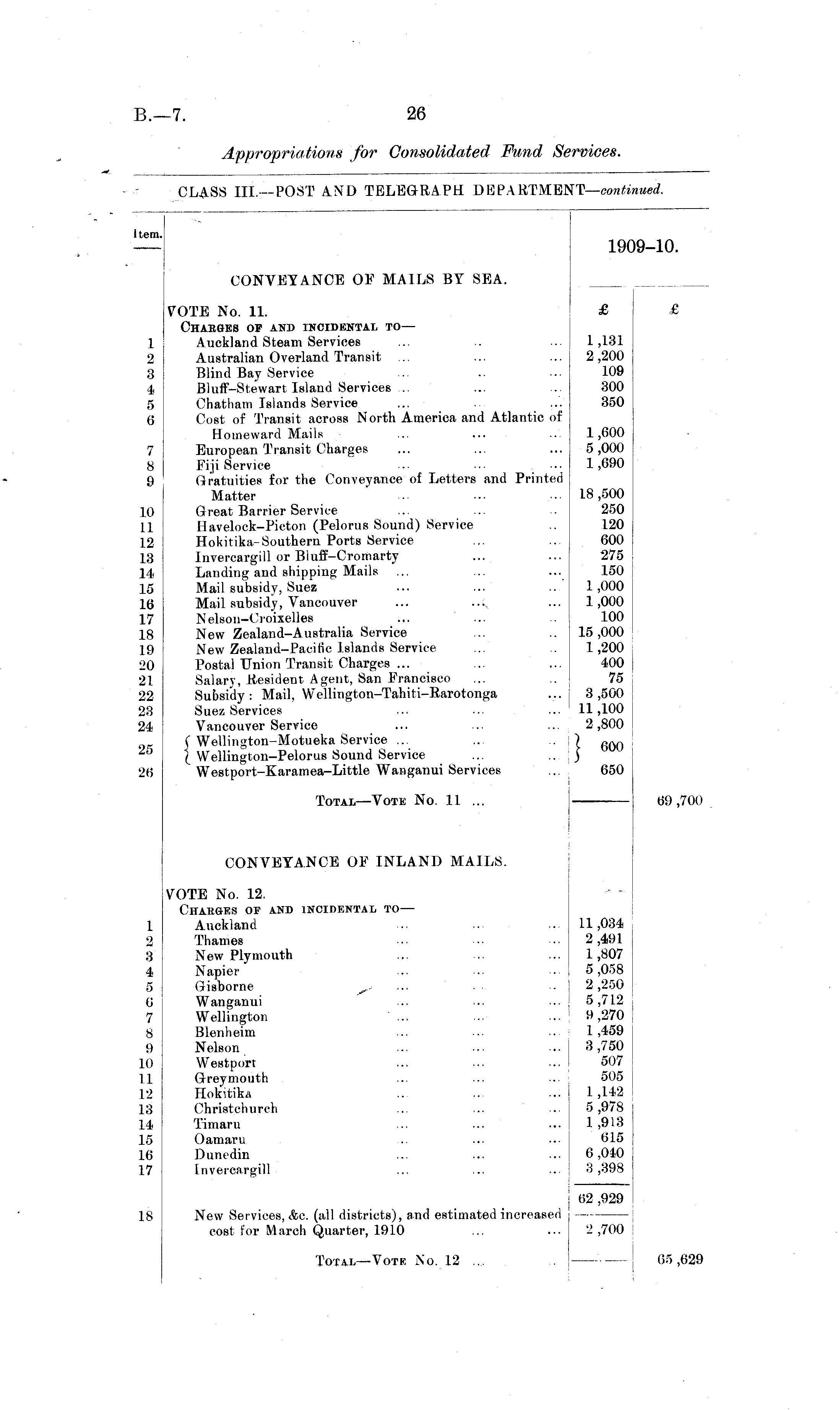 Item. CONVEYANCE OF MAILS BY SEA. 19( 19-10. 1 2 3 4 5 6 7 8 9 10 11 12 13 14 15 16 17 18 19 20 21 22 23 24 VOTE No. 11. Chaeges of and incidental to — Auckland Steam Services Australian Overland Transit ... Blind Bay Service Bluff-Stewart Island Services ... Chatham Islands Service Cost of Transit across North America and Atlantic of Homeward Mails European Transit Charges ... ... ... Fiji Service Gratuities for the Conveyance of Letters and Printed Matter Great Barrier Service Havelock-Picton (Pelorus Sound) Service Hokitika-Southern Ports Service Invercargill or Bluff-Cromarty Landing and shipping Mails Mail subsidy, Suez Mail subsidy, Vancouver ... ..i^ N elson-Croixelles New Zealand-Australia Service New Zealand-Pacific Islands Service Postal Union Transit Charges ... Salary, Resident Agent, San Francisco Subsidy: Mail, Wellington-Tahiti-Rarotonga Suez Services Vancouver Service ( Wellington-Motueka Service ... { Wellington-Pelorus Sound Service Westport-Karamea-Little Wanganui Services £ 1,131 2,200 109 300 350 1,600 5,000 1,690 18 ,500 250 120 600 275 150 1,000 1,000 100 15 ,000 1,200 400 75 3,500 11,100 2,800 £ 25 X 600 26 650 Total —Vote No. 11 ... 69 ,700 CONVEYANCE OF INLAND MAILS. 1 2 3 4 5 6 7 8 i) 10 11 12 13 14 15 16 17 VOTE No. 12. Chaeges op and incidental to — Auckland Thames New Plymouth Napier Gisborne ... Wanganui Wellington ... Blenheim Nelson Westport Greymouth Hokitika Christchureh Timaru Oamaru Dunedin Invercargill 11,034 2,491 1,807 5 ,058 2 ,250 5,712 9 ,270 1,459 3,750 507 505 1,142 5 ,978 1 ,913 615 6,040 3 ,398 18 New Services, <fcc. (all districts), and estimated increased cost for March Quarter, 1910 62 ,929 2 ,700 Total—Vote No. 12 .... 65 ,62!