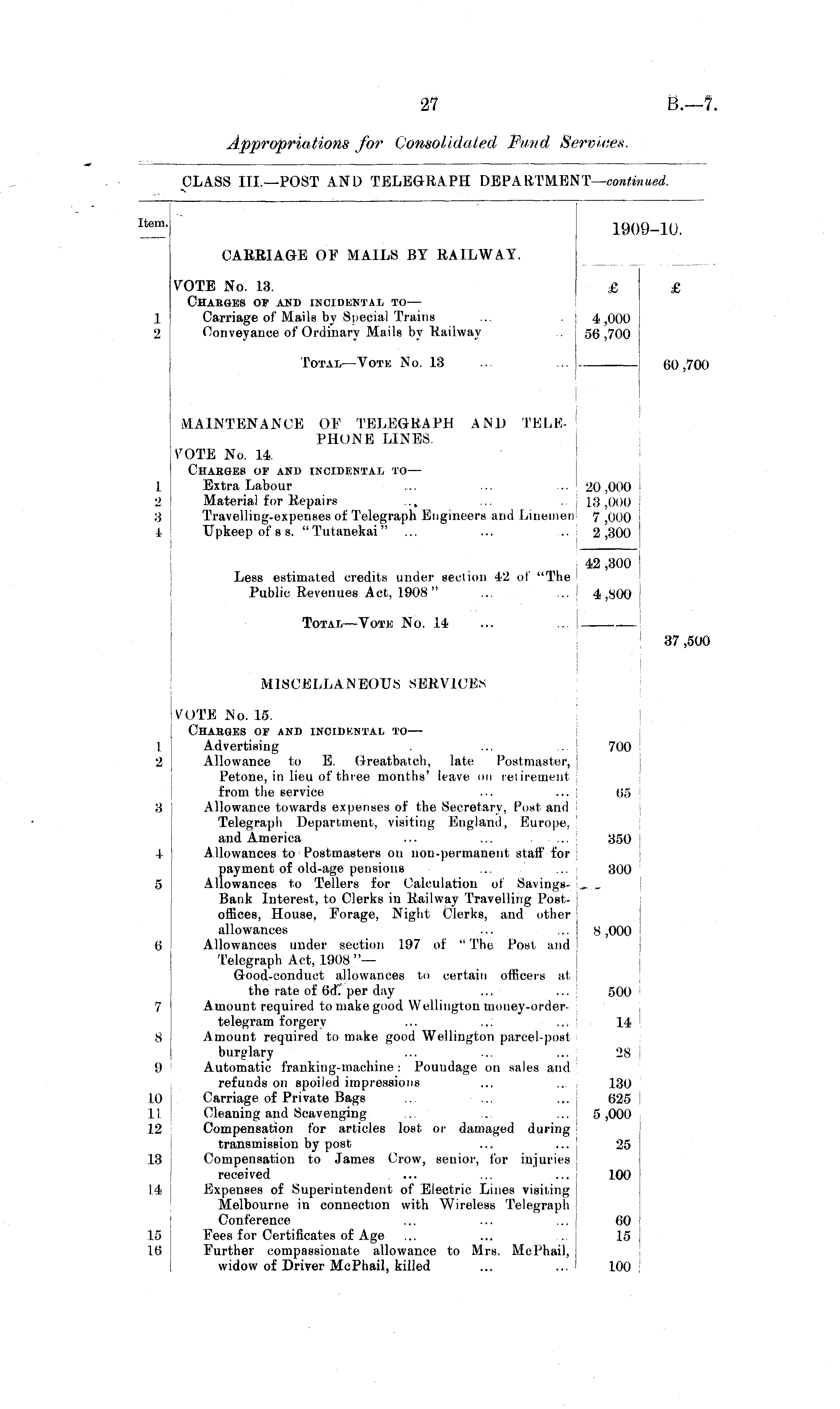 Item. 1909-10. CARRIAGE OF MAILS BY RAILWAY. VOTE No. 13. £ £ Charges op and incidental to — Carriage of Mails by Special Trains ... -4 ,000 Conveyance of Ordinary Mails by Railway 56,700 1 2 Total —Vote No. 13 ... ... 60,700 MAINTENANCE OF TELEGRAPH AND TELEPHONE LINES. 1 2 3 1 VOTE No. 14. Charges op and incidental to — Extra Labour ... ... ■ • ' 20,000 > Material for Repairs ... ... ... 13,000 Travelling-expenses of Telegraph Engineers and Linemen 7,000 Upkeep of s s. "Tutanekai" ... ... ... 2,300 ! 42 ,300 | Less estimated credits under section 42 of "The Public Revenues Act, 1908" ... ... 4,800 Total —Vote No. 14 ... ... I 37 ,500 MISCELLANEOUS SERVICES 1 2 3 I 5 6 VOTE No. 15. Charges op and incidental to — Advertising . ... . 700 Allowance to E. Greatbatch, late Postmaster, Petone, in lieu of three months' leave on retirement from the service ... ... i 05 Allowance towards expenses of the Secretary, Post and Telegraph Department, visiting England, Europe, and America ... ... ! 350 Allowances to Postmasters on non-permanent staff Inpayment of old-age pensions ... ... i 300 Allowances to Tellers for Calculation of SaviugsBank Interest, to Clerks in Railway Travelling Postoffices, House, Forage, Night Clerks, and other allowances ... ... 8,000 Allowances under section 197 of " The Post and Telegraph Act, 1908 "— Good-conduct allowances to certain officers at, the rate of 6d.' per day ... ... 500 Amount required to make good Wellington money-order-telegram forgery ... ..: ... ■ 14 Amount required to make good Wellington parcel-post burglary ... ... ... 28 Automatic franking-machine : Poundage on sales and refunds on spoiled impressions ... ... 130 Carriage of Private Bags .. ... ... i 625 Cleaning and Scavenging .. . ... i 5 ,000 Compensation for articles lost or damaged during transmission by post ... ... ! 25 Compensation to James Crow, senior, for injuries received ... ... ... i 100 Expenses of Superintendent of Electric Lines visiting Melbourne in connection with Wireless Telegraph Conference ... ... ... 60 Fees for Certificates of Age ... ... . 15 J Further compassionate allowance to Mrs. McPhail, widow of Driver McPhail, killed ... ...I 100 7 8 9 10 11 12 13 14 15 16