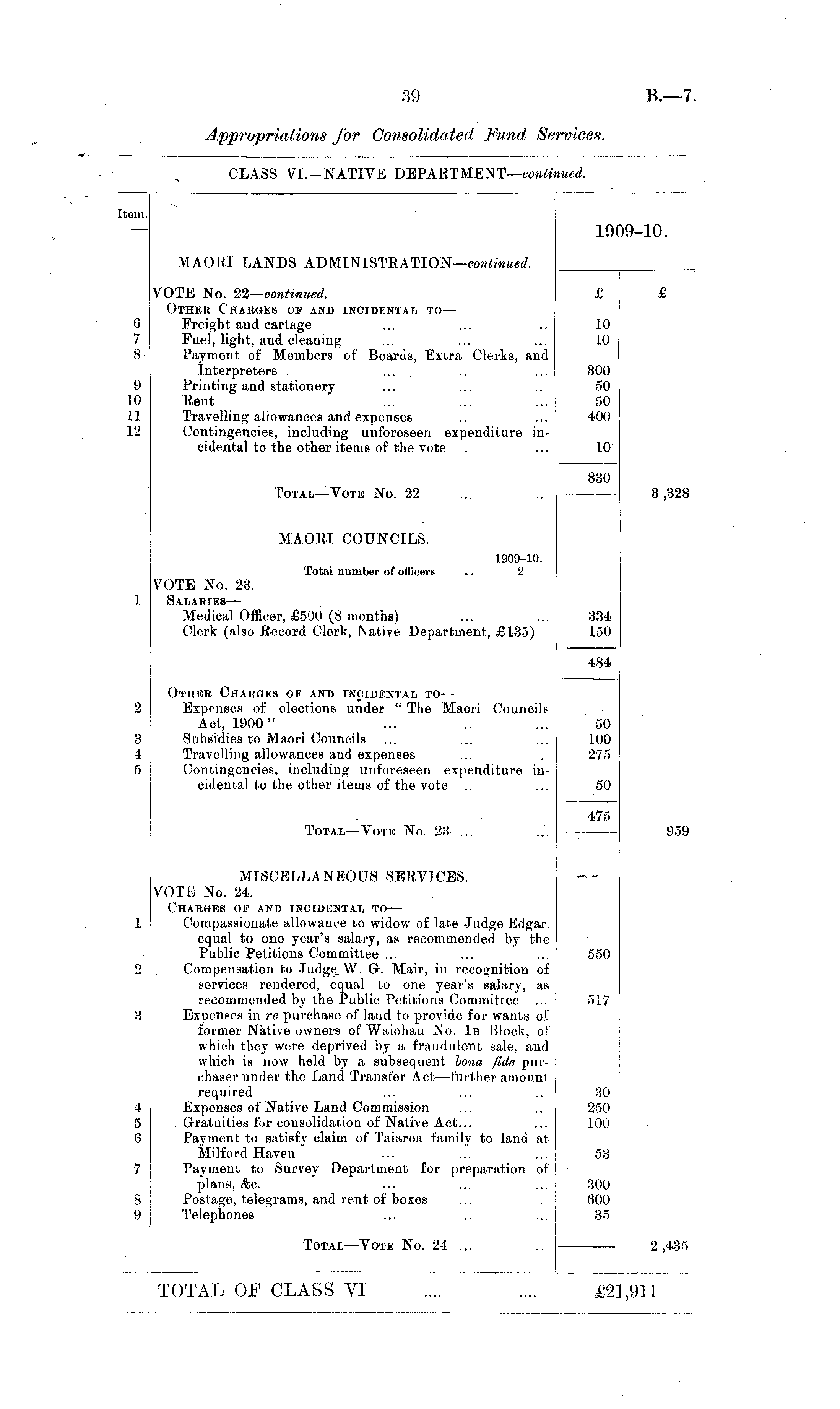 [tern. 1909-10. MAORI LANDS ADMINISTRATION— continued. 6 7 89 10 11 12 VOTE No. 22— continued. Other Charges op and incidental to — Freight and cartage Fuel, light, and cleaning Payment of Members of Boards, Extra Clerks, and Interpreters Printing and stationery Rent Travelling allowances and expenses Contingencies, including unforeseen expenditure incidental to the other items of the vote ... £ 10 10 300 50 50 400 £ Total—Vote No. 22 10 830 3,328 MAORI COUNCILS. 1909-10. Total number of officers .. 2 VOTE No. 23. Salaries — Medical Officer, £500 (8 months) Clerk (also Record Clerk, Native Department, £135) 334 150 484 2 3 4 5 Other Charges op and incidental to — Expenses of elections under " The Maori Councils Act, 1900" Subsidies to Maori Councils Travelling allowances and expenses Contingencies, including unforeseen expenditure incidental to the other items of the vote ... 50 100 275 50 959 Total—Vote No. 23 ... 475 2 3 MISCELLANEOUS SERVICES. VOTE No. 24. Charges op and incidental to — Compassionate allowance to widow of late Judge Edgar, equal to one year's salary, as recommended by the Public Petitions Committee ... Compensation to Judge, W. G. Mair, in recognition of services rendered, equal to one 3 r ear's salary, as recommended by the Public Petitions Committee ... Expenses in re purchase of laud to provide for wants of former Native owners of Waiohau No. 1b Block, of which they were deprived by a fraudulent sale, and which is now held by a subsequent bona fide purchaser under the Land Transfer Act —further amount required Expenses of Native Land Commission Gratuities for consolidation of Native Act... Payment to satisfy claim of Taiaroa family to land at Milford Haven Payment to Survey Department for preparation of* plans, &c. Postage, telegrams, and rent of boxes Telephones 550 517 4 5 0 30 250 100 7 53 8 !) 300 600 35 Total —Vote No. 24 ... 2,435 TOTAL OF CLASS VI £2 911