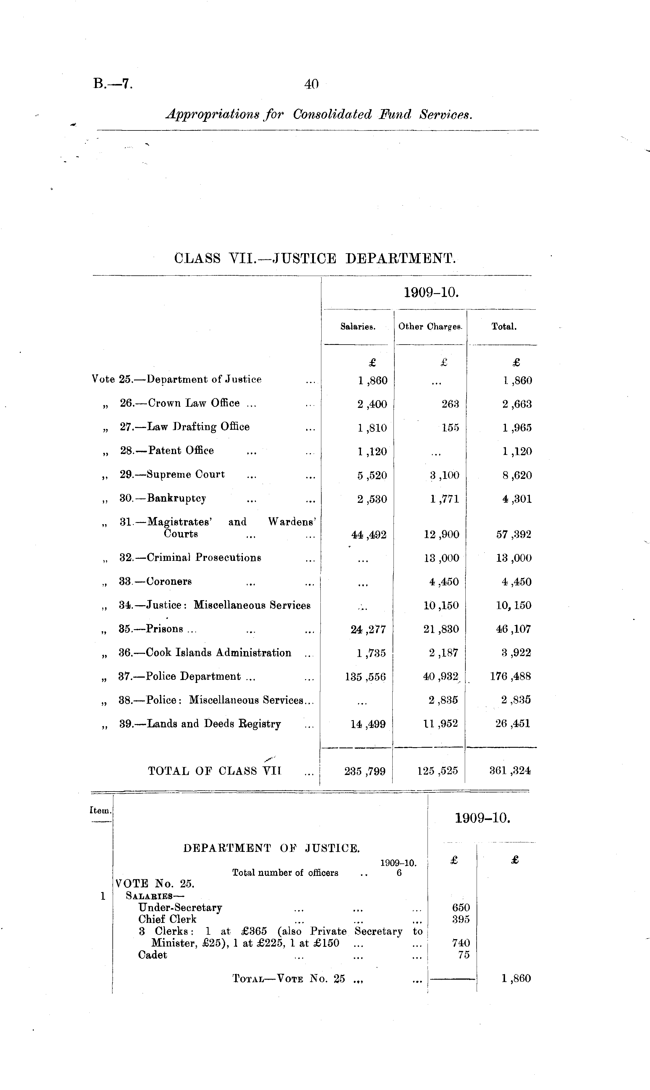 1909-10. Salaries. Other Charges. Total. £ £ £ Vote 25. —Department of Justice 1,860 1 ,860 „ 26.—Crown Law Office ... 2,400 263 2,663 „ 27. —Law Drafting Office 1 ,810 155 1,965 „ 28.—Patent Office 1,120 1,120 ,, 29.—Supreme Court 5,520 3 ,100 8,620 ,, 30.—Bankruptcy 2,530 1,771 4,301 „ 31. —Magistrates' and Wardens' Courts 44 ,492 12 ,900 57 ,392 „ 32.—Criminal Prosecutions 13 ,000 13 ,000 ,, 33. —Coroners 4,450 4,450 ,, 34.—Justice: Miscellaneous Services 10 ,150 10,150 „ 35.—Prisons ... 24 ,277 21,830 46 ,107 „ 36. —Cook Islands Administration 1,735 2,187 3,922 „ 37.—Police Department ... 135 ,556 40 ,932 176 ,488 „ 38. —Police: Miscellaneous Services... 2 ,835 2,835 ,, 39.—Lands and Deeds Registry 14 ,499 11 ,952 26 ,451 TOTAL OF CLASS VII 235 ,799 125 ,525 361,324 Item. 1909-10. DEPARTMENT OF JUSTICE. £ £ 1909-10. Total number of officers .. 6 VOTE No. 25. Salaries — Under-Secretary Chief Clerk 3 Clerks: 1 at £365 (also Private Secretary to Minister, £25), 1 at £225, 1 at £150 ... Cadet 650 395 740 75 Total —Vote No. 25 ... 1.86( 1,860