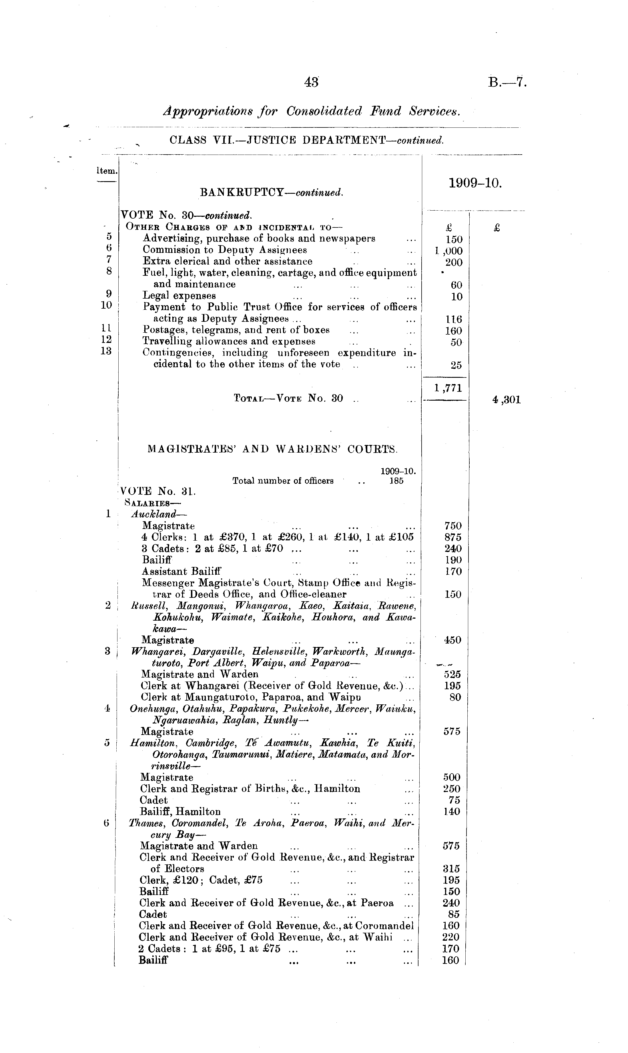 tern. BANKRUPTCY— continued. 1909-10. 5 6 7 8 9 10 5 6 7 8 9 .0 .1 2 3 VOTE No. 30— continued. Other Charges op and incidental to — Advertising, purchase of books and newspapers Commission to Deputy Assignees Extra clerical and other assistance Fuel, light, water, cleaning, cartage, and office equipment and maintenance Legal expenses Payment to Public Trust Office for services of officers acting as Deputy Assignees ... Postages, telegrams, and rent of boxes Travelling allowances and expenses Contingencies, including unforeseen expenditure incidental to the other items of the vote £ £ 150 1,000 200 60 10 ll 12 13 116 160 50 25 Total— Vote No. 30 .. 1,771 4.3( 4,30 MAGISTRATES' AND WARDENS' COURTS. 1909-10. Total number of officers .. 185 2 1 1 2 ! j 3 ! 4 5 6 VOTE No. 31. Salaries — Auckland — Magistrate ... ... 4 Clerks: 1 at £370, 1 at £260, 1 at £140, 1 at £105 3 Cadets : 2 at £85, 1 at £70 ... Bailiff Assistant Bailiff Messenger Magistrate's Court, Stamp Office and Registrar of Deeds Office, and Office-cleaner Russell, Mangonui, Whangaroa, Kaeo, Kaitaia, Rawene, Kohukohu, Waimate, Kaikohe, Houhora, and Kawakawa — Magistrate Whangarei, Dargaville, Helensville, Warkworth, Maungaturoto, Port Albert, Waipu, and Paparoa — Magistrate and Warden Clerk at Whangarei (Receiver of Gold Revenue, &c.)... Clerk at Maungaturoto, Paparoa, and Waipu Onehunga, Otahuhu, Papakura, Pukekohe, Mercer, Waiuku, Ngaruawahia, Raglan, Huntly— Magistrate Hamilton, Cambridge, Te Awamutu, Kawhia, Te Kuiti, Otorohanga, Taumarunui, Matiere, Matamata, and Morrinsville — Magistrate Clerk and Registrar of Births, &c, Hamilton Cadet Bailiff, Hamilton Thames, Coromandel, Te Aroha, Paeroa, Waihi, and Mercury Bay— Magistrate and Warden Clerk and Receiver of Gold Revenue, <&c, and Registrar of Electors Clerk, £120; Cadet, £75 Bailiff Clerk and Receiver of Gold Revenue, &c, at Paeroa ... Cadet Clerk and Receiver of Gold Revenue, &c, at Coromandel Clerk and Receiver of Gold Revenue, &c, at Waihi ... 2 Cadets : 1 at £95, 1 at £75 ... x_ _i • a* 750 875 240 190 170 150 450 525 195 80 575 5 500 250 75 140 6 575 315 195 150 240 85 160 220 170