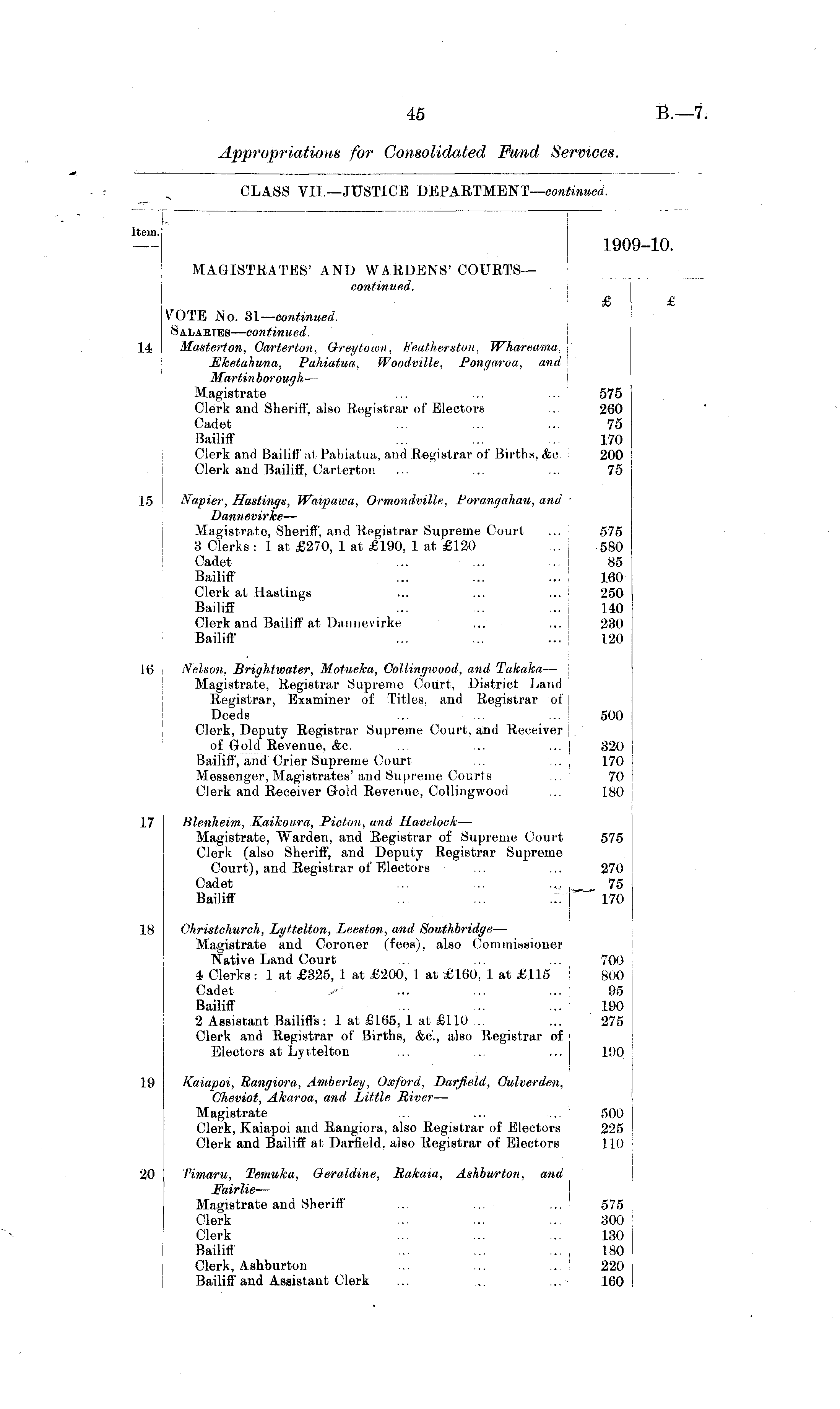 Item. tern. 1909-10. MAGISTRATES' AND WARDENS'COURTS— continued. 14 i 14 £ £ VOTE No. 31— continued. Salaries— continued. Masterton, Carterton, Greytown, Featherston, Whareama, i Eketahuna, Pahiatua, Woodville, Pongaroa, and Martin borough — Magistrate ... ... ... 575 Clerk and Sheriff, also Registrar of Electors ... ; 260 Cadet ... ... ... I 75 Bailiff ... ... ... 170 Clerk and Bailiff at Pahiatua, and Registrar of Births, &o. 200 Clerk and Bailiff, Carterton ... ... ... 75 15 Napier, Hastings, Waipawa, Ormondville, Porangahau, and • Dannevirke — Magistrate, Sheriff, and Registrar Supreme Court ... 575 3 Clerks : 1 at £270, 1 at £190, 1 at £120 ... 580 Cadet ... ... ... j 85 Bailiff ... ... ... 160 Clerk at Hastings ... ... ... 250 Bailiff ... ... ... , 140 Clerk and Bailiff at Dannevirke ... ... | 230 Bailiff ... ... ... ! 120 16 Nelson, Brightwater, Motueka, Collingwood, and Takaka — Magistrate, Registrar Supreme Court, District Land Registrar, Examiner of Titles, and Registrar of Deeds ... ... ... 500 Clerk, Deputy Registrar Supreme Court, and Receiver of Gold Revenue, Ac. ... ... ... 320 Bailiff, and Crier Supreme Court ... ... , 170 Messenger, Magistrates'and Supreme Courts ... 70 Clerk and Receiver Gold Revenue, Collingwood ... 180 17 17 Blenheim, Kaikoura, Picton, and Havelock — Magistrate, Warden, and Registrar of Supreme Court 575 Clerk (also Sheriff, and Deputy Registrar Supreme Court), and Registrar of Electors ... ... : 270 Cadet ... ... ... 75 Bailiff ... ... ... " 170 18 18 Christchureh, Lyttelton, Leeston, and Southbridge — Magistrate and Coroner (fees), also Commissioner Native Land Court ... ... ... 700 4 Clerks: 1 at £325, 1 at £200, 1 at £160, 1 at £115 800 Cadet ... ... ... 95 Bailiff ... ... ... 190 2 Assistant Bailiffs : 1 at £165, 1 at £110 ... ... 275 Clerk and Registrar of Births, &c'., also Registrar of Electors at Lyttelton ... ... ... | 190 19 19 Kaiapoi, Rangiora, Amberley, Oxford, Darfield, Culverden, Cheviot, Akaroa, and Little Rivei — Magistrate ... ... ... 500 j Clerk, Kaiapoi and Rangiora, also Registrar of Electors 225 Clerk and Bailiff at Darfield, also Registrar of Electors 110 20 20 Timaru, Temuka, Geraldine, Rakaia, Ashburton, and Fairlie— Magistrate and Sheriff ... ... ... 575 Clerk ... ... ... 300 Clerk ... ... ... 130 Bailiff :;. ... ... 180 Clerk, Ashburton ... ... ... 220 Bailiff and Assistant Clerk ... ... ... 160