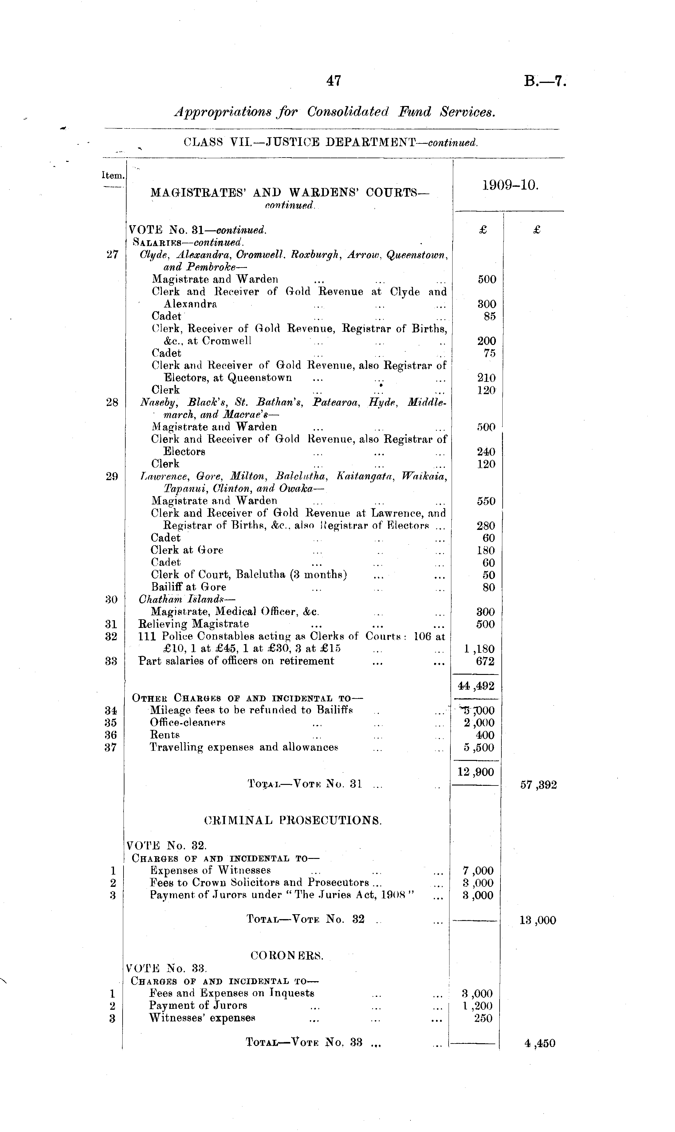 Item. MAGISTRATES' AND WARDENS' COURTS— continued. 1909-10. 27 28 VOTE No. 31— continued. Salaries — continued. Clyde, Alexandra, Cromwell. Roxburgh, Arrow, Queenstown, and Pembroke — Magistrate and Warden Clerk and Receiver of Gold Revenue at Clyde and Alexandra Cadet Clerk, Receiver of Gold Revenue, Registrar of Births, Ac, at Cromwell Cadet Clerk and Receiver of Gold Revenue, also Registrar of Electors, at Queenstown Clerk Naseby, Black's, St. Bathan's, Patearoa, Hyde, Middlemarch, and Macrae's — Magistrate and Warden Clerk and Receiver of Gold Revenue, also Registrar of Electors Clerk Lawrence, Gore, Milton, Bdlclutha, Kaifangata, Waikaia, Tapanui, Clinton, and Owaka — Magistrate and Warden Clerk and Receiver of Gold Revenue at Lawrence, and Registrar of Births, Ac. also Registrar of Electors ... Cadet Clerk at G ore Cadet, Clerk of Court, Balclutha (3 months) Bailiff at Gore Chatham Islands — Magistrate, Medical Officer, Ac. Relieving Magistrate 111 Police Constables acting as Clerks of Courts : 106 at £10, 1 at, £45, 1 at £30, 3 at £15 Part salaries of officers on retirement £ 500 300 85 200 75 210 120 500 240 120 29 550 280 60 180 00 50 80 30 300 500 31 32 33 1,180 672 Other Charges of and incidental to — Mileage fees to be refunded to Bailiffs Office-cleaners Rents Travelling expenses and allowances 44 ,492 34 35 36 37 5 ,noo 2 ,000 400 5,500 Total—Vote No. 31 ... 12 ,900 CRIMINAL PROSECUTIONS. 57 ,392 1 2 3 VOTE No. 32. Charges op and incidental to — Expenses of Witnesses Fees to Crown Solicitors and Prosecutors ... Payment of Jurors under " The Juries Act, 1908 " 7,000 3 ,000 3 ,000 13 ,000 Total—Vote No. 32 .. CORONERS. 1 2 3 VOTE No. 33. Charges of and incidental to — Fees and Expenses on Inquests Payment of Jurors Witnesses' expenses 3,000 1 ,200 250 4,450 Total—Vote No. 33 ...