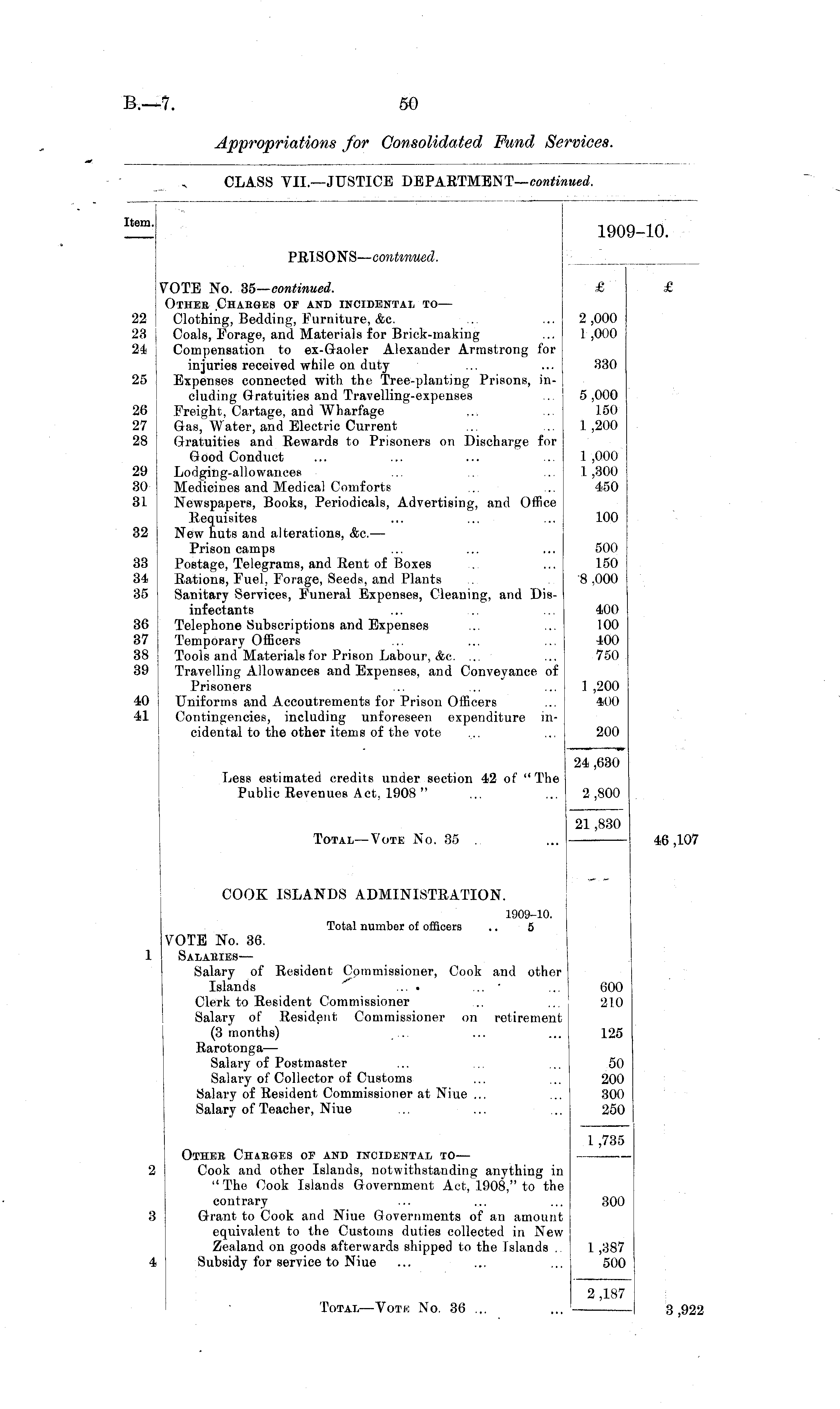 item. PRISONS— continued. 190! i-10. 22 23 24 VOTE No. 35— continued. Othee Chaeges of and incidental to — Clothing, Bedding, Furniture, Ac. Coals, Forage, and Materials for Brick-making Compensation to ex-Gaoler Alexander Armstrong for injuries received while on duty Expenses connected with the Tree-planting Prisons, including Gratuities and Travelling-expenses Freight, Cartage, and Wharfage Gas, Water, and Electric Current Gratuities and Rewards to Prisoners on Discharge for Good Conduct Lodging-allowances Medicines and Medical Comforts Newspapers, Books, Periodicals, Advertising, and Office Requisites New huts and alterations, Ac. — Prison camps Postage, Telegrams, and Rent of Boxes Rations, Fuel, Forage, Seeds, and Plants Sanitary Services, Funeral Expenses, Cleaning, and Disinfectants Telephone Subscriptions and Expenses Temporary Officers Tools and Materials for Prison Labour, Ac. ... Travelling Allowances and Expenses, and Conveyance of Prisoners Uniforms and Accoutrements for Prison Officers Contingencies, including unforeseen expenditure incidental to the other items of the vote £ 2,000 1 ,000 £ 25 330 26 27 28 5,000 150 1 ,200 29 80 31 1 ,000 1 ,300 450 32 100 33 34 35 500 150 8 ,000 36 37 38 39 400 100 400 750 40 41 1 ,200 400 200 Less estimated credits under section 42 of "The Public Revenues Act, 1908 " 24 ,630 Total —Vote No. 35 2,800 21,830 46 ,107 COOK ISLANDS ADMINISTRATION. 1909-10. Total number of officers .. 5 VOTE No. 36. Salaeies — Salary of Resident Commissioner, Cook and other Islands .... ... • Clerk to Resident Commissioner Salary of Resident Commissioner on retirement (3 months) ... Rarotonga— Salary of Postmaster Salary of Collector of Customs Salary of Resident Commissioner at Niue ... Salary of Teacher, Niue 600 210 125 50 200 300 250 Othee Chaeges op and incidental to — Cook and other Islands, notwithstanding anything in " The Cook Islands Government Act, 1908," to the contrary Grant to Cook and Niue Governments of an amount equivalent to the Customs duties collected in New Zealand on goods afterwards shipped to the Islands . Subsidy for service to Niue 1,735 300 1,387 500 3 ,922 Total—Vote No. 36 ... 2 ,187