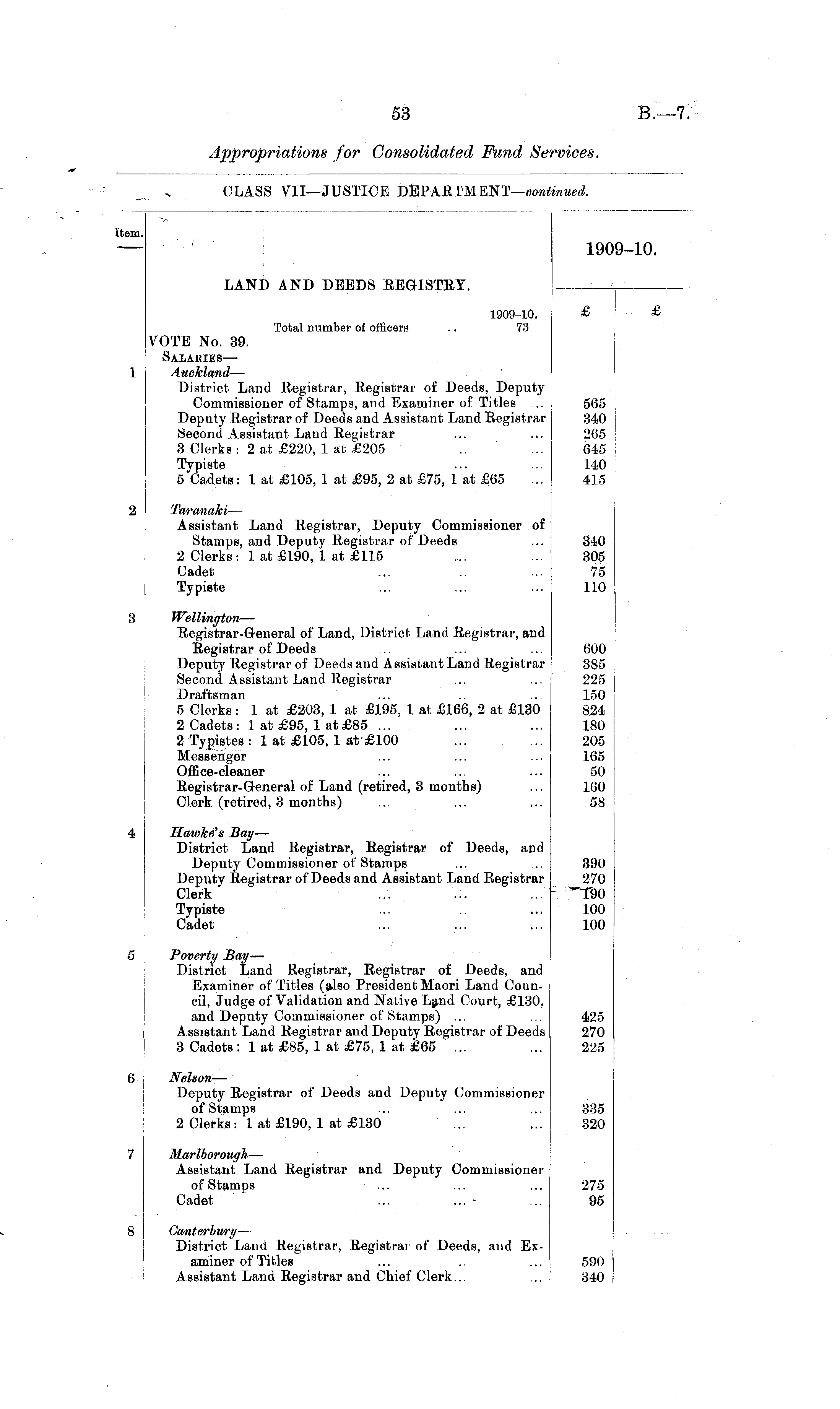 Item. 1909-10. LAND AND DEEDS REGISTRY. 1909-10. Total number of officers .. 73 £ £ VOTE No. 39. Salaeies — Auckland — District Land Registrar, Registrar of Deeds, Deputy Commissioner of Stamps, and Examiner of Titles ... Deputy Registrar of Deeds and Assistant Land Registrar Second Assistant Land Registrar 3 Clerks : 2 at, £220, 1 at £205 Typiste 5 Cadets: 1 at £105, 1 at £95, 2 at £75, 1 at £65 565 340 265 645 140 415 Taranaki — Assistant Land Registrar, Deputy Commissioner of Stamps, and Deputy Registrar of Deeds 2 Clerks: 1 at £190, 1 at £115 Cadet Typiste 340 305 75 110 Wellington — Registrar-General of Land, District Land Registrar, and Registrar of Deeds Deputy Registrar of Deeds and Assistant Land Registrar Second Assistant Land Registrar Draftsman 5 Clerks : 1 at £203, 1 at £195, 1 at £166, 2 at £130 2 Cadets : 1 at £95, 1 at £85 ... 2 Typistes : 1 at £105, 1 at £100 Messenger Office-cleaner Registrar-General of Land (retired, 3 months) Clerk (retired, 3 months) 600 385 225 150 824 180 205 165 50 160 58 Hawke's Bay — District Land Registrar, Registrar of Deeds, and Deputy Commissioner of Stamps Deputy Registrar of Deeds and Assistant Land Registrar Clerk Typiste ... .. ... Cadet 390 270 190 100 100 Poverty Bay — District Land Registrar, Registrar of Deeds, and Examiner of Titles (also President Maori Land Council, Judge of Validation and Native Land Court, £130. and Deputy Commissioner of Stamps) ... Assistant Land Registrar and Deputy Registrar of Deeds 3 Cadets : 1 at £85, 1 at £75, 1 at £65 ... 425 270 225 6 Nelson — Deputy Registrar of Deeds and Deputy Commissioner of Stamps 2 Clerks: 1 at £190, 1 at £130 335 320 Marlborough — Assistant Land Registrar and Deputy Commissioner of Stamps Cadet ... ... 275 95 Canterbury — District Land Registrar, Registrar of Deeds, and Examiner of Titles Assistant Land Registrar and Chief Clerk... 590 340