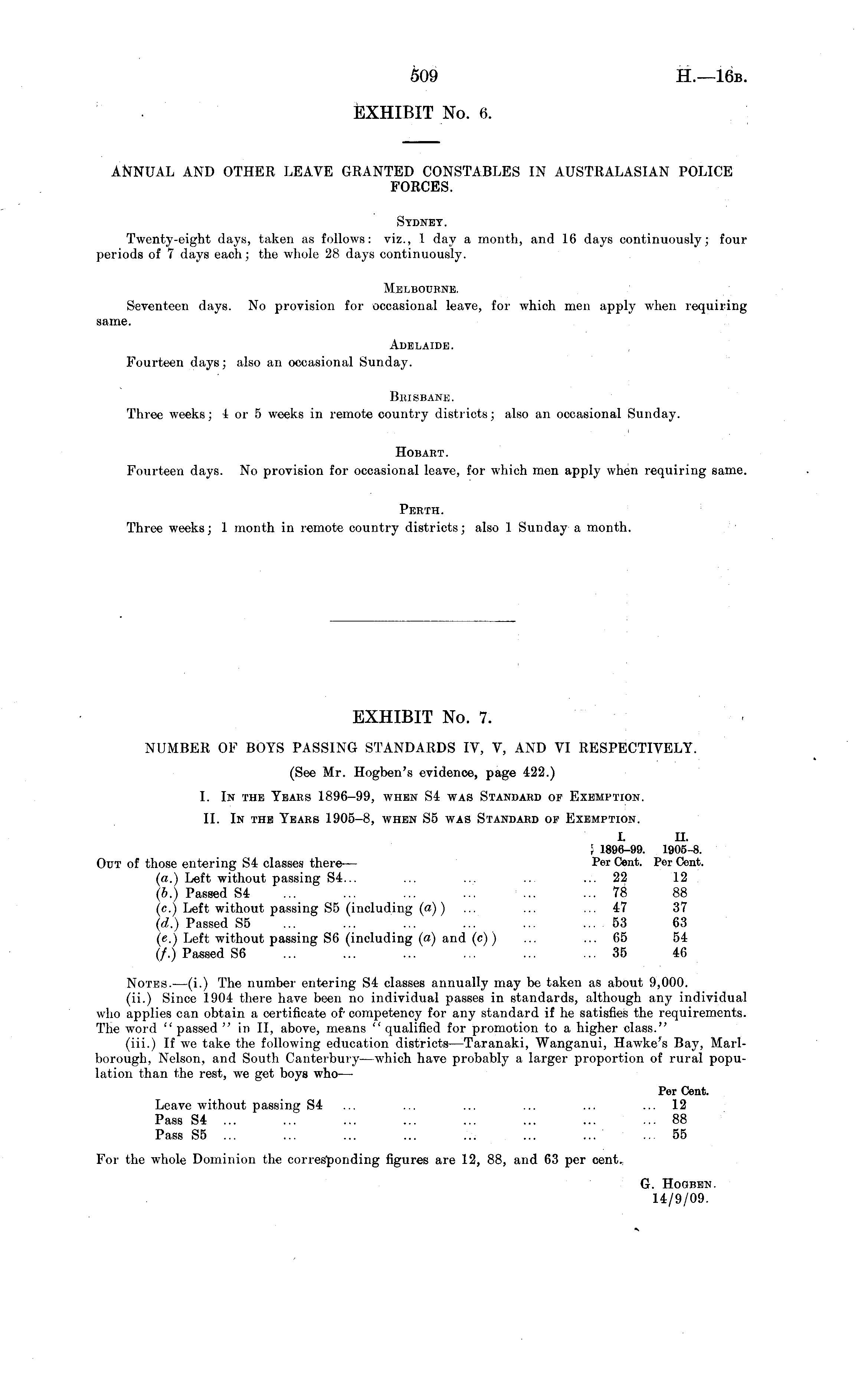 NUMBER OF BOYS PASSING STANDARDS IV, V, AND VI RESPECTIVELY. (See Mr. Hogben's evidence, page 422.) I. In the Years 1896-99, when S4 was Standard of Exemption. 11. In the Years 1905-8, when S5 was Standard of Exemption. I. 11. ! 1896-99. 1905-8. Out of those entering S4 classes there — Per Cent. Per Cent. (a.) Left without passing 54... ... ... .. ... 22 12 (b.) Passed S4 ... ... ... ... ... ... 78 88 (c.) Left without passing S5 (including (a)) ... ... ... 47 37 (d.) Passed S5 ... ... ... ... ... ... 53 63 (c.) Left without passing S6 (including (a) and (c)) ... ... 65 54 (/.) Passed S6 ... ... ... ... ... ... 35 46 Notes.—(i.) The number entering S4 classes annually may te taken as about 9,000. (ii.) Since 1904 there have teen no individual passes in standards, although any individual who applies can obtain a certificate of- competency for any standard if he satisfies the requirements. The word " passed " in 11, above, means " qualified for promotion to a higher class." (iii.) If we take the following education districts—Taranaki, Wanganui, Hawke's Bay, Marlborough, Nelson, and South Canterbury —which have probably a larger proportion of rural population than the rest, we get boys who — Per Cent. Leave without passing S4 ... ... ... ... ... ... 12 Pass S4 ... ... ... ... ... ... ... ... 88 Pass S5 ... ... ... ... ... ... ... ... 55 For the whole Dominion the corresponding figures are 12, 88, and 63 per cent. G. Hogben. 14/9/09.