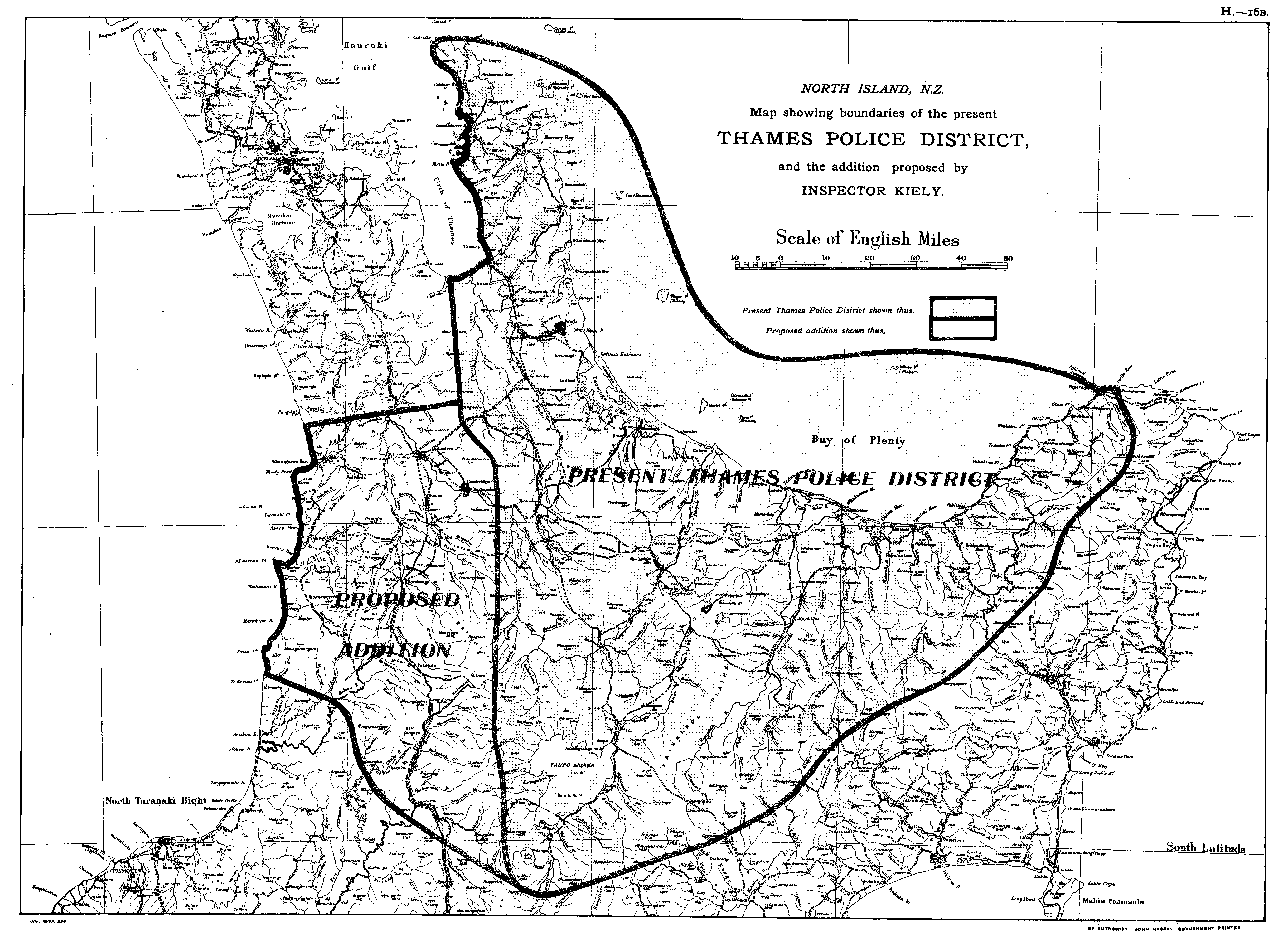 NORTH ISLAND, N.Z. Map showing boundaries of the present THAMES POLICE DISTRICT, and the addition proposed by INSPECTOR KIELY.