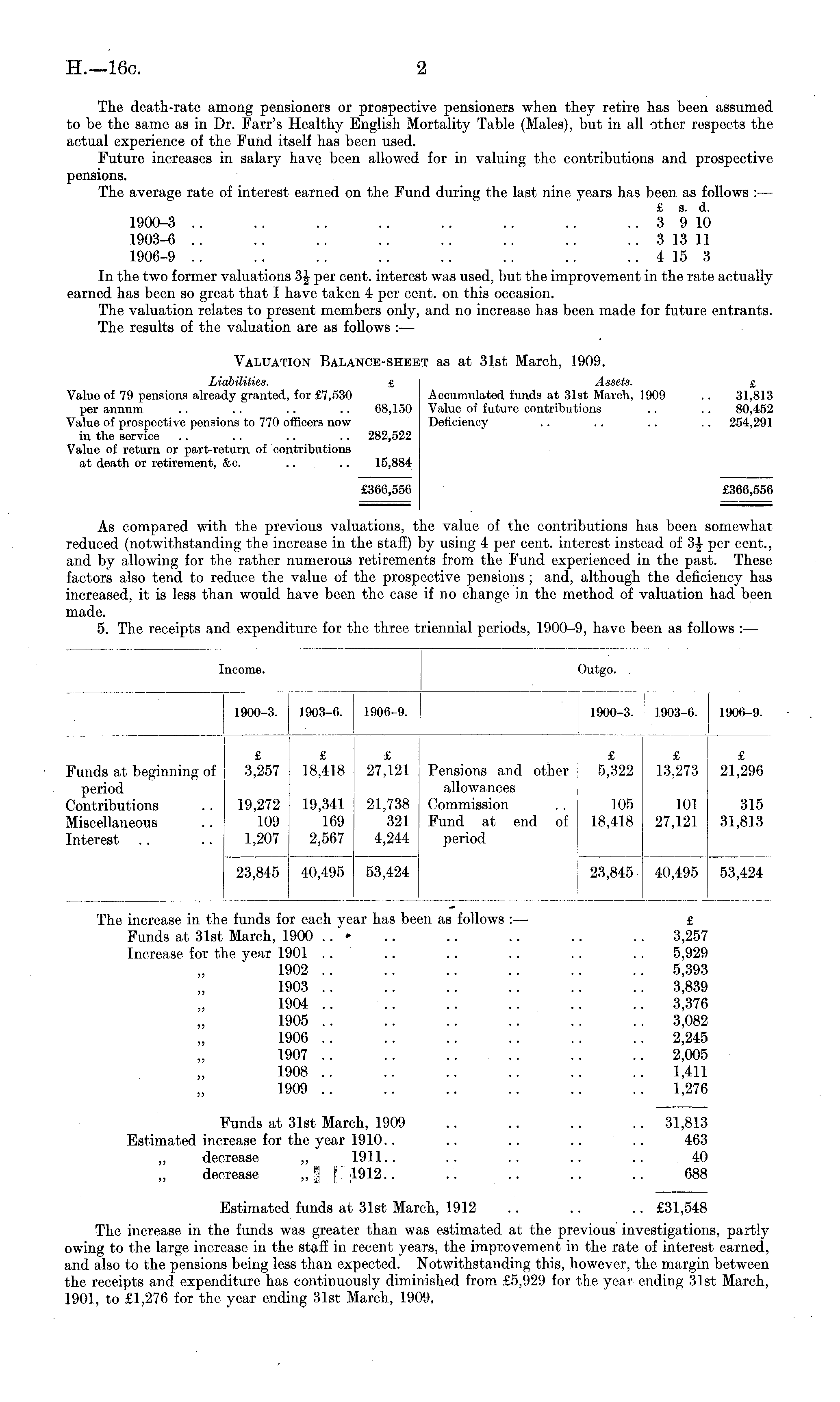 The death-rate among pensioners or prospective pensioners when they retire has been assumed to be the same as in Dr. Farr's Healthy English Mortality Table (Males), but in all other respects the actual experience of the Fund itself has been used. Future increases in salary have been allowed for in valuing the contributions and prospective pensions. The average rate of interest earned on the Fund during the last nine years has been as follows : — £ s. d. 1900-3 .. .. .. .. .. .. .. .. 3 9 10 1903-6 .. .. .. .. .. .. .. .. 313 11 1906-9 .. .. .. .. .. .. .. .. 415 3 In the two former valuations 3| per cent, interest was used, but the improvement in the rate actually earned has been so great that I have taken 4 per cent, on this occasion. The valuation relates to present members only, and no increase has been made for future entrants. The results of the valuation are as follows :— Valuation Balance-sheet as at 31st March, 1909. Liabilities. £ Assets. £ Value of 79 pensions already granted, for £7,530 Accumulated funds at 31st March, 1909 .. 31,813 per annum .. .. .. .. 68,150 Value of future contributions .. .. 80,452 Value of prospective pensions to 770 officers now Deficiency .. .. .. .. 254,291 in the service .. .. .. .. 282,522 Value of return or part-return of contributions at death or retirement, &c. .. .. 15,884 £366,556 £366,556 As compared with the previous valuations, the value of the contributions has been somewhat reduced (notwithstanding the increase in the staff) by using 4 per cent, interest instead of 3Jr per cent., and by allowing for the rather numerous retirements from the Fund experienced in the past. These factors also tend to reduce the value of the prospective pensions ; and, although the deficiency has increased, it is less than would have been the case if no change in the method of valuation had been made. 5. The receipts and expenditure for the three triennial periods, 1900-9, have been as follows : —