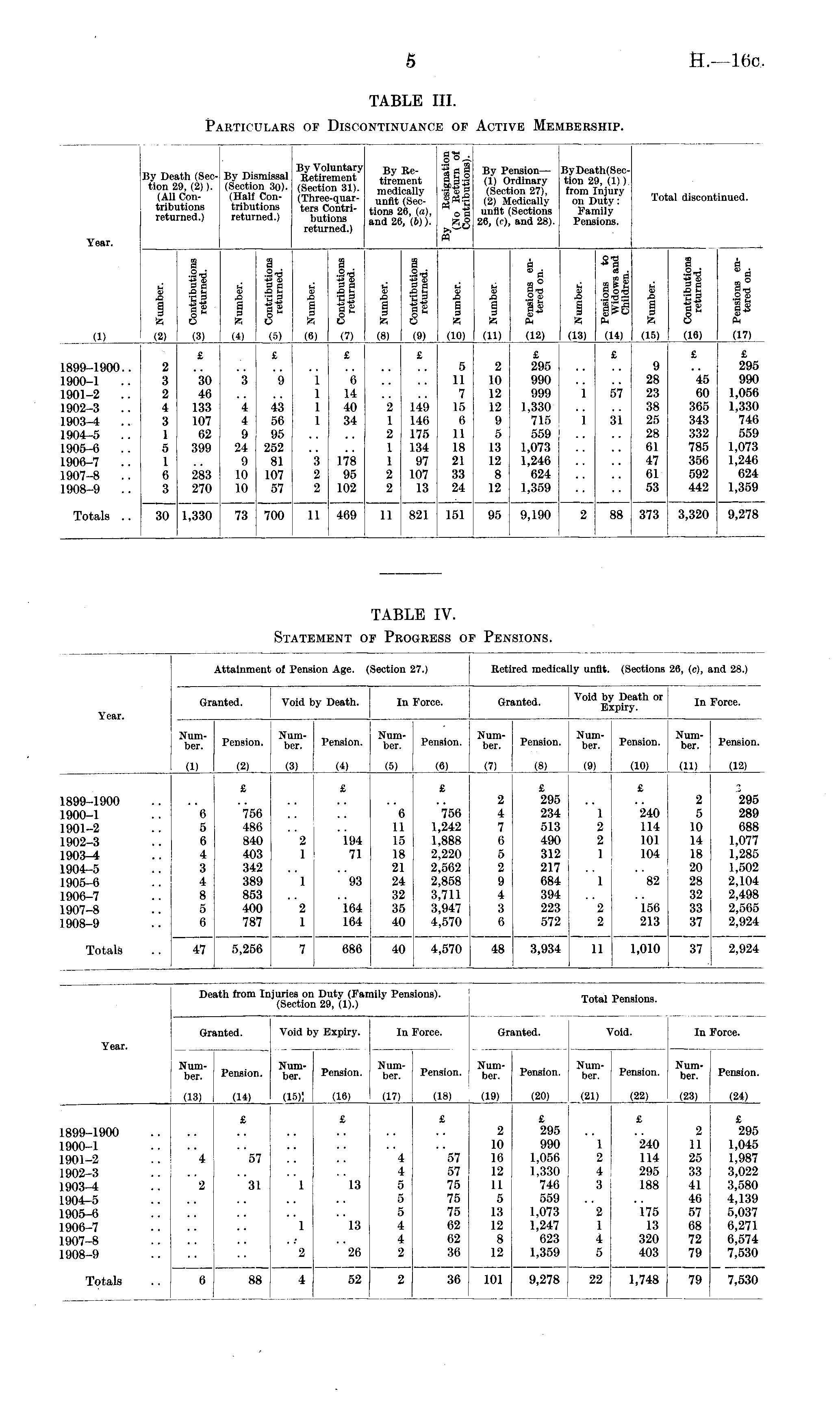 iiy Death (Section 29, (2)). (All Contributions returned.) By Dis (Sectio (Half tribui retain By Voluntary imissal Retirement >« :! <>). (Section 31). Con- (Three-quar-tions ; ters Contrined.) buttons returned.) By tircr medi unfit tions i and 2« Beliont ically (Sec26, (a), 5, (ft) )• O fl By P< (1) O (Sect (2) M unfit ( 26, (<■), ension— Irdinary ;ion 27), [edically (Sections , and 28). ByDeat tion 29 from li ■ on Dl Fam i Pensi ,th(Sec9, (D) Injury )uty: nily lions. Total discontinued. Year. I L v (3) La J (5) i i I v. (8) 1 10) I s S3 §1 I" (12) *1111 Cm Iμ fa I" (17) (1) (2) (4) (7) (11) (13) (1*) (15) ii*i £ £ £ £ £ 295 990 999 1,330 715 559 1,073 1,246 624 1,359 £ £ £ 295 990 1,056 1,330 746 559 1,073 1,246 624 1,359 1899-1900.. 1900-1 .. 1901-2 .. 1902-3 1903-4 .. 1904-5 1905-6 .. 1906-7 1907-8 .. 1908-9 .. 2 3 2 4 3 1 5 1 6 3 30 46 133 107 62 399 3 4 4 9 24 9 10 10 9 43 56 95 252 I 81 107 57 1 1 1 1 6 14 40 34 2 1 2 1 1 2 2 149 146 175 134 97 107 13 5 11 7 15 6 11 18 21 33 24 2 10 12 12 9 5 13 12 8 12 i 'i 57 3i 9 28 23 38 25 28 61 47 61 53 45 60 365 343 332 785 356 592 442 283 270 3 2 2 178 95 102 Totals .. 30 1,330 73 700 11 469 11 821 151 95 9,190 2 88 373 3,320 9,278